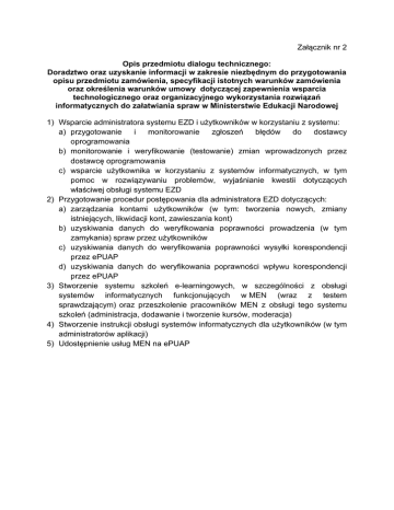 Załącznik nr 2 Opis przedmiotu dialogu technicznego: Doradztwo oraz uzyskanie informacji w zakresie niezbędnym do przygotowania opisu przedmiotu zamówienia, specyfikacji istotnych warunków zamówienia oraz określenia warunków umowy dotyczącej zapewnienia wsparcia technologicznego oraz organizacyjnego wykorzystania rozwiązań informatycznych do załatwiania spraw w Ministerstwie Edukacji Narodowej 1) Wsparcie administratora systemu EZD i użytkowników w korzystaniu z systemu: a) przygotowanie i monitorowanie zgłoszeń błędów do dostawcy oprogramowania b) monitorowanie i weryfikowanie (testowanie) zmian wprowadzonych przez dostawcę oprogramowania c) wsparcie użytkownika w korzystaniu z systemów informatycznych, w tym pomoc w rozwiązywaniu problemów, wyjaśnianie kwestii dotyczących właściwej obsługi systemu EZD 2) Przygotowanie procedur postępowania dla administratora EZD dotyczących: a) zarządzania kontami użytkowników (w tym: tworzenia nowych, zmiany istniejących, likwidacji kont, zawieszania kont) b) uzyskiwania danych do weryfikowania poprawności prowadzenia (w tym zamykania) spraw przez użytkowników c) uzyskiwania danych do weryfikowania poprawności wysyłki korespondencji przez ePUAP d) uzyskiwania danych do weryfikowania poprawności wpływu korespondencji przez ePUAP 3) Stworzenie systemu szkoleń e-learningowych, w szczególności z obsługi systemów informatycznych funkcjonujących w MEN (wraz z testem sprawdzającym) oraz przeszkolenie pracowników MEN z obsługi tego systemu szkoleń (administracja, dodawanie i tworzenie kursów, moderacja) 4) Stworzenie instrukcji obsługi systemów informatycznych dla użytkowników (w tym administratorów aplikacji) 5) Udostępnienie usług MEN na ePUAP