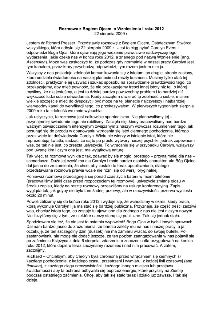 Rozmowa z Bogiem Ojcem o Wzniesieniu i roku 2012 22 sierpnia 2009 r. Jestem dr Richard Presser. Przedstawię rozmowę z Bogiem Ojcem, Ostatecznym Stwórcą wszystkiego, która odbyła się 22 sierpnia 2009 r. Jest to ciąg pytań Carolyn Evers i odpowiedzi Boga Ojca, które ujawniają jego widzenie prawdziwie nadzwyczajnego wydarzenia, jakie czeka nas w końcu roku 2012, a znanego pod nazwą Wzniesienie (ang. Ascension). Może was zaskoczyć to, że podczas gdy normalnie w naszej pracy Carolyn jest tym kanałem, przez który przychodzą odpowiedzi, tym razem jestem nim ja. Wszyscy z nas posiadają zdolność komunikowania się z istotami po drugiej stronie zasłony, która oddziela świadomość na naszej planecie od reszty kosmosu. Musimy tylko ufać tej zdolności, praktycznie jej używać i szukać sposobu na sprawdzenie prawdziwości tego, co przekazujemy, aby mieć pewność, że nie przekazujemy treści innej istoty niż tej, o której myślimy, że nią jesteśmy, a jest to dzisiaj bardzo powszechny problem i to bardziej niż większość ludzi sobie uświadamia. Kiedy zacząłem otwierać tę zdolność u siebie, miałem wielkie szczęście mieć do dyspozycji być może na tej planecie najczystszy i najbardziej wiarygodny kanał do weryfikacji tego, co przekazywałem. W pierwszych tygodniach sierpnia 2009 roku ta zdolność we mnie wybuchła. Jak usłyszycie, ta rozmowa jest całkowicie spontaniczna. Nie planowaliśmy jej – przynajmniej świadomie tego nie robiliśmy. Zaczęła się, kiedy pracowaliśmy nad bardzo ważnym oświadczeniem intencyjnym związanym z naszym wówczas rozumieniem tego, jak posunąć się do przodu w opanowaniu wtrącania się istot ciemnego pochodzenia, którego przez wiele lat doświadczała Carolyn. Wielu nie wierzy w istnienie istot, które nie reprezentują światła, sadząc, że są to po prostu wytwory naszej psychiki, jednak zapewniam was, że tak nie jest, co zresztą usłyszycie. To wtrącanie się w przypadku Carolyn, wziąwszy pod uwagę kim i czym ona jest, ma wyjątkową naturę. Tak więc, ta rozmowa wynikła z tak, zdawać by się mogło, prostego – przynajmniej dla nas – scenariusza. Duża jej część ma dla Carolyn i mnie bardzo osobisty charakter, ale Bóg Ojciec dał jasno do zrozumienia, że chce, aby zostało to teraz upublicznione, dlatego przedstawiana rozmowa prawie wcale nie różni się od wersji oryginalnej. Ponieważ rozmowa przeciągnęła się ponad czas życia baterii w moim telefonie (pracowaliśmy jakiś czas przed rozpoczęciem tej rozmowy), usłyszycie zmianę głosu w środku zapisu, kiedy na resztę rozmowy przeszliśmy na usługę konferencyjną. Zapis wygląda tak, jak gdyby nie było tam żadnej przerwy, ale w rzeczywistości przerwa wyniosła około 20 minut. Powoli zbliżamy się do końca roku 2012 i wydaje się, że wchodzimy w okres, kiedy praca, którą wykonuje Carolyn i ja ma stać się bardziej publiczna. Przyznaję, że część treści zadziwi was, chociaż istota tego, co zostaje tu ujawnione dla żadnego z nas nie jest niczym nowym. Nie liczyliśmy się z tym, że niektóre rzeczy staną się publiczne. Tak się jednak stało. Spodziewam się też, że nie jest to ostatnia wypowiedź Boga Ojca w tych i innych sprawach. Dał nam bardzo jasno do zrozumienia, że bardzo zależy mu na nas i naszej pracy, a ja oczekuję, że ten szczególny dżin (duszek) nie ma zamiaru wracać do swojej butelki. Po zastanowieniu nie mogę nie dodać jeszcze, że ten poziom zaangażowania w nas pojawił się po zaćmieniu Księżyca z dnia 6 sierpnia, zdarzeniu o znaczeniu dla przygotowań na koniec roku 2012, które dopiero teraz zaczynamy rozumieć i nad nim pracować. A zatem, zacznijmy. Richard – Chciałbym, aby Carolyn była chroniona przed wtrącaniem się ciemnych sił każdego pochodzenia, z każdego czasu, przestrzeni i wymiaru, z każdej linii czasowej (ang. timeline), z każdego ciągu rzeczywistości i każdego innego miejsca lub przejawu świadomości i aby ta ochrona odbywała się poprzez energie, które przyszły na Ziemię podczas ostatniego zaćmienia. Chcę, aby tak się stało teraz i działo już zawsze. I tak się dzieje. Carolyn – A ja chciałabym, abym mogła przyjąć ochronę Richarda tak jak gdybym była ptakiem, którego trzyma pod swoim skrzydłem a ja jestem błogosławiona będąc pod jego opieką, przyjmując ją, zatrzymując ją i zachowując na własność, teraz i na zawsze. I tak się dzieje. Usłyszałem: „Słyszałem i tak zrobię.” Nie jestem pewien, ale myślę, że kosmos jest żywą istotą, lecz my jej nie rozumiemy, tak jak na ogól nie rozumiemy, że planeta jest czującą istotą i myślę, że jest to prawda także w stosunku do kosmosu, chociaż tego nie rozumiemy. Ponieważ to usłyszałem, a nie czułem, że jest to Bóg, podejrzewam, że Bóg chce coś o tym powiedzieć. Richard – Czy on coś do ciebie mówi? Carolyn – Nie. Richard – Mówi do mnie. Mówi: to co usłyszałeś to rzeczywiście był kosmos potwierdzający prawdę, która została podana, prawdę wyrażoną w twojej rzeczywistości przez te energie podczas ostatniego zaćmienia. Że są to energie przemiany, przemiany, która zaczyna się w twojej rzeczywistości i stąd rozpływa się na cały kosmos, zaś wy, moi drodzy przyjaciele, jesteście nosicielami mojego przesłania, tego przesłania o wyzwoleniu dla ludzkości. Gdy będziecie szli, będziecie zbierać tych, którzy przybyli, aby iść z wami, a wy będziecie ich uczyć, a oni zrozumieją i ponownie obudzą się na swoje mistrzostwo i będą czynić tak jak wy. Tak więc, będzie to rosło i rozszerzało się, i stanie się tak, jakby na całej planecie zapaliły się światła. Jedno tu, jedno tam, jedno gdzie indziej i stopniowo szybkość wzrośnie, aż światła pojawią się wszędzie na całej planecie, gdy ludzkość uświadomi sobie co to za czasy i co się dzieje i, jak powiedziałem, wy dwoje zaniesiecie to przesłani
