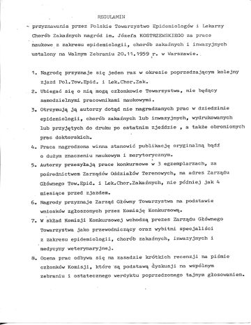 REGULAMIN * przyznawania przez Polskie Towarzystwo Epidemlologow i Lekarzy Chorob Zakaznych nagrod ira. Jozefa KOSTRZEWSKIEGO za prace naukowe z zakresu epidemiologii, chorob zakaznych I inwazyjnych ustalony na Walnym Zebraniu 20.11.1959 r* w Warszawie. . \. 1. Nagrod^ przyznaje si^ jeden raz w okresie poprzedzajq.cym kolejny zjazd Pol.Tow.Epid. i Lek.Chor.Zak. 2* Ubiegac si^ o niq, mogq. czlonkowie Towarzystwaf nie b^dq.cy samodzielnymi pracownikami naukowymi. 3^ Otrzymujq. jq. autorzy dotqd nie nagradzanych prac w dziedzinie epidemiologii, chorob zakaznych lub inwazyjnych, wydrukowanych lub przyj^tych do druku po ostatnim zjezdzie , a takze obronionych prac doktorskich. 4. Praca nagrodzona winna stanowic publikacj^ oryginalnq. bqdz o duzym znaczeniu naukowym i merytorycznym. 5* Autorzy przesylaj^ prace konkursov/e w 3 egzeinplarzach, za posrednictwem Zarz^dow Oddzialow Terenowych, na adres Zarz^du Gl6\vnego Tow.Epid. i Lek^Chor*Zakaznych, nie pozniej jak 4 miesic^ce przed zjazdem. 6. Nagrody przyznaje Zarzq.d Glowny Towarzystwa na podstawie wnioskow zgloszonych przez Komisj^ Konkursowq.. 7« ¥ sklad Komisji Konkursowej wchodzq^ prezes Zarzq.du Glownego Towarzystwa jako przev/odniczq.cy oraz wybitni specjalisci z zakresu epidemiologii, chorob zakaznych, inwazyjnych i medycyny weterynaryjnej. 8. Ocena prac odbyvm si^ na zasadzie krotkich recenzji na pismie czlonkow Komisji, ktore "s^ podstawq dyskusji na wspolnym zebraniu i ostatecznego werdyktu poprzedzonego tajnym glosov/aniem. 'Powzi^cie uchwaly nast^puje na zasadzie zwyklej wi^kszosci glosow* W razie rownosci wyniku glasowania roztrzyga glos przewodniczq.cego. Zaprotokolowaniu podlegajq. tylko wnioski i uchwaly Komisji. Ustanawia si$ trzy nagrody pieni^zne, ktorych wysokosc kazdorazowo okresla Zarzqd Glowny, zas kolejnosc wynika z postano/ wien Komisji Konkursowej. W razie braku prac zaslugujq.cych na nagrody, moze bye ona w danej kadencji nie przyznawana» I flazwiska autorow i tytuly nagradzanych prac oglasza si^ w prasie lekarskiej. / ^r^czenie nagrod dokonuje Prezes Zarz^du Glownego na plenarnym ^ebraniu Towarzystwa w czasie Zjazd^ Pol.Tow.Epid. i Lek.Chor. i ^akaznych. jaagroda im.Jozefa Kostrzewskiego moze bye przyznana autorowi xtylko jeden raz. .plagroda ta posiada wysok^ rang^ naukowa, daj^cq jej laureatom i rzywilej brane pod uwag$ w konkursach zawodowych. odnosc: Tekst regulaminu zaktxializowano i przyj^to na V/alnym Zebraniu czlonkow PTEiLChZ w dn. 21.09. 1981 r. we Wroclawiu.