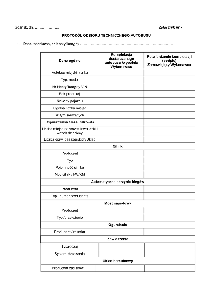 Gdańsk, dn. ………..………. Załącznik nr 7 PROTOKÓŁ ODBIORU TECHNICZNEGO AUTOBUSU 1. Dane techniczne, nr identyfikacyjny …………………………………………………………………… Kompletacja dostarczanego autobusu /wypełnia Wykonawca/ Dane ogólne Autobus miejski marka Typ, model Nr identyfikacyjny VIN Rok produkcji Nr karty pojazdu Ogólna liczba miejsc W tym siedzących Dopuszczalna Masa Całkowita Liczba miejsc na wózek inwalidzki i wózek dziecięcy Liczba drzwi pasażerskich/Układ Silnik Producent Typ Pojemność silnika Moc silnika kW/KM Automatyczna skrzynia biegów Producent Typ i numer producenta Most napędowy Producent Typ /przełożenie Ogumienie Producent / rozmiar Zawieszenie Typ/rodzaj System sterowania Układ hamulcowy Producent zacisków Potwierdzenie kompletacji (podpis) Zamawiający/Wykonawca Zbiorniki paliwa i AdBlue Zbiornik paliwa (pojemność) Zbiornik AdBlue (pojemność) Dodatkowy zbiornik ogrzewanie (jeśli występuje) Agregat grzewczy Producent/Typ Klimatyzacja Typ, wydajność Producent Kasowniki Papierowe/typ i marka* Wyposażenie Kamery/ typ i producent* Rejestrator kamer/typ** Dysk twardy/pojemność Radiotelefon/typ Auto komputer/typ** Mikrofon/typ * Infrastruktura informacyjna Tablica czołowa/typ i rozmiar Tablica boczna/typ i rozmiar Tablica tylna/typ i rozmiar Tablica informacji wewnętrznej/ typ i rozmiar Głośnik wewnętrzny/moc i typ* Pozostałe elementy zamówienia i wyposażenia Dodatkowe przyłącze do rozruchu silnika Gaśnice * Kliny pod koła Koło zapasowe Niniejszym stwierdza się zgodność dostawy z zawartą umową Nr …………………… z dnia ……………….., z obowiązującymi normami i przepisami określonymi w przedmiocie zamówienia w SIWZ. Podpisy osób dokonujących odbioru – przedstawiciele Zamawiającego – Zakład komunikacji Miejskiej w Gdańsku Sp. z o. o. 1. …………………………………………....... 2. ……………………………………………… 3. ……………………………………………… Zatwierdzający dokument ……………………………………………. * - należy podać ilość urządzeń zamontowanych w pojeździe, potwierdzających poprawność zamontowania i działania ** - wymóg podania numeru seryjnego urządzenia.