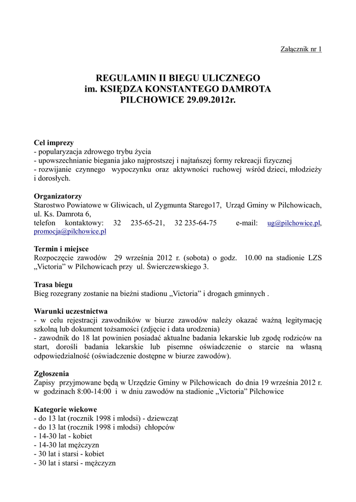 Załącznik nr 1 REGULAMIN II BIEGU ULICZNEGO im. KSIĘDZA KONSTANTEGO DAMROTA PILCHOWICE 29.09.2012r. Cel imprezy - popularyzacja zdrowego trybu życia - upowszechnianie biegania jako najprostszej i najtańszej formy rekreacji fizycznej - rozwijanie czynnego wypoczynku oraz aktywności ruchowej wśród dzieci, młodzieży i dorosłych. Organizatorzy Starostwo Powiatowe w Gliwicach, ul Zygmunta Starego17, Urząd Gminy w Pilchowicach, ul. Ks. Damrota 6, telefon kontaktowy: 32 235-65-21, 32 235-64-75 e-mail: [email protected], [email protected] Termin i miejsce Rozpoczęcie zawodów 29 września 2012 r. (sobota) o godz. 10.00 na stadionie LZS „Victoria” w Pilchowicach przy ul. Świerczewskiego 3. Trasa biegu Bieg rozegrany zostanie na bieżni stadionu „Victoria” i drogach gminnych . Warunki uczestnictwa - w celu rejestracji zawodników w biurze zawodów należy okazać ważną legitymację szkolną lub dokument tożsamości (zdjęcie i data urodzenia) - zawodnik do 18 lat powinien posiadać aktualne badania lekarskie lub zgodę rodziców na start, dorośli badania lekarskie lub pisemne oświadczenie o starcie na własną odpowiedzialność (oświadczenie dostępne w biurze zawodów). Zgłoszenia Zapisy przyjmowane będą w Urzędzie Gminy w Pilchowicach do dnia 19 września 2012 r. w godzinach 8:00-14:00 i w dniu zawodów na stadionie „Victoria” Pilchowice Kategorie wiekowe - do 13 lat (rocznik 1998 i młodsi) - dziewcząt - do 13 lat (rocznik 1998 i młodsi) chłopców - 14-30 lat - kobiet - 14-30 lat mężczyzn - 30 lat i starsi - kobiet - 30 lat i starsi - mężczyzn Program zawodów - od godz.9.30 do godz10.00 - weryfikacja i wydawanie numerów startowych - godz. 10.00-10.15 – część oficjalna - godz. 10.15- 10.30 bieg najmłodszych do lat 7 /200m/ - godz. 10.30- 10.50 bieg Vipów i samorządowców /600m/ - godz. 10.50-11.20 bieg główny /4200m/ - około godz. 11.30 - dekoracja zwycięzców Nagrody - każdy uczestnik biegu otrzymuje pamiątkowy dyplom i medal, - zwycięzcy w poszczególnych grupach wiekowych otrzymują puchary, - wśród wszystkich osób, które ukończą bieg wylosowana zostanie nagroda dodatkowa Postanowienia końcowe - bieg odbędzie się bez względu na warunki atmosferyczne, - organizator przewiduje limit 150 startujących zawodników, - organizator zapewnia szatnie, obsługę medyczną i bezpieczeństwo na trasie, - zawodnicy ubezpieczają się we własnym zakresie, - za rzeczy pozostawione lub zagubione w dniu zawodów organizator nie ponosi odpowiedzialności, - interpretacja powyższego regulaminu należeć będzie do organizatorów i sędziego głównego.