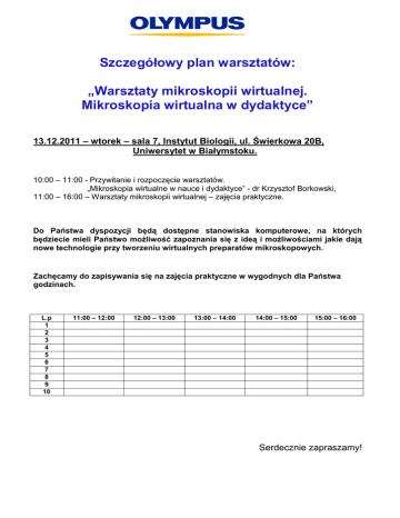Szczegółowy plan warsztatów: „Warsztaty mikroskopii wirtualnej. Mikroskopia wirtualna w dydaktyce” 13.12.2011 – wtorek – sala 7, Instytut Biologii, ul. Świerkowa 20B, Uniwersytet w Białymstoku. 10:00 – 11:00 - Przywitanie i rozpoczęcie warsztatów. „Mikroskopia wirtualne w nauce i dydaktyce” - dr Krzysztof Borkowski, 11:00 – 16:00 – Warsztaty mikroskopii wirtualnej – zajęcia praktyczne. Do Państwa dyspozycji będą dostępne stanowiska komputerowe, na których będziecie mieli Państwo moŜliwość zapoznania się z ideą i moŜliwościami jakie dają nowe technologie przy tworzeniu wirtualnych preparatów mikroskopowych. Zachęcamy do zapisywania się na zajęcia praktyczne w wygodnych dla Państwa godzinach. L.p 1 2 3 4 5 6 7 8 9 10 11:00 – 12:00 12:00 – 13:00 13:00 – 14:00 14:00 – 15:00 15:00 – 16:00 Serdecznie zapraszamy!