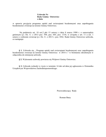 Uchwała Nr Rady Gminy Ostrowice z dnia w sprawie przyjęcia programu opieki nad zwierzętami bezdomnymi oraz zapobiegania bezdomności zwierząt na terenie Gminy Ostrowice. Na podstawie art. 18 ust.2 pkt 15 ustawy z dnia 8 marca 1990 r. o samorządzie gminnym (j.t. Dz. U. z 2013 poz. 594, poz. 645, poz. 1318, w związku z art. 11 a ust. 1 ustawy o ochronie zwierząt (j.t. Dz. U. z 2013 r. poz. 856) Rada Gminy Ostrowice uchwala, co następuje: § 1. Uchwala się „ Program opieki nad zwierzętami bezdomnymi oraz zapobiegania bezdomności zwierząt na terenie Gminy Ostrowice w 2014 r.” w brzmieniu określonym w załączniku do niniejszej uchwały. § 2. Wykonanie uchwały powierza się Wójtowi Gminy Ostrowice. § 3. Uchwała wchodzi w życie w terminie 14 dni od dnia jej ogłoszenia w Dzienniku Urzędowym Województwa Zachodniopomorskiego. Przewodniczący Rady Roman Bany Uzasadnienie Zwierzę, jako istota żyjąca, zdolna do odczuwania cierpienia, nie jest rzeczą. Człowiek jest mu winien poszanowanie, ochronę i opiekę ( art. 1 ustawy z dnia 21 sierpnia 1997 r. o ochronie zwierząt ). Podstawą prawną podjęcia przez Radę Gminy Ostrowice uchwały w sprawie „ Programu opieki nad zwierzętami bezdomnymi oraz zapobiegania bezdomności zwierząt na terenie Gminy Ostrowice”, zwanego dalej Programem jest art. 11 a ust. 1 ustawy z dnia 21 sierpnia 1997 r. o ochronie zwierząt. Program ma zastosowanie do wszystkich zwierząt domowych, w szczególności psów i kotów, w tym kotów wolno żyjących oraz zwierząt gospodarskich. Większość działań określonych w Programie dotyczy psów i kotów, ponieważ skala bezdomności tych zwierząt jest największa w całym kraju, jak również w Gminie Ostrowice. Bezdomność zwierząt jest zjawiskiem społecznym, którego głównymi przyczynami są: 1) niekontrolowane rozmnażanie, 2) porzucanie zwierząt przez właścicieli, 3) ucieczki zwierząt, 4) łatwość pozyskiwania zwierząt, 5) panujące mody na dane rasy zwierząt, 6) brak edukacji i wiedzy społeczeństwa w zakresie metod zapobiegania bezdomności, ze szczególnym uwzględnieniem sterylizacji i kastracji. Według raportu NIK w sprawie przestrzegania praw zwierząt z dnia 23 sierpnia 2011 r. zjawisko bezdomności zwierząt utrzymuje się na wysokim poziomie i ma tendencję wzrostową. Problem bezdomnych zwierząt staje się coraz poważniejszy, a negatywne zjawiska obserwowane także na terenach łowieckich są coraz częstsze. Świadczy to o nieprzestrzeganiu zasad przez właścicieli i beztrosce ludzi odpowiedzialnych za swoje zwierzęta Z powyższego względu zasadne jest podjęcie uchwały w przedmiotowej sprawie. Załącznik do uchwały Nr z dnia PROGRAM OPIEKI NAD ZWIERZĘTAMI BEZDOMNYMI ORAZ ZAPOBIEGANIA BEZDOMNOŚCI ZWIERZĄT NA TERENIE GMINY OSTROWICE W 2014 r. 1 Rozdział I POSTANOWIENIA OGÓLNE §1. Program ma zastosowanie w stosunku do bezdomnych zwierząt domowych, w tym w szczególności do bezdomnych psów i kotów przebywających w granicach administracyjnych Gminy Ostrowice. §2. Ilekroć w uchwale jest mowa o: 1) Urzędzie, należy przez to rozumieć Urząd Gminy Ostrowice, jednostkę organizacyjną, przy pomocy, której Wójt Gminy wykonuje zadania, 2) Schronisku, należy przez to rozumieć schronisko dla bezdomnych zwierząt, 3) Straży Gminnej, należy przez to rozumieć samodzielne stanowisko strażnika Straży Gminnej, 4) przytulisku, należy przez to rozumieć miejsce czasowego pobytu zwierząt nie będące schroniskiem, w którym zapewnione są warunki bytowania zwierząt w rozumieniu ustawy o ochronie zwierząt, 5) zwierzętach bezdomnych, należy przez to rozumieć zwierzęta domowe lub gospodarskie, które uciekły, zabłąkały się lub zostały porzucone przez człowieka, a nie ma możliwości ustalenia ich właściciela lub innej osoby, pod której opieką trwale dotąd pozostawały, 6) zwierzętach domowych, należy przez to rozumieć zwierzęta tradycyjnie przebywające wraz z człowiekiem w jego domu lub odpowiednim pomieszczeniu, utrzymywane przez człowieka w charakterze towarzysza, 7) kotach wolno żyjących, należy przez to rozumieć koty urodzone lub żyjące na wolności, żyjące w otoczeniu człowieka w stanie dzikim, 8) Programie, należy przez to rozumieć Program opieki nad zwierzętami bezdomnymi oraz zapobiegania bezdomności zwierząt na terenie Gminy Ostrowice w 2014 r. § 3.1. Koordynatorem Programu jest Wójt Gminy, za pośrednictwem stanowiska do spraw rolnictwa i gospodarki gruntami. 2. Realizatorami Programu są: 1) na poziomie gminy Wójt Gminy, za pośrednictwem stanowiska do spraw rolnictwa i gospodarki gruntami, 2) Schronisko dla Bezdomnych Zwierząt, 3) Straż Gminna, 4) Organizacje pozarządowe, których celem statutowym jest ochrona zwierząt, współpracujące z Urzędem Gminy Ostrowice i innymi jednostkami organizacyjnymi gminy. 2 Rozdział II CEL I ZADANIA PROGRAMU § 4.1. Celem Programu jest zapobieganie bezdomności zwierząt na terenie Gminy Ostrowice oraz opieka nad zwierzętami bezdomnymi. 2. Zadania priorytetowe Programu to: 1) ograniczanie populacji bezdomnych zwierząt poprzez sterylizację i kastrację zwierząt domowych, w szczególności psów i kotów, 2) zapewnienie opieki bezdomnym zwierzętom z terenu gminy Ostrowice, 3) sprawowanie opieki nad kotami wolno żyjącymi, w tym ich dokarmianie, 4) poszukiwanie nowych właścicieli dla bezdomnych zwierząt, 5) odławianie bezdomnych zwierząt, 6) zapewnienie opieki weterynaryjnej w przypadkach zdarzeń drogowych z udziałem zwierząt, 7) edukacja mieszkańców gminy w zakresie opieki nad zwierzętami, 8) Współuczestniczenie ( współpraca ) w przedsięwzięciach realizowanych przez koła łowieckie na rzecz ochrony zwierząt łownych, ze szczególnym uwzględnieniem zwierzyny drobnej ( m.in. zając, ptactwo ) Rozdział III OGRANICZANIE POPULACJI BEZDOMNYCH ZWIERZĄT §5. Ograniczanie populacji bezdomnych zwierząt poprzez sterylizację i kastrację zwi