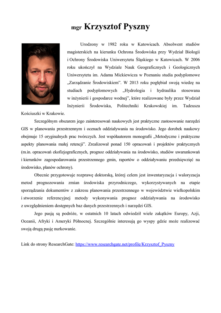 mgr Krzysztof Pyszny Urodzony w 1982 roku w Katowicach. Absolwent studiów magisterskich na kierunku Ochrona Środowiska przy Wydział Biologii i Ochrony Środowiska Uniwersytetu Śląskiego w Katowicach. W 2006 roku ukończył na Wydziale Nauk Geograficznych i Geologicznych Uniwersytetu im. Adama Mickiewicza w Poznaniu studia podyplomowe „Zarządzanie Środowiskiem”. W 2013 roku pogłębiał swoją wiedzę na studiach podyplomowych „Hydrologia i hydraulika stosowana w inżynierii i gospodarce wodnej”, które realizowane były przez Wydział Inżynierii Środowiska, Politechniki Krakowskiej im. Tadeusza Kościuszki w Krakowie. Szczególnym obszarem jego zainteresowań naukowych jest praktyczne zastosowanie narzędzi GIS w planowaniu przestrzennym i ocenach oddziaływania na środowisko. Jego dorobek naukowy obejmuje 15 oryginalnych prac twórczych. Jest współautorem monografii „Metodyczne i praktyczne aspekty planowania małej retencji”. Zrealizował ponad 150 opracowań i projektów praktycznych (m.in. opracowań ekofizjograficznych, prognoz oddziaływania na środowisko, studiów uwarunkowań i kierunków zagospodarowania przestrzennego gmin, raportów o oddziaływaniu przedsięwzięć na środowisko, planów ochrony). Obecnie przygotowuje rozprawę doktorską, której celem jest inwentaryzacja i waloryzacja metod prognozowania zmian środowiska przyrodniczego, wykorzystywanych na etapie sporządzania dokumentów z zakresu planowania przestrzennego w województwie wielkopolskim i stworzenie referencyjnej metody wykonywania prognoz oddziaływania na środowisko z uwzględnieniem dostępnych baz danych przestrzennych i narzędzi GIS. Jego pasją są podróże, w ostatnich 10 latach odwiedził wiele zakątków Europy, Azji, Oceanii, Afryki i Ameryki Północnej. Szczególnie interesują go wyspy gdzie może realizować swoją drugą pasję nurkowanie. Link do strony ResearchGate: https://www.researchgate.net/profile/Krzysztof_Pyszny