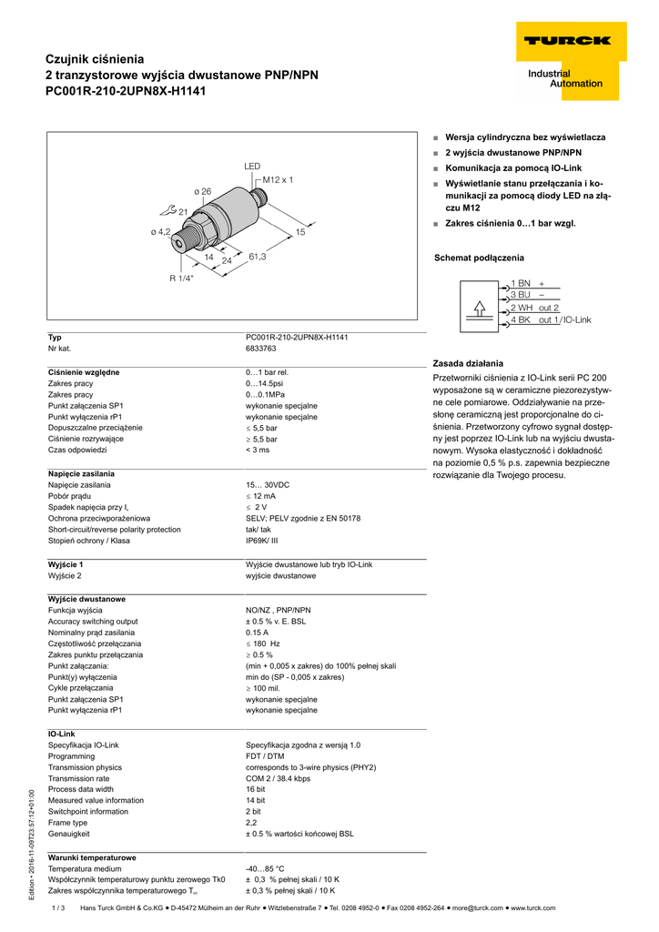 Czujnik ciśnienia 2 tranzystorowe wyjścia dwustanowe PNP/NPN PC001R-210-2UPN8X-H1141 ■ Wersja cylindryczna bez wyświetlacza ■ 2 wyjścia dwustanowe PNP/NPN ■ Komunikacja za pomocą IO-Link ■ Wyświetlanie stanu przełączania i komunikacji za pomocą diody LED na złączu M12 ■ Zakres ciśnienia 0…1 bar wzgl. Edition • 2016-11-09T23:57:12+01:00 Schemat podłączenia Typ Nr kat. PC001R-210-2UPN8X-H1141 6833763 Ciśnienie względne Zakres pracy Zakres pracy Punkt załączenia SP1 Punkt wyłączenia rP1 Dopuszczalne przeciążenie Ciśnienie rozrywające Czas odpowiedzi 0…1 bar rel. 0…14.5psi 0…0.1MPa wykonanie specjalne wykonanie specjalne ð 5,5 bar ï 5,5 bar < 3 ms Napięcie zasilania Napięcie zasilania Pobór prądu Spadek napięcia przy Ie Ochrona przeciwporażeniowa Short-circuit/reverse polarity protection Stopień ochrony / Klasa 15… 30VDC ð 12 mA ð 2V SELV; PELV zgodnie z EN 50178 tak/ tak IP69K/ III Wyjście 1 Wyjście 2 Wyjście dwustanowe lub tryb IO-Link wyjście dwustanowe Wyjście dwustanowe Funkcja wyjścia Accuracy switching output Nominalny prąd zasilania Częstotliwość przełączania Zakres punktu przełączania Punkt załączania: Punkt(y) wyłączenia Cykle przełączania Punkt załączenia SP1 Punkt wyłączenia rP1 NO/NZ , PNP/NPN ± 0.5 % v. E. BSL 0.15 A ð 180 Hz ï 0.5 % (min + 0,005 x zakres) do 100% pełnej skali min do (SP - 0,005 x zakres) ï 100 mil. wykonanie specjalne wykonanie specjalne IO-Link Specyfikacja IO-Link Programming Transmission physics Transmission rate Process data width Measured value information Switchpoint information Frame type Genauigkeit Specyfikacja zgodna z wersją 1.0 FDT / DTM corresponds to 3-wire physics (PHY2) COM 2 / 38.4 kbps 16 bit 14 bit 2 bit 2,2 ± 0.5 % wartości końcowej BSL Warunki temperaturowe Temperatura medium Współczynnik temperaturowy punktu zerowego Tk0 Zakres współczynnika temperaturowego TkS -40…85 °C ± 0,3 % pełnej skali / 10 K ± 0,3 % pełnej skali / 10 K 1/3 Zasada działania Przetworniki ciśnienia z IO-Link serii PC 200 wyposażone są w ceramiczne piezorezystywne cele pomiarowe. Oddziaływanie na przesłonę ceramiczną jest proporcjonalne do ciśnienia. Przetworzony cyfrowo sygnał dostępny jest poprzez IO-Link lub na wyjściu dwustanowym. Wysoka elastyczność i dokładność na poziomie 0,5 % p.s. zapewnia bezpieczne rozwiązanie dla Twojego procesu. Hans Turck GmbH & Co.KG ñ D-45472 Mülheim an der Ruhr ñ Witzlebenstraße 7 ñ Tel. 0208 4952-0 ñ Fax 0208 4952-264 ñ [email protected] ñ www.turck.com Czujnik ciśnienia 2 tranzystorowe wyjścia dwustanowe PNP/NPN PC001R-210-2UPN8X-H1141 Warunki otoczenia Temperatura pracy Temperatura składowania Odporność na wibracje Shock resistance -40…80 °C -40…+80°C 20 g (9…2000 Hz), zgodnie z IEC 68-2-6 50 , zgodnie z IEC 61508 Obudowa Materiał obudowy Materiał łącza procesowego Materiał przetwornika ciśnienia Materiał uszczelniający Podłączenie procesowe Wrench size pressure connection / coupling nut Połączenie elektryczne stal nierdzewna, 1.4305 (AISI 303)/PBT-GF15 Stal nierdzewna A2 1.4305 (AISI 303) Ceramics AL2O3 FPM R¼″, gwint żeński zgodny z normą DIN 2999 21 złącze kołnierzowe, M12 x 1 Warunki odniesienia zgodne z IEC 61298-1 temperatura Ciśnienie atmosferyczne Wilgotność Zasilanie pomocnicze 15…25 °C 860…1060 hPa bezwzgl. 45…75 % wzgl. 24 VDC LED Punkt załączania/wyłączania, PNP/NPN; NO/NC; histereza/tryb okna, filtr; jednostki ciśnienia; pamięć wartości szczytowej ciśnienia MTTF 2079 zgodnie z SN 29500 (Ed. 99) 40 °C 2/3 Hans Turck GmbH & Co.KG ñ D-45472 Mülheim an der Ruhr ñ Witzlebenstraße 7 ñ Tel. 0208 4952-0 ñ Fax 0208 4952-264 ñ [email protected] ñ www.turck.com Edition • 2016-11-09T23:57:12+01:00 Wskaźnik stanu przełączenia Wartość pomiarowa/programowanie Czujnik ciśnienia 2 tranzystorowe wyjścia dwustanowe PNP/NPN PC001R-210-2UPN8X-H1141 Akcesoria - okablowanie Typ Nr kat. WKC4.4T-2/TEL 6625025 Rysunek wymiarowy Przewód podłączeniowy, złącze żeńskie M12, kątowe, 4-pinowe, długość: 2 m; materiał otuliny: PVC, czarny; certyfikat cULus; dostępne również inne długości kabli i typy otuliny, patrz www.turck.com RKC4.4T-2/TEL 6625013a Przewód podłączeniowy, żeński M12, prosty, 4-stykowy, długość przewodu: 2 m; materiał otuliny: PVC, czarny; certyfikat cULus; dostępne również inne długości kabli i typy otuliny, patrz www.turck.com RKC4.4T-2/TXL 6625503 Przewód podłączeniowy, złącze żeńskie M12, proste, 4-pinowe, długość: 2 m; materiał otuliny: PVC, czarny; certyfikat cULus; dostępne również inne długości kabli i typy otuliny, patrz www.turck.com WKC4.4T-2/TXL 6625515 Przewód podłączeniowy, złącze żeńskie M12, kątowe, 4-pinowe, długość: 2 m; materiał otuliny: PVC, czarny; certyfikat cULus; dostępne również inne długości kabli i typy otuliny, patrz www.turck.com RKC4.4T-P7X2-10/TXL 6626184 Przewód podłączeniowy, złącze żeńskie M12, kątowe, 4-pinowe, długość: 10m; materiał otuliny: PUR, czarny; certyfikat cULus; dostępne również inne długości kabli i typy otuli- Edition • 2016-11-09T23:57:12+01:00 ny, patrz www.turck.com 3/3 Hans Turck GmbH & Co.KG ñ D-45472 Mülheim an der Ruhr ñ Witzlebenstraße 7 ñ Tel. 0208 4952-0 ñ Fax 0208 4952-264 ñ [email protected] ñ www.turck.com