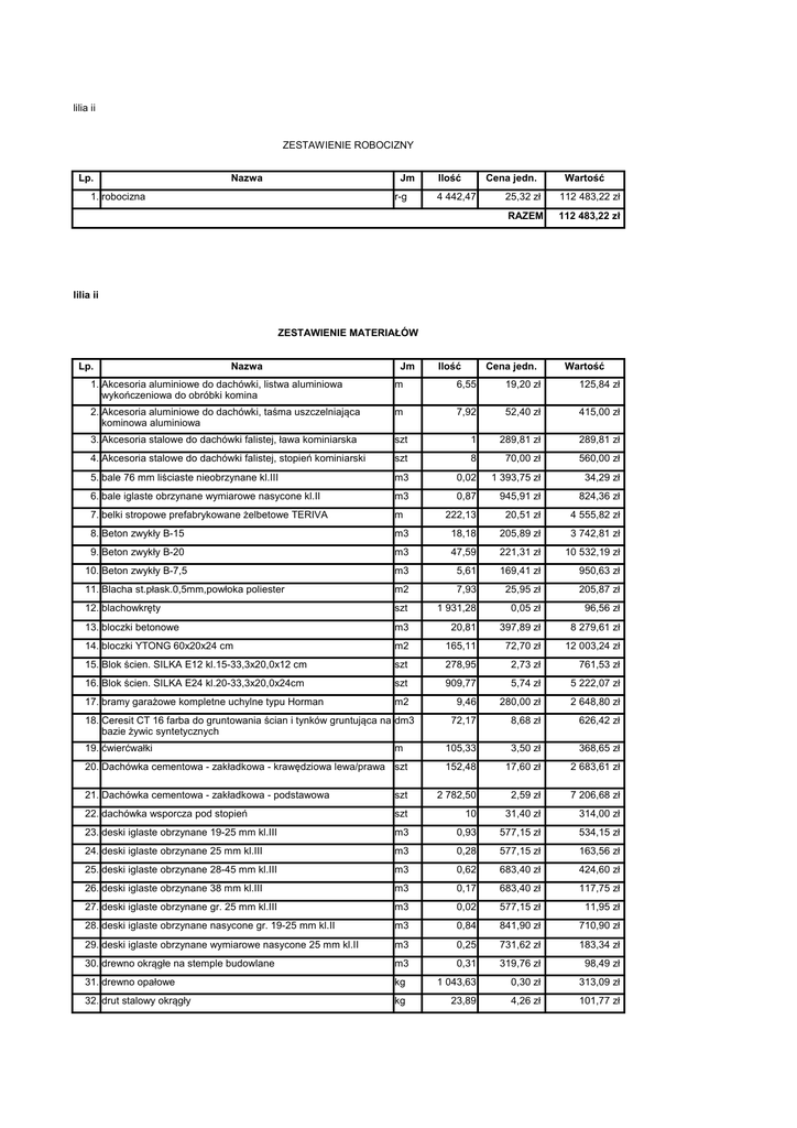 lilia ii ZESTAWIENIE ROBOCIZNY Lp. Nazwa Jm 1. robocizna r-g Ilość Cena jedn. 4 442,47 Wartość 25,32 zł 112 483,22 zł RAZEM 112 483,22 zł lilia ii ZESTAWIENIE MATERIAŁÓW Lp. Nazwa Jm Ilość Cena jedn. Wartość 1. Akcesoria aluminiowe do dachówki, listwa aluminiowa wykończeniowa do obróbki komina m 6,55 19,20 zł 125,84 zł 2. Akcesoria aluminiowe do dachówki, taśma uszczelniająca kominowa aluminiowa m 7,92 52,40 zł 415,00 zł 3. Akcesoria stalowe do dachówki falistej, ława kominiarska szt 1 289,81 zł 289,81 zł 4. Akcesoria stalowe do dachówki falistej, stopień kominiarski szt 8 70,00 zł 560,00 zł 5. bale 76 mm liściaste nieobrzynane kl.III m3 0,02 1 393,75 zł 34,29 zł 6. bale iglaste obrzynane wymiarowe nasycone kl.II m3 0,87 945,91 zł 824,36 zł 7. belki stropowe prefabrykowane żelbetowe TERIVA m 222,13 20,51 zł 4 555,82 zł 8. Beton zwykły B-15 m3 18,18 205,89 zł 3 742,81 zł 9. Beton zwykły B-20 m3 47,59 221,31 zł 10 532,19 zł 10. Beton zwykły B-7,5 m3 5,61 169,41 zł 950,63 zł 11. Blacha st.płask.0,5mm,powłoka poliester m2 7,93 25,95 zł 205,87 zł 12. blachowkręty szt 1 931,28 0,05 zł 96,56 zł 13. bloczki betonowe m3 20,81 397,89 zł 8 279,61 zł 14. bloczki YTONG 60x20x24 cm m2 165,11 72,70 zł 12 003,24 zł 15. Blok ścien. SILKA E12 kl.15-33,3x20,0x12 cm szt 278,95 2,73 zł 761,53 zł 16. Blok ścien. SILKA E24 kl.20-33,3x20,0x24cm szt 909,77 5,74 zł 5 222,07 zł 17. bramy garażowe kompletne uchylne typu Horman m2 9,46 280,00 zł 2 648,80 zł 72,17 8,68 zł 626,42 zł 18. Ceresit CT 16 farba do gruntowania ścian i tynków gruntująca na dm3 bazie żywic syntetycznych 19. ćwierćwałki m 20. Dachówka cementowa - zakładkowa - krawędziowa lewa/prawa szt 105,33 3,50 zł 368,65 zł 152,48 17,60 zł 2 683,61 zł 21. Dachówka cementowa - zakładkowa - podstawowa szt 2 782,50 2,59 zł 7 206,68 zł 22. dachówka wsporcza pod stopień szt 10 31,40 zł 314,00 zł 23. deski iglaste obrzynane 19-25 mm kl.III m3 0,93 577,15 zł 534,15 zł 24. deski iglaste obrzynane 25 mm kl.III m3 0,28 577,15 zł 163,56 zł 25. deski iglaste obrzynane 28-45 mm kl.III m3 0,62 683,40 zł 424,60 zł 26. deski iglaste obrzynane 38 mm kl.III m3 0,17 683,40 zł 117,75 zł 27. deski iglaste obrzynane gr. 25 mm kl.III m3 0,02 577,15 zł 11,95 zł 28. deski iglaste obrzynane nasycone gr. 19-25 mm kl.II m3 0,84 841,90 zł 710,90 zł 29. deski iglaste obrzynane wymiarowe nasycone 25 mm kl.II m3 0,25 731,62 zł 183,34 zł 30. drewno okrągłe na stemple budowlane m3 0,31 319,76 zł 98,49 zł 31. drewno opałowe kg 1 043,63 0,30 zł 313,09 zł 32. drut stalowy okrągły kg 23,89 4,26 zł 101,77 zł 33. drzwi drewniane zewnętrzne m2 3,68 1 000,00 zł 3 680,00 zł 34. drzwi o odporności ogniowej 30min. 35. dyble plastikowe "z grzybkami" kg 321,3 9,15 zł 2 939,90 zł szt 1 007,29 0,23 zł 231,68 zł 36. dyble stalowe 37. Emulsja gruntująca "Atlas Uni-Grunt" szt 94,08 3,03 zł 285,07 zł kg 177,86 5,55 zł 987,13 zł 38. farba emulsyjna Polinit dm3 233,73 5,86 zł 1 369,64 zł 39. farba ftalowa do gruntowania ogólnego stosowania dm3 1,42 13,97 zł 19,78 zł 40. farba olejna do gruntowania dm3 0,83 12,33 zł 10,25 zł 41. farba olejna nawierzchniowa dm3 0,79 12,09 zł 9,60 zł 42. Folia poliet. izolacyjna, grub. 0,3 mm m2 744,95 1,96 zł 1 460,10 zł 43. Folia poliet. zbrojona dachowa m2 344,5 3,78 zł 1 302,21 zł 44. gąsior dachowy podstawowy szt 61,88 11,50 zł 711,56 zł 45. gips budowlany szpachlowy t 0,36 1 144,61 zł 408,28 zł 46. grzebień okapu m 31,52 2,99 zł 94,24 zł 47. gwoździe budowlane okrągłe gołe kg 111,35 4,83 zł 537,84 zł 48. gwoździe stolarskie kg 0,48 5,90 zł 2,81 zł 49. Kanał wentylacyjny 2 ciągi Systemy kominowe - SCHIEDEL szt 27,9 21,15 zł 590,09 zł 50. Kanał wentylacyjny 3 ciągi Systemy kominowe - SCHIEDEL szt 24,6 21,15 zł 520,29 zł 51. kątownik aluminiowy m 74,09 3,27 zł 242,27 zł 52. klamra do gąsiorów szt 61,88 0,50 zł 30,94 zł 53. klamry boczne szt 1 391,25 0,23 zł 319,99 zł 54. klej winylowy kg 18,95 6,23 zł 118,03 zł 55. kołki do wstrzeliwania z nabojami szt 288,67 1,75 zł 505,18 zł 56. kołki rozporowe plastykowe z wkrętami szt 17,48 0,23 zł 4,02 zł 57. Kołn. okna dach. 78x160 do pokryć falist. szt 5 271,05 zł 1 355,25 zł 58. komin Schiedel RONDO PLUS 18 z wentylacją m 18,58 412,00 zł 7 655,54 zł 59. krawędziaki iglaste wymiarowe nasycone kl.II m3 10,49 845,61 zł 8 872,73 zł 60. kruszywo lekkie Keramzyt m3 19,34 181,97 zł 3 519,81 zł 61. kształtowniki walcowane - dwuteowniki kg 337,15 2,61 zł 879,96 zł 62. lepik asfaltowy bez wypełniaczy na gorąco kg 639,7 2,48 zł 1 586,45 zł 63. listwy iglaste strugane jednostronnie kl.I m3 64. listwy przyścienne z drewna m 65. łaty iglaste wymiarowe nasycone kl.II 66. łuk wsporczy do ław kominiarskich 0,01 1 105,25 zł 15,58 zł 199,79 7,09 zł 1 416,49 zł m3 2,07 814,44 zł 1 687,76 zł szt 2 29,03 zł 58,06 zł 67. masa asfaltowa kg 19,67 3,09 zł 60,77 zł 68. Masa uszczelniająca silikonowa "Silikon" kg 0,55 26,11 zł 14,26 zł 69. nadproża prefabrykowane L-19 m 53,86 28,71 zł 1 546,21 zł 70. okna i drzwi balkonowe PCV m2 27,44 350,00 zł 9 604,00 zł 71. Okno dach.z szybą hart.energooszcz.78x160 szt 5 1 062,77 zł 5 313,85 zł 72. ościeżnice drzwiowe stalowe szt 8 60,62 zł 484,96 zł 73. panele podłogowe m2 179,12 32,47 zł 5 816,00 zł 74. papa asfaltowa na tekturze izolacyjna m2 421,95 2,29 zł 966,27 zł 75. papier ścierny ark 8,74 1,03 zł 9,00 zł 76. Pianka uszczelniająca poliuretanowa kg 1,32 24,00 zł 31,63 zł 77. piasek do zapraw m3 48,52 31,88 zł 1 546,89 zł 78. Płyta gips. karton. wodoodporna 12,5mm m2 20,74 11,30 zł 234,40 zł 79. Płyta gips. karton.wodo-ogniooch.gr.12,5mm m2 233,78 12,53 zł 2 929,27 zł 80. Płyta gips. karton.zwykła gr.12,5mm m2 122,57 6,67 zł 817,56 zł 81. Płytki "Gres" o wym.30,0x30,0x1,0cm,gat.I m2 140,65 54,41 zł 7 652,98 zł 82. Płyty bud.OSB3 o krawędz.prostych gr.25mm m3 0,16 