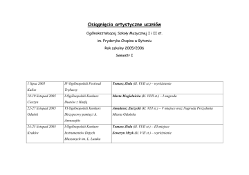 Osiągnięcia artystyczne uczniów Ogólnokształcącej Szkoły Muzycznej I i II st. im. Fryderyka Chopina w Bytomiu Rok szkolny 2005/2006 Semestr I 1 lipca 2005 IV Ogólnopolski Festiwal Tomasz Zioła (kl. VI/II st.) – wyróŜnienie Kalisz Trębaczy 18-19 listopad 2005 I Ogólnopolski Konkurs Cieszyn Duetów z Harfą 22-27 listopad 2005 VI Ogólnopolski Konkurs Amadeusz Zarzycki (kl. VI/I st.) – V miejsce oraz Nagroda Prezydenta Gdańsk Skrzypcowy pamięci A. Miasta Gdańska Marta Mogielnicka (kl. VI/II st.) – I nagroda Januszajtis 24-25 listopad 2005 I Ogólnopolski Konkurs Tomasz Zioła (kl. VI/II st.) – III miejsce Kraków Instrumentów Dętych Seweryn Mzyk (kl. V/II st.) – wyróŜnienie Blaszanych im. L. Lutaka 25-27 listopad 2005 VIII Konkurs Młodych Monika Hartmann (kl. VI/I st.) - wyróŜnienie Wrocław Wiolonczelistów 1-3 grudzień 2005 XIV Międzynarodowy Festiwal Przemyśl Muzyki Akordeonowej 2-4 grudzień 2005 XXXI Konkurs Bachowski Amadeusz Zarzycki (kl. VI/I st.) – III miejsce Zielona Góra im. Stanisława Hajzera Mikołaj Łukosz (kl. VI/II st.) – wyróŜnienie 7-9 grudzień 2005 V Ogólnopolski Festiwal Wojciech Psiuk (kl. V/II st.) - wyróŜnienie Przeworsk Saksofonowy 6-8 styczeń 2006 I Międzynarodowy Festiwal Wrocław Muzyki Akordeonowej Agnieszka Bagińska (kl. III/II st.) – II miejsce Katarzyna Lisowska (kl. IV/II st.) – III miejsce „Od Baroku do Jazzu” 26-28 styczeń 2006 Festiwal Muzyki Akordeonowej Katarzyna Lisowska (kl. IV/II st.) – zakwalifikowała się do Mława „Od solisty do orkiestry” Międzynarodowego Konkursu Akordeonowego w Niemczech 6-8 luty 2006 XXX Okręgowa Olimpiada Katarzyna Sobczyk (kl. V/II st.) – wyróŜniające się wyniki Katowice Artystyczna