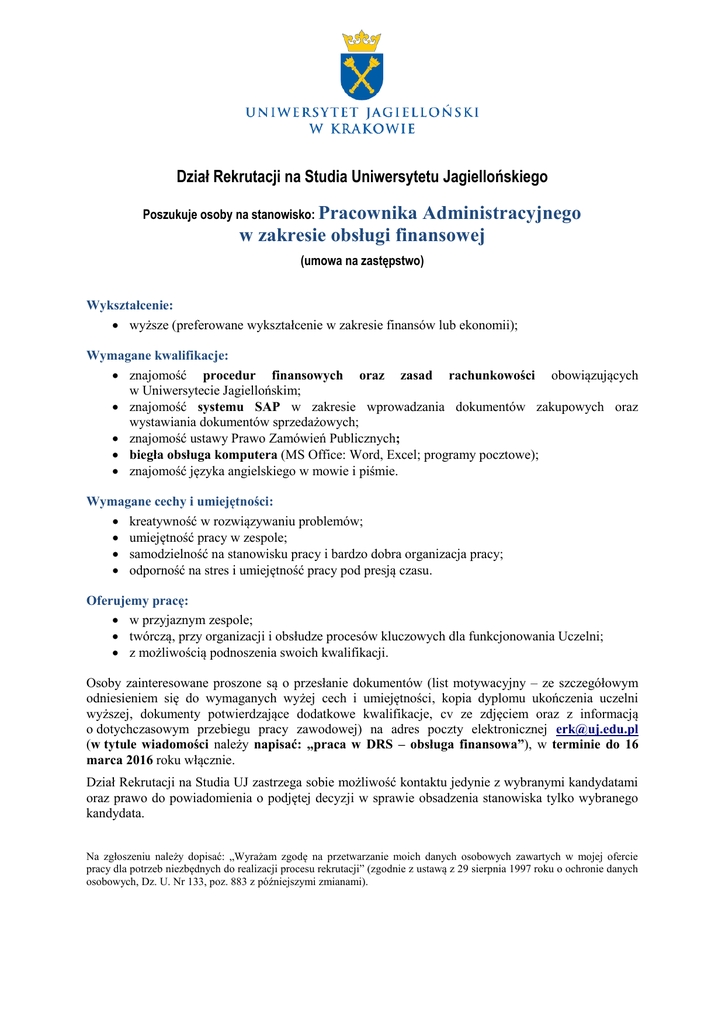 Dział Rekrutacji na Studia Uniwersytetu Jagiellońskiego Poszukuje osoby na stanowisko: Pracownika Administracyjnego w zakresie obsługi finansowej (umowa na zastępstwo) Wykształcenie:  wyższe (preferowane wykształcenie w zakresie finansów lub ekonomii); Wymagane kwalifikacje:  znajomość procedur finansowych oraz zasad rachunkowości obowiązujących w Uniwersytecie Jagiellońskim;  znajomość systemu SAP w zakresie wprowadzania dokumentów zakupowych oraz wystawiania dokumentów sprzedażowych;  znajomość ustawy Prawo Zamówień Publicznych;  biegła obsługa komputera (MS Office: Word, Excel; programy pocztowe);  znajomość języka angielskiego w mowie i piśmie. Wymagane cechy i umiejętności:  kreatywność w rozwiązywaniu problemów;  umiejętność pracy w zespole;  samodzielność na stanowisku pracy i bardzo dobra organizacja pracy;  odporność na stres i umiejętność pracy pod presją czasu. Oferujemy pracę:  w przyjaznym zespole;  twórczą, przy organizacji i obsłudze procesów kluczowych dla funkcjonowania Uczelni;  z możliwością podnoszenia swoich kwalifikacji. Osoby zainteresowane proszone są o przesłanie dokumentów (list motywacyjny – ze szczegółowym odniesieniem się do wymaganych wyżej cech i umiejętności, kopia dyplomu ukończenia uczelni wyższej, dokumenty potwierdzające dodatkowe kwalifikacje, cv ze zdjęciem oraz z informacją o dotychczasowym przebiegu pracy zawodowej) na adres poczty elektronicznej [email protected] (w tytule wiadomości należy napisać: „praca w DRS – obsługa finansowa”), w terminie do 16 marca 2016 roku włącznie. Dział Rekrutacji na Studia UJ zastrzega sobie możliwość kontaktu jedynie z wybranymi kandydatami oraz prawo do powiadomienia o podjętej decyzji w sprawie obsadzenia stanowiska tylko wybranego kandydata. Na zgłoszeniu należy dopisać: „Wyrażam zgodę na przetwarzanie moich danych osobowych zawartych w mojej ofercie pracy dla potrzeb niezbędnych do realizacji procesu rekrutacji” (zgodnie z ustawą z 29 sierpnia 1997 roku o ochronie danych osobowych, Dz. U. Nr 133, poz. 883 z późniejszymi zmianami).