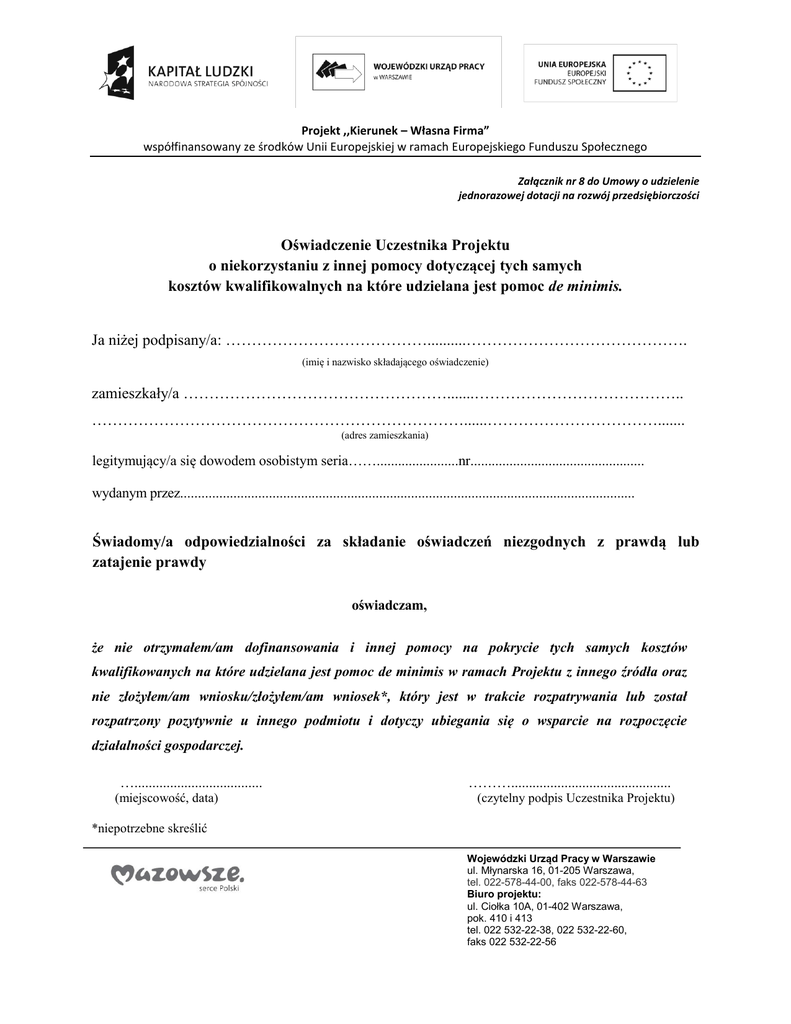 Projekt ,,Kierunek – Własna Firma” współfinansowany ze środków Unii Europejskiej w ramach Europejskiego Funduszu Społecznego Załącznik nr 8 do Umowy o udzielenie jednorazowej dotacji na rozwój przedsiębiorczości Oświadczenie Uczestnika Projektu o niekorzystaniu z innej pomocy dotyczącej tych samych kosztów kwalifikowalnych na które udzielana jest pomoc de minimis. Ja niżej podpisany/a: …………………………………..........……………………………………. (imię i nazwisko składającego oświadczenie) zamieszkały/a …………………………………………….......………………………………….. ………………………………………………………………......……………………………....... (adres zamieszkania) legitymujący/a się dowodem osobistym seria…….......................nr................................................. wydanym przez................................................................................................................................ Świadomy/a odpowiedzialności za składanie oświadczeń niezgodnych z prawdą lub zatajenie prawdy oświadczam, że nie otrzymałem/am dofinansowania i innej pomocy na pokrycie tych samych kosztów kwalifikowanych na które udzielana jest pomoc de minimis w ramach Projektu z innego źródła oraz nie złożyłem/am wniosku/złożyłem/am wniosek*, który jest w trakcie rozpatrywania lub został rozpatrzony pozytywnie u innego podmiotu i dotyczy ubiegania się o wsparcie na rozpoczęcie działalności gospodarczej. ….................................... (miejscowość, data) ………............................................. (czytelny podpis Uczestnika Projektu) *niepotrzebne skreślić Wojewódzki Urząd Pracy w Warszawie ul. Młynarska 16, 01-205 Warszawa, tel. 022-578-44-00, faks 022-578-44-63 Biuro projektu: ul. Ciołka 10A, 01-402 Warszawa, pok. 410 i 413 tel. 022 532-22-38, 022 532-22-60, faks 022 532-22-56