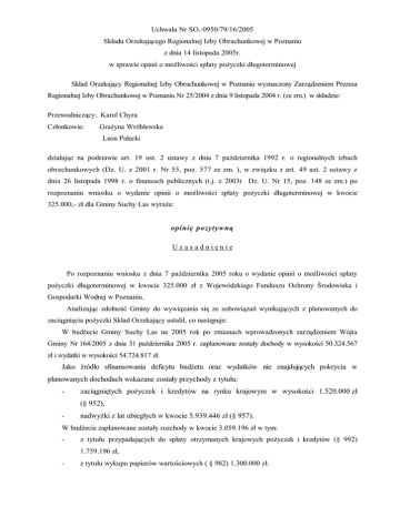 Uchwała Nr SO.-0950/79/16/2005 Składu Orzekającego Regionalnej Izby Obrachunkowej w Poznaniu z dnia 14 listopada 2005r. w sprawie opinii o możliwości spłaty pożyczki długoterminowej Skład Orzekający Regionalnej Izby Obrachunkowej w Poznaniu wyznaczony Zarządzeniem Prezesa Regionalnej Izby Obrachunkowej w Poznaniu Nr 25/2004 z dnia 9 listopada 2004 r. (ze zm.) w składzie: Przewodniczący: Karol Chyra Członkowie: Grażyna Wróblewska Leon Pałecki działając na podstawie art. 19 ust. 2 ustawy z dnia 7 października 1992 r. o regionalnych izbach obrachunkowych (Dz. U. z 2001 r. Nr 55, poz. 577 ze zm. ), w związku z art. 49 ust. 2 ustawy z dnia 26 listopada 1998 r. o finansach publicznych (t.j. z 2003r Dz. U. Nr 15, poz. 148 ze zm.) po rozpoznaniu wniosku o wydanie opinii o możliwości spłaty pożyczki długoterminowej w kwocie 325.000,- zł dla Gminy Suchy Las wyraża: opinię pozytywną Uzasadnienie Po rozpoznaniu wniosku z dnia 7 października 2005 roku o wydanie opinii o możliwości spłaty pożyczki długoterminowej w kwocie 325.000 zł z Wojewódzkiego Funduszu Ochrony Środowiska i Gospodarki Wodnej w Poznaniu. Analizując zdolność Gminy do wywiązania się ze zobowiązań wynikających z planowanych do zaciągnięcia pożyczki Skład Orzekający ustalił, co następuje: W budżecie Gminy Suchy Las na 2005 rok po zmianach wprowadzonych zarządzeniem Wójta Gminy Nr 164/2005 z dnia 31 października 2005 r. zaplanowane zostały dochody w wysokości 50.324.567 zł i wydatki w wysokości 54.724.817 zł. Jako źródło sfinansowania deficytu budżetu oraz wydatków nie znajdujących pokrycia w planowanych dochodach wskazane zostały przychody z tytułu: - zaciągniętych pożyczek i kredytów na rynku krajowym w wysokości 1.520.000 zł (§ 952), - nadwyżki z lat ubiegłych w kwocie 5.939.446 zł (§ 957). W budżecie zaplanowane zostały rozchody w kwocie 3.059.196 zł w tym: - z tytułu przypadających do spłaty otrzymanych krajowych pożyczek i kredytów (§ 992) 1.759.196 zł, - z tytułu wykupu papierów wartościowych ( § 982) 1.300.000 zł. Rada Gminy uchwałą Nr XLIII/368/2005 z dnia 6 października 2005r. postanowiła o zaciągnięciu pożyczki z WFOŚiGW w kwocie 325.000 zł na realizację zadania inwestycyjnego pn. „Budowa kanalizacji sanitarnej w miejscowościach Chludowo i Suchy Las”. Zadanie to zostało zaplanowane w budżecie w dz. 010, rozdz. 01010 Infrastruktura wodociągowa i sanitacyjna wsi. Zobowiązania Gminy na dzień 31.12.2004 r.(wg sprawozdania Rb-Z za IV kwartał 2004 roku) wyniosły 8.838.901,- zł. Po zaciągnięciu zaplanowanych w budżecie kredytów i pożyczek w wysokości 1.520.000,-zł oraz dokonaniu spłat rat kredytów i pożyczek i wykupie obligacji w wysokości 3.059.196,- zł dług Gminy na dzień 31.12.2005 r. wyniesie 8.599.705 zł (wartość nominalna), co stanowi 17,09 % planowanych dochodów budżetu gminy na 2005 rok, zatem spełniony zostanie wymóg ustawowy art. 114 ustawy z dnia 26 listopada 1998 r. o finansach publicznych. Skład Orzekający zapoznał się z przedłożonym za III kwartał 2005 r. sprawozdaniem Rb-Z i ustalił, że zobowiązania Gminy wynosiły 6.369.154 zł, co stanowi 12,91% planowanych dochodów. Ze sprawozdania Rb-NDS za ten okres wynika, że Gmina dokonało spłaty rat pożyczek i kredytów w kwocie 1.169.747 zł. Z analizy posiadanych przez tut. Izbę i dołączonych do wniosku dokumentów, w tym opracowanej przez Gminę prognozy kształtowania się dochodów budżetu w latach 2005 – 2009 wynika, że spłata zobowiązań z tytułu rat kredytów i pożyczek, wykupu obligacji oraz planowanej do zaciągnięcia pożyczki w kwocie 325.000,- zł. kształtować się będzie następująco: Rok 2005 – 14,54 % Rok 2006 – 13,87 % Rok 2007 – 7,59 % Rok 2008 – 1,02 % Rok 2009 – 0,24 % Biorąc powyższe pod uwagę, Skład Orzekający wyraża opinię, że w latach 2005 -2009 łączna kwota przypadających do spłaty w danym roku budżetowym rat kredytów i pożyczek wraz z należnymi odsetkami nie przekroczy 15% planowanych dochodów budżetu Gminy, a więc warunek określony w art. 113 ust. 1 ustawy z dnia 26 listopada 1998 r. o finansach publicznych (tekst jednolity z 2003 roku Dz. U. Nr 15, poz. 148 ze zm.) zostanie spełniony. Skład Orzekający wskazuje, że warunek ten będzie spełniony w przypadku osiągnięcia w poszczególnych latach (2005-2009) prognozowanych dochodów oraz w sytuacji, gdy w następnych latach nie wzrośnie w sposób znaczący zadłużenie Gminy. Przewodniczący Składu Orzekającego Karol Chyra Pouczenie: Od niniejszej uchwały Składu Orzekającego służy odwołanie do Kolegium Izby w terminie 14 dni od daty doręczenia.