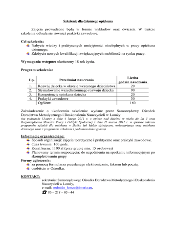 Szkolenie dla dziennego opiekuna Zajęcia prowadzone będą w formie wykładów oraz ćwiczeń. W trakcie szkolenia odbędą się również praktyki zawodowe. Cel szkolenia: Nabycie wiedzy i praktycznych umiejętności niezbędnych w pracy opiekuna dziennego. Zdobycie nowych kwalifikacji zwiększających mobilność na rynku pracy. Wymagania wstępne: ukończony 18 rok życia. Program szkolenia: Lp. 1. 2. 3. 4. Liczba godzin nauczania Rozwój dziecka w okresie wczesnego dzieciństwa 20 Stymulowanie wszechstronnego rozwoju dziecka 90 Kompetencje opiekuna dziecka 20 Praktyki zawodowe 30 Ogółem: 160 Przedmiot nauczania Zaświadczenie o ukończeniu szkolenia: wydane przez Samorządowy Ośrodek Doradztwa Metodycznego i Doskonalenia Nauczycieli w Łomży (na podstawie Ustawy z dnia 4 lutego 2011 r. o opiece nad dziećmi w wieku do lat 3 oraz Rozporządzenia Ministra Pracy i Polityki Społecznej z dnia 25 marca 2011 r. w sprawie zakresu programów szkoleń dla opiekuna w żłobku lub klubie dziecięcym, wolontariusza oraz opiekuna dziennego wraz z programem szkolenia i podaniem ilości godzin) Informację organizacyjne: Sposób organizacji: zajęcia teoretyczne i praktyczne oraz praktyki zawodowe. Czas trwania: 160 godz. Koszt kursu: 1100 zł (przy grupie min. 15 osobowej) Planowany termin rozpoczęcia: do uzgodnienia na spotkaniu informacyjnym po skompletowaniu grupy Formy zgłoszenia: za pomocą formularza przesłanego elektronicznie, faksem lub pocztą. osobiście w Ośrodku. KONTAKT: sekretariat Samorządowego Ośrodka Doradztwa Metodycznego i Doskonalenia Nauczycieli w Łomży, e-mail: [email protected], ☎ 86 – 218 – 05 - 44