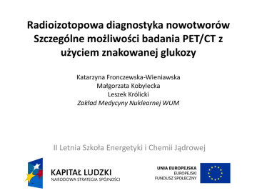 Radioizotopowa diagnostyka nowotworów Szczególne możliwości badania PET/CT z użyciem znakowanej glukozy Katarzyna Fronczewska-Wieniawska Małgorzata Kobylecka Leszek Królicki Zakład Medycyny Nuklearnej WUM II Letnia Szkoła Energetyki i Chemii Jądrowej Radioizotopowa diagnostyka nowotworów Szczególne możliwości badania PET/CT z użyciem znakowanej glukozy Katarzyna Fronczewska-Wieniawska Małgorzata Kobylecka Leszek Królicki Zakład Medycyny Nuklearnej WUM Medycyna nuklearna Dział medycyny zajmujący się wykorzystaniem otwartych źródeł promieniowania jonizującego w badaniach diagnostycznych i leczeniu. Definicja WHO Schemat badania radioizotopowego Struktura versus funkcja kwestia życia lub śmierci żywy martwy Podział medycyny nuklearnej Klasyczna MN, Obrazowanie met. Pojedynczego fotonu (single photon emission) SPECT Obrazowanie po jednoczesnej emisji dwóch fotonów Techniką pozytonowej tomografii (positon emission tomography) PET Metoda PET oparta jest na zjawisku anihilacji elektronu i pozytonu, prowadzącym do zmiany ich masy na energię, emitowaną w postaci kwantów gamma Układ do detekcji anihilacji fotonów gamma; impuls na wyjściu pojawia się tylko przy równoczesnej detekcji fotonów przez oba liczniki Slide 7 Główna zaleta PET wynikająca z podstaw biologicznych Radioizotopy/radiofarmaceutyki pozwalają śledzić in vivo procesy biochemiczne, bez ich zakłócenia (11C, 13N, 15O, 18F ) Główne ograniczenie PET wynikające z podstaw fizycznych Stosowane radioizotopy mają bardzo krótki okres półtrwania: 11C= 20 min 13N= 10 min 15O= 2 min, 18F = 110 min Cyklotrony z przeznaczeniem do produkcji izotopów promieniotwórczych: - małe wymiary, - stosunkowa prostota w budowie i obsłudze, - niskie koszty eksploatacji, - duża niezawodność. Zautomatyzowane moduły do: - syntezy, - oczyszczania, - sterylizacji, - przygotowania próbki radiofarmaceutyku. Pomieszczenie szpitalne: - iniekcja radiofarmaceutyku, - skanowanie pacjenta, - obróbka wyników. PET/CT Biograph (Siemens) Brownell, Sweet, Aronow 1953 1. Skan rentgenowski (ok. 9 s) tzw. topogram 2. Badanie CT (ok. 1 min) - dane o anatomicznym obrazie badanych struktur (mapa dla PET) - dane o rozkładzie gęstości tkanek (korekcja pochlaniania) 3. Badanie PET (ok. 3 min) - „łóżko”- jednoczasowo badany odcinek ciała (obszar gantry o szerokości 13 cm) Badanie PET całego ciała ok. 20 minut. 18FDG PET - diagnostyka nowotworów • W badaniu CT nowotwór zwykle jest wykrywany gdy osiągnie wielkość 10-100g lub 1010 -1011 komórek • Obecnie systemy PET mają rozdzielczość 0.4 – 1.0 cm, co odpowiada w przybliżeniu 0.1-0.5 – 1.0 g (lub 108 – 109 komórek) • Ujemny wynik PET oznacza że: albo nie ma komórek guza, albo że jest ich mniej niż 10 7 18FDG PET - diagnostyka nowotworów • Ujemny wynik PET po zakończeniu leczenia zwykle sugeruje dobrą prognozę, ale niekoniecznie koresponduje z BRAKIEM KOMÓREK NOWOTWOROWYCH !!!! • Dodatni wynik PET po zakończeniu leczenia (po wykluczeniu zmian zapalnych) wskazuje na obecność aktywnego guza. Wahl et al. RECIST to PERCIST: PET Tumor Response JNM vol 50 (5)Supp May 2009 Unikalne możliwości techniki 18FDG PET • Zaburzenie funkcji zwykle znacznie wyprzedza zmiany w budowie anatomicznej • PET różnicuje procesy złośliwe i łagodne • PET różnicuje bliznę i wznowę procesu nowotworowego, po leczeniu • PET ocenia aktualny stopień zaawansowania choroby • PET określa stopień odpowiedzi na leczenie farmakologiczne (odpowiedź metaboliczna występuje wcześniej niż morfologiczna) Wskazania do badań PET z zastosowaniem 18FDG • Wzrost markerów, przy ujemnym CT/MRI • Niespecyficzny obraz CT/MRI • (wznowa, zmiany poterapeutyczne?) • Przy istniejących przerzutach: • określenie zaawansowania choroby • identyfikacja innych odległych ognisk. • Wczesna ocena odpowiedzi na leczenie Wskazania do badań PET z zastosowaniem 18FDG (refundacja NFZ) • • • • • Raki głowy i szyi Chłoniaki Raki płuc Pojedynczy guz płuca Raki jelita grubego i odbytnicy • Czerniak • Raki tarczycy • • • • • • Guzy mózgu Raki jajnika Raki przełyku Kardiologia Padaczka Radioterapia Fenotyp nowotworowy oceniany w badaniu 18FDG-PET adaptacja komórek nowotworowych do warunków niedotlenienia • Zjawisko Warburga: – komórki nowotworowe zużywają głównie glukozę Otto Warburg – „rozwój raka jest procesem anaerobowym” • „the prime cause of cancer is the replacement of the respiration of oxygen in normal body cells by a fermentation of sugar." 18FDG PET: gromadzenie fizjologiczne i patologiczne serce wnęka płucna wątroba Szpik kostny nerki jelita zapalenie stawu przerzut pęcherz moczowy Interpretacja badania 18FDG PET • Ocena jakościowa • Ocena półilościowa z użyciem stosunku aktywności w zmianie do tła lub narządu referencyjnego • Ocena półilościowa SUV aktywność w ROI (mikroCi/ml) SUV = -----------------------------------------------Dawka (mCi) /waga (kg) Pojedynczy guzek płuca Rak płuc - meta Pojedynczy guzek płuca Rak jajnika – zmiany przerzutowe do sieci i wątroby Chłoniak Hodgkina - ocena przed i po leczeniu Rak jelita grubego – przerzuty do kości Rak jelita grubego – przerzuty do kości Czerniak Chłoniak Chłoniak PET/CT - planowanie radioterapii • Potencjalne znaczenie w planowaniu radioterapii • Dokładna ocena obszaru naświetlania – Optymalizacja dawki leczniczej – Ograniczenie dawki w obrębie narządów sąsiadujących PET/CT - planowanie radioterapii • Potencjalne znaczenie w planowaniu radioterapii • Dokładna ocena obszaru naświetlania – Optymalizacja dawki leczniczej – Ograniczenie dawki w obrębie narządów sąsiadujących PET/CT - planowanie radioterapii CT Terapia zaplanowana przy użyciu CT PET/CT Terapia zaplanowana przy użyciu PET/CT Fazio et al. Institute H San Raffaele, Milano PET/CT - planowanie radioterapii Obszar 