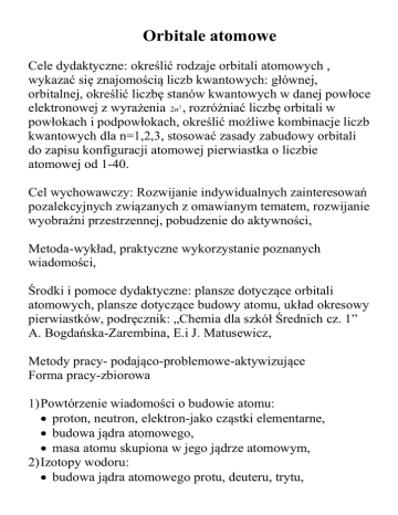 Orbitale atomowe Cele dydaktyczne: określić rodzaje orbitali atomowych , wykazać się znajomością liczb kwantowych: głównej, orbitalnej, określić liczbę stanów kwantowych w danej powłoce elektronowej z wyrażenia 2n , rozróżniać liczbę orbitali w powłokach i podpowłokach, określić możliwe kombinacje liczb kwantowych dla n=1,2,3, stosować zasady zabudowy orbitali do zapisu konfiguracji atomowej pierwiastka o liczbie atomowej od 1-40. 2 Cel wychowawczy: Rozwijanie indywidualnych zainteresowań pozalekcyjnych związanych z omawianym tematem, rozwijanie wyobraźni przestrzennej, pobudzenie do aktywności, Metoda-wykład, praktyczne wykorzystanie poznanych wiadomości, Środki i pomoce dydaktyczne: plansze dotyczące orbitali atomowych, plansze dotyczące budowy atomu, układ okresowy pierwiastków, podręcznik: „Chemia dla szkół Średnich cz. 1” A. Bogdańska-Zarembina, E.i J. Matusewicz, Metody pracy- podająco-problemowe-aktywizujące Forma pracy-zbiorowa 1) Powtórzenie wiadomości o budowie atomu: proton, neutron, elektron-jako cząstki elementarne, budowa jądra atomowego, masa atomu skupiona w jego jądrze atomowym, 2) Izotopy wodoru: budowa jądra atomowego protu, deuteru, trytu, obliczanie masy atomowej pierwiastka jako średniej masy atomowej ze składu izotopowego pierwiastka, 3) Pojęcie liczby atomowej i masowej: oblicz skład jądra atomowego na podstawie zapisu dowolnego pierwiastka E , 4) liczba cząstek elementarnych: p , n , e na podstawie zapisu każdy e ma pewien zasób energii, czyli zajmuje określony stan kwantowy, stan podstawowy o najniższej energii e , stan wzbudzony o wyższej energii, poszczególnym stanom kwantowym e w atomie odpowiadają orbitale, których kontury mają różny kształt, wielkość i orientację w przestrzeni. Orbitale posiadają określoną wartość energii, model atomu H , orbital s w stanie podstawowym o najniższej energii- kulisty, A Z 0 kształt klepsydry Orbital s px orbital o wyższej energii 5) Każdy stan kwantowy w atomie opisują tzw. liczby kwantowe, główna liczba kwantowa określa energię elektronu. Oznaczona symbolem „n” n=1,2,3,... wszystkie stany kwantowe o identycznej wartości głównej liczby kwantowej tworzą zbiór, który nazywamy powłoką elektronową, uproszczony model atomu 6)Liczbę stanów kwantowych a tym samym maksymalną liczbę e , jakie mogą wypełnić daną powłokę oblicza się z wyrażenia, K-2 N-32 Q-98 2n L-8 O-50 M-18 P-72 7)Orbitalna liczba kwantowa l służy rozróżnianiu stanów energetycznych e znajdujących się w tej samej powłoce, l=0,1,2,3,...(n-1) 2 Zapisać Wszystkie stany kwantowe o tej samej wartości głównej i tej samej wartości orbitalnej liczby kwantowej tworzą w ramach danej powłoki zbiór, zwany podpowłoką elektronową, główna nr. liczba liczba liczba = powłoki = wartości = podpowłoki kwantowa elektron. l elektronowej n 8)Liczba orbitali w powłokach i podpowłokach, 1. K s n=1 l=0 2. L s,p n=2 l=0,1 3. M s,p,d n=3 l=0,1,2 4. N s,p,d,f n=4 l=0,1,2,3 Podpowłoki są utworzone z orbitali o różnych kształtach. Nieznaczne różnice energii elektronów wynikają z ich ruchu wewnętrznego-spinu (wirować). Spin ma dwie orientacje w przestrzeni +0,5 -0,5 Elektron o przeciwnej orientacji spinu-sparowane, 9)Zakaz Wolfgana Pauliego-w danym atomie nie mogą się znajdować 2 elektrony o identycznym stanie kwantowym, 10)Krótkie wiadomości dotyczących orbitali atomowych i liczb kwantowych. powtórzenie Opracowała: Anna Malicka