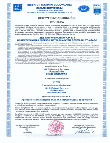 INSTYTUT TECHNlKl BUDOWLANEJ ul. FILTROWA 1,00411 WARSZAWA tel.: (0 25) SI 96 167.168. 10 22) 826 52 29, fax. (0 221 57 96 296 Zgodnie z ustawq z dnia 16 kwietnia 2004 r. o wyrobach budowlanych (Dz. U. Nr 92 poz. 881) oraz rozporzqdzeniami: Ministra lnfrastruktury z dnia 11 sierpnia 2004 r. w sprawie sposobdw deklarowania zgodnokci wyrobdw budowlanych oraz sposobu znakowania ich znakiem budowlanym (Dz. U. Nr 198 poz. 2041) i Ministra Budownictwa z dnia 22 grudnia 2006 r., zmieniajqcym rozpo~qdzenie w sprawie sposobdw deklarowania zgodnoSci wyrobdw budowlanych oraz sposobu znakowania ich znakiem budowlanym (Dz. U. z 2006 r. Nr 245, poz. 1782), potwierdza siq, ie: ZESTAW W Y R O B ~ WCP 673 DO USZCZELNIANIA PRZEJSC INSTALACYJNYCH, SZCZELIN I DYLATACJI W sktad zestawu wymb6w CP 673 wchodq farba ogniochronna CP 673, masa ogniochronna CP 673, plyty z wetny mineralnej CP 673. Zestaw przeznaczonyjest do: uszczelniania przejg instalacyjnych kabli, rur z tworzyw sztucznych, rur stalowych, miedzianych i teliwnych przez Sciany o grubofici nie mniejszej nit 10 cm, wykonane z cegty, betonu, gazobetonu lub plyt gipsowo-kartonowych i przez stropy o grub& nie mniejszej n i i 15 cm, wykonane z cegly, betonu lub gazobetonu wypetniania dylataoji i szczelin o szerokoSci powytej 10 cm lecz nie wigkszych nit 15 cm w ficianach wykonanych z cegty lub betonu, gruboSci nie mniejszej nit 12 cm albo gazobetonu, g r u W nie mniejszej n i i 17,5 cm oraz o szerokoSci 10 cm, w Scianach wykonanych z cegly, betonu, gazobetonu lub lekkich przegrodach z okladzinami z plyt g~psowo-kartonowych,gruboSci nie mniejszej ni2 10 cm,w shopch wykonanych z cegly, beton lub gazobetonu, gruboSci nie mniejszej nit 15 cm. uszczelniania pnejSC instalacyjnych izdowanych przewodbw wentylacyjnych przez Sciany betonowe o gruboki nie mniejnrej nit 12 cm lub gazobetonowe o grubo9ci nie mniejszej niF 17.5 cm PrzejScia instalacyjneprzez Sciany i stropy, wykonane zgodnie z wymaganiami AT-15-641812008, uszczelnione plytami, m a w ognlochronnqi farb&ogniochronnqCP 673 spelniaj& kryteria klasy El 120 odpornki ogniowej okdlonej w normie PN-B-02851-l:l997. Uszczelnienia szczelin i dylatacji, wykonane zgodnie z wymaganiami AT-15%418/2008, uszczelnione plytami, mas@ogniochronnqi farbq lub m a w ogniochronnqCP 673 spdniajq kryteria klasy El 120 odpornotci ogniowej okreklonej w normie PN-B-02851-1:1997 oraz kryteria klasy El 120-T-XF-W 00 do 150 odpomoSci ogniowej okre9lonej w normie PN-EN 13501-2:2007 . produkowany prrez firm*: HILT1 (Poland) Sp. z 0.0. Pulawska 491 02-844 WARSZAWA w Zakladzie Produkcyjnym: 31-Of8 i wprowadzony do obrotu prrez: HILT1 (Poland) Sp. z 0.0. Pulawska 491 02-844 WARSZAWA spehia wymagania okredlone w: Aprobacie Technicznej ITB nr AT-15-641812008 watnej do 23.09.201 3 Producent wdrotyi system zaktadowej kontroli produkcji i prowadzi badania prdbek wyrobu, pobranych w mkladzie produkcyjnym, zgodnie z planem badah. - Zakfad Certyfkacji IT6 w ramach systemu oceny zgodno4ci 1, przeprowadzii wstt)pne badania typu oraz wstQpny audit zakladu produkcyjnego i mktadowej kontroli produkcji, prowadzi staty nadrbr, ocenq i akceptacjq zakiadowej kontroli produkcji. zostai wydany po raz pie06.09.2007. Niniejszy certyfikat 06.09.2007 i jest wainy, dopdki wainy jest dokument odniesienia dla ww. wyrobu, wyrdb spelnia wymagania tego dokumentu oraz n b ulegly istotnym zmianom: typ wyrobu, warunki i miejs