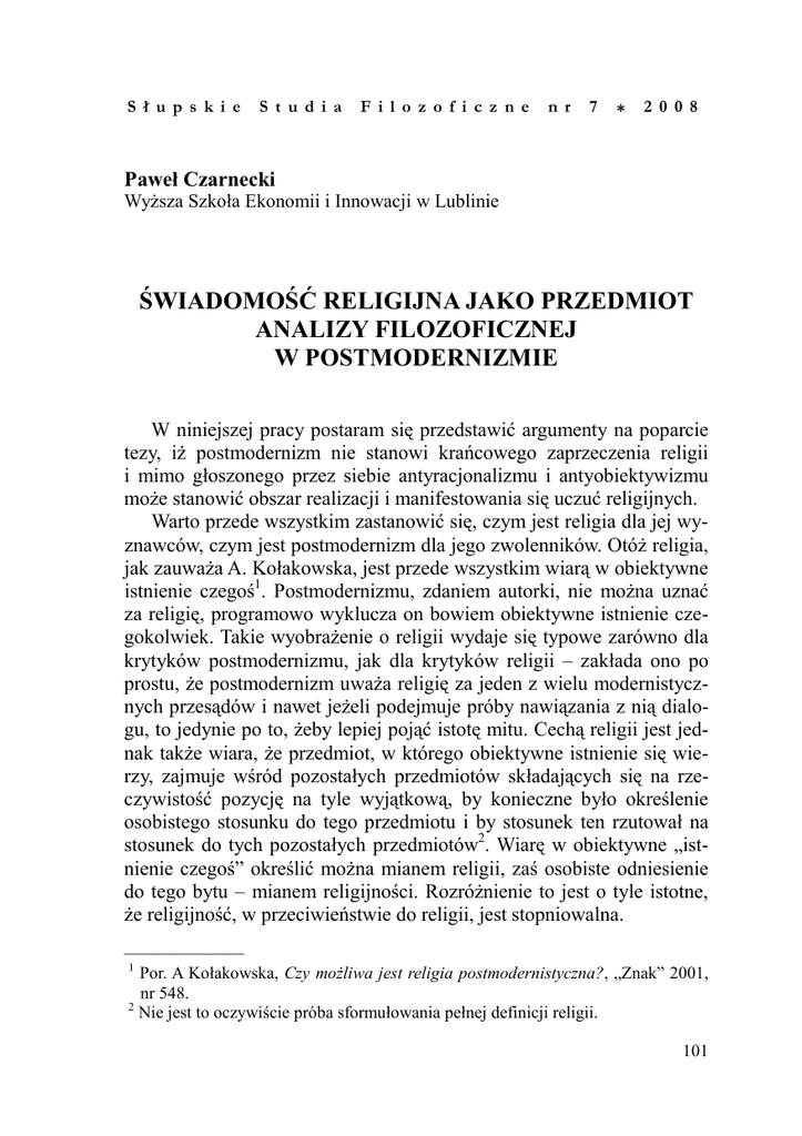 S ł u p s k i e S t u d i a F i l o z o f i c z n e n r 7 * 2 0 0 8 Paweł Czarnecki WyŜsza Szkoła Ekonomii i Innowacji w Lublinie ŚWIADOMOŚĆ RELIGIJNA JAKO PRZEDMIOT ANALIZY FILOZOFICZNEJ W POSTMODERNIZMIE W niniejszej pracy postaram się przedstawić argumenty na poparcie tezy, iŜ postmodernizm nie stanowi krańcowego zaprzeczenia religii i mimo głoszonego przez siebie antyracjonalizmu i antyobiektywizmu moŜe stanowić obszar realizacji i manifestowania się uczuć religijnych. Warto przede wszystkim zastanowić się, czym jest religia dla jej wyznawców, czym jest postmodernizm dla jego zwolenników. OtóŜ religia, jak zauwaŜa A. Kołakowska, jest przede wszystkim wiarą w obiektywne istnienie czegoś1. Postmodernizmu, zdaniem autorki, nie moŜna uznać za religię, programowo wyklucza on bowiem obiektywne istnienie czegokolwiek. Takie wyobraŜenie o religii wydaje się typowe zarówno dla krytyków postmodernizmu, jak dla krytyków religii – zakłada ono po prostu, Ŝe postmodernizm uwaŜa religię za jeden z wielu modernistycznych przesądów i nawet jeŜeli podejmuje próby nawiązania z nią dialogu, to jedynie po to, Ŝeby lepiej pojąć istotę mitu. Cechą religii jest jednak takŜe wiara, Ŝe przedmiot, w którego obiektywne istnienie się wierzy, zajmuje wśród pozostałych przedmiotów składających się na rzeczywistość pozycję na tyle wyjątkową, by konieczne było określenie osobistego stosunku do tego przedmiotu i by stosunek ten rzutował na stosunek do tych pozostałych przedmiotów2. Wiarę w obiektywne „istnienie czegoś” określić moŜna mianem religii, zaś osobiste odniesienie do tego bytu – mianem religijności. RozróŜnienie to jest o tyle istotne, Ŝe religijność, w przeciwieństwie do religii, jest stopniowalna. ——————— 1 Por. A Kołakowska, Czy moŜliwa jest religia postmodernistyczna?, „Znak” 2001, nr 548. 2 Nie jest to oczywiście próba sformułowania pełnej definicji religii. 101 Postmodernizm z kolei wyrasta z przekonania, Ŝe oparta na racjonalizmie nowoczesność wyczerpała się i nie potrafi juŜ zaoferować człowiekowi niczego, co zaspokajałoby jego autentyczne potrzeby. Postmodernizm jest zatem próbą poszukiwania alternatywy dla tak pojętej nowoczesności, nie zaś, jak twierdzi np. E. Gellner, jedynie intelektualną modą. Stanowi on pewien etap w rozwoju kultury europejskiej, wyrasta z określonych przyczyn, a jego popularność wśród części intelektualistów wynika nie tyle z chęci schlebiania modnym trendom, ile z faktu, iŜ brak jest dla postmodernizmu powaŜnej alternatywy. Alternatywą taką moŜe być albo racjonalizm albo religia. Zdaniem E. Gellnera, autora ksiąŜki Postmodernizm, rozum, religia3, we współczesnym świecie istnieją trzy niesprowadzalne do siebie i konkurencyjne postawy: racjonalizm, religia oraz postmodernizm. Teza ta wydaje się słuszna jedynie częściowo. Wprawdzie ani jednej z owych trzech postaw nie moŜna sprowadzić do Ŝadnej z pozostałych, jeŜeli jednak zechcielibyśmy określić podobieństwa i róŜnice pomiędzy nimi i na tej podstawie ustalić ich odległość względem siebie, to okazałoby się, Ŝe odległość pomiędzy racjonalizmem z jednej strony a postmodernizmem i religią z drugiej jest znacznie większa niŜ róŜnica pomiędzy religią a postmodernizmem4. Dzieje się tak dlatego, Ŝe postmodernizm i religia są przejawem tej samej, właściwej człowiekowi (i bynajmniej nie antyracjonalistycznej) tendencji, aby klucza do zrozumienia rzeczywistości poszukiwać nie w świecie zewnętrznym, lecz we własnym wnętrzu, w samym podmiocie. JeŜeli powyŜsza teza jest słuszna, to znaczy to, Ŝe postmodernizm i religia wyrastają z tego samego źródła i Ŝe w związku z tym dostrzec moŜna pomiędzy nimi wiele istotnych podobieństw, widocznych zresztą juŜ na poziomie języka. Redakcja miesięcznika „Znak” w numerze poświeconym relacjom pomiędzy postmodernizmem a religią zauwaŜa: „Przedstawiciele tak popularnego we współczesnej kulturze nurtu umownie zwanego postmodernizmem coraz częściej sięgają po metafory zaczerpnięte z religii. Nawiązują na przykład do tradycji «teologii negatywnej», powołują się na mistyków itp.”. Oczywiście samo posługiwanie się pojęciami zaczerpniętymi z teologii nie świadczy jeszcze o zainteresowaniu postmodernistów religią (ani tym bardziej o pozytywnym nastawieniu do niej), jednak sama moŜliwość uŜycia tych sa——————— 3 E. Gellner, Postmodernizm, rozum, religia, przekł. M. Kowalczuk, Warszawa 1997. 4 Trudno więc zgodzić się z E. Gellnerem, który stwierdza: „Owe trzy zasadnicze postawy rozdziela równa odległość. Tworzy się zatem dość symetryczny układ”. Por. E. Gellner, Postmodernizm..., s. 9. 102 mych pojęć do wyraŜania wizji świata uwaŜanych na ogół za krańcowo od siebie odległe wskazuje, Ŝe odległość ta, w pewnych przynajmniej obszarach, moŜe być bardzo mała. Ponadto podstawowe załoŜenie postmodernizmu, zgodnie z którym w XX wieku rozpadły się najwaŜniejsze paradygmaty („metanarracje”) europejskiej kultury (postmoderniści mają ma tu jednak na myśli przede wszystkim jeden paradygmat, oświeceniowy5), które to paradygmaty określały religie jako wygodne i poŜyteczne złudzenie, pozwoliło na przewartościowanie stosunku filozofii postmodernizmu do religii i ponowne odkrycie jej „wiarygodności”. Postmodernizm otwiera więc, według tego przekonania, pierwszą w dziejach europejskiej filozofii moŜliwość swobodnej dyskusji o religii6. Otwartość postmodernizmu względem religii moŜna jednak wytłumaczyć takŜe w inny sposób. Skoro upadek wiary w podstawowe idee oświecenia leŜy u podstaw postmodernistycznego antyracjonalizmu, to podjęcie wolnej od uprzedzeń i dogmatycznych ograniczeń dyskusji o religii wypływać moŜe nie tyle z załoŜeń postmodernizmu, co z istoty religii, która równieŜ, po