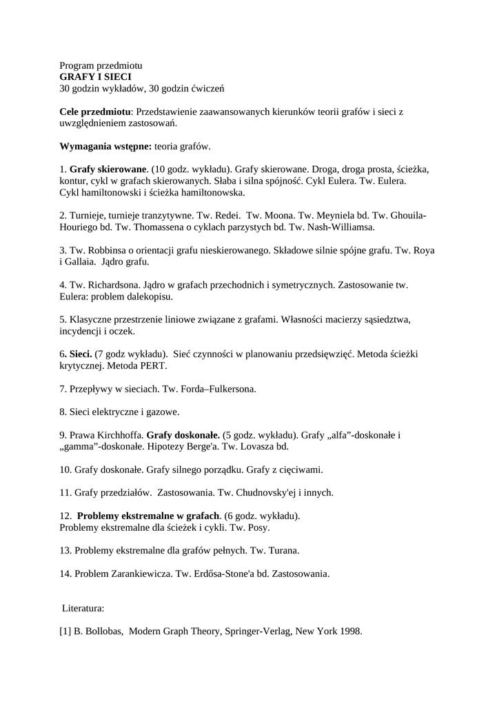 Program przedmiotu GRAFY I SIECI 30 godzin wykładów, 30 godzin ćwiczeń Cele przedmiotu: Przedstawienie zaawansowanych kierunków teorii grafów i sieci z uwzględnieniem zastosowań. Wymagania wstępne: teoria grafów. 1. Grafy skierowane. (10 godz. wykładu). Grafy skierowane. Droga, droga prosta, ścieżka, kontur, cykl w grafach skierowanych. Słaba i silna spójność. Cykl Eulera. Tw. Eulera. Cykl hamiltonowski i ścieżka hamiltonowska. 2. Turnieje, turnieje tranzytywne. Tw. Redei. Tw. Moona. Tw. Meyniela bd. Tw. GhouilaHouriego bd. Tw. Thomassena o cyklach parzystych bd. Tw. Nash-Williamsa. 3. Tw. Robbinsa o orientacji grafu nieskierowanego. Składowe silnie spójne grafu. Tw. Roya i Gallaia. Jądro grafu. 4. Tw. Richardsona. Jądro w grafach przechodnich i symetrycznych. Zastosowanie tw. Eulera: problem dalekopisu. 5. Klasyczne przestrzenie liniowe związane z grafami. Własności macierzy sąsiedztwa, incydencji i oczek. 6. Sieci. (7 godz wykładu). Sieć czynności w planowaniu przedsięwzięć. Metoda ścieżki krytycznej. Metoda PERT. 7. Przepływy w sieciach. Tw. Forda–Fulkersona. 8. Sieci elektryczne i gazowe. 9. Prawa Kirchhoffa. Grafy doskonałe. (5 godz. wykładu). Grafy „alfa”-doskonałe i „gamma”-doskonałe. Hipotezy Berge'a. Tw. Lovasza bd. 10. Grafy doskonałe. Grafy silnego porządku. Grafy z cięciwami. 11. Grafy przedziałów. Zastosowania. Tw. Chudnovsky'ej i innych. 12. Problemy ekstremalne w grafach. (6 godz. wykładu). Problemy ekstremalne dla ścieżek i cykli. Tw. Posy. 13. Problemy ekstremalne dla grafów pełnych. Tw. Turana. 14. Problem Zarankiewicza. Tw. Erdősa-Stone'a bd. Zastosowania. Literatura: [1] B. Bollobas, Modern Graph Theory, Springer-Verlag, New York 1998. [2] J. A. Bondy and U.S.R. Murty, Graphs Theory with Applications, Macmillan. London, 1976. [3] N. Deo, Teoria grafów i jej zastosowania w technice i informatyce, PWN, W-wa 1980. [4] R. J. Wilson, Wprowadzenie do teorii grafów, PWN, W-wa 1985.