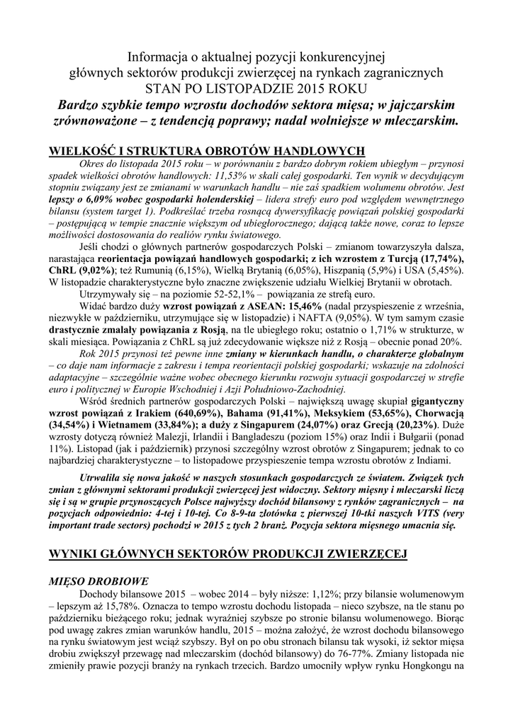 Informacja o aktualnej pozycji konkurencyjnej głównych sektorów produkcji zwierzęcej na rynkach zagranicznych STAN PO LISTOPADZIE 2015 ROKU Bardzo szybkie tempo wzrostu dochodów sektora mięsa; w jajczarskim zrównoważone – z tendencją poprawy; nadal wolniejsze w mleczarskim. WIELKOŚĆ I STRUKTURA OBROTÓW HANDLOWYCH Okres do listopada 2015 roku – w porównaniu z bardzo dobrym rokiem ubiegłym – przynosi spadek wielkości obrotów handlowych: 11,53% w skali całej gospodarki. Ten wynik w decydującym stopniu związany jest ze zmianami w warunkach handlu – nie zaś spadkiem wolumenu obrotów. Jest lepszy o 6,09% wobec gospodarki holenderskiej – lidera strefy euro pod względem wewnętrznego bilansu (system target 1). Podkreślać trzeba rosnącą dywersyfikację powiązań polskiej gospodarki – postępującą w tempie znacznie większym od ubiegłorocznego; dającą także nowe, coraz to lepsze możliwości dostosowania do realiów rynku światowego. Jeśli chodzi o głównych partnerów gospodarczych Polski – zmianom towarzyszyła dalsza, narastająca reorientacja powiązań handlowych gospodarki; z ich wzrostem z Turcją (17,74%), ChRL (9,02%); też Rumunią (6,15%), Wielką Brytanią (6,05%), Hiszpanią (5,9%) i USA (5,45%). W listopadzie charakterystyczne było znaczne zwiększenie udziału Wielkiej Brytanii w obrotach. Utrzymywały się – na poziomie 52-52,1% – powiązania ze strefą euro. Widać bardzo duży wzrost powiązań z ASEAN: 15,46% (nadal przyspieszenie z września, niezwykłe w październiku, utrzymujące się w listopadzie) i NAFTA (9,05%). W tym samym czasie drastycznie zmalały powiązania z Rosją, na tle ubiegłego roku; ostatnio o 1,71% w strukturze, w skali miesiąca. Powiązania z ChRL są już zdecydowanie większe niż z Rosją – obecnie ponad 20%. Rok 2015 przynosi też pewne inne zmiany w kierunkach handlu, o charakterze globalnym – co daje nam informacje z zakresu i tempa reorientacji polskiej gospodarki; wskazuje na zdolności adaptacyjne – szczególnie ważne wobec obecnego kierunku rozwoju sytuacji gospodarczej w strefie euro i politycznej w Europie Wschodniej i Azji Południowo-Zachodniej. Wśród średnich partnerów gospodarczych Polski – największą uwagę skupiał gigantyczny wzrost powiązań z Irakiem (640,69%), Bahama (91,41%), Meksykiem (53,65%), Chorwacją (34,54%) i Wietnamem (33,84%); a duży z Singapurem (24,07%) oraz Grecją (20,23%). Duże wzrosty dotyczą również Malezji, Irlandii i Bangladeszu (poziom 15%) oraz Indii i Bułgarii (ponad 11%). Listopad (jak i październik) przynosi szczególny wzrost obrotów z Singapurem; jednak to co najbardziej charakterystyczne – to listopadowe przyspieszenie tempa wzrostu obrotów z Indiami. Utrwaliła się nowa jakość w naszych stosunkach gospodarczych ze światem. Związek tych zmian z głównymi sektorami produkcji zwierzęcej jest widoczny. Sektory mięsny i mleczarski liczą się i są w grupie przynoszących Polsce najwyższy dochód bilansowy z rynków zagranicznych – na pozycjach odpowiednio: 4-tej i 10-tej. Co 8-9-ta złotówka z pierwszej 10-tki naszych VITS (very important trade sectors) pochodzi w 2015 z tych 2 branż. Pozycja sektora mięsnego umacnia się. WYNIKI GŁÓWNYCH SEKTORÓW PRODUKCJI ZWIERZĘCEJ MIĘSO DROBIOWE Dochody bilansowe 2015 – wobec 2014 – były niższe: 1,12%; przy bilansie wolumenowym – lepszym aż 15,78%. Oznacza to tempo wzrostu dochodu listopada – nieco szybsze, na tle stanu po październiku bieżącego roku; jednak wyraźniej szybsze po stronie bilansu wolumenowego. Biorąc pod uwagę zakres zmian warunków handlu, 2015 – można założyć, że wzrost dochodu bilansowego na rynku światowym jest wciąż szybszy. Był on po obu stronach bilansu tak wysoki, iż sektor mięsa drobiu zwiększył przewagę nad mleczarskim (dochód bilansowy) do 76-77%. Zmiany listopada nie zmieniły prawie pozycji branży na rynkach trzecich. Bardzo umocniły wpływ rynku Hongkongu na dochody, a z mniej znaczących – egipskiego. Unijna konkurencja utrzymuje nieznaczącą pozycję na naszym rynku; innej – praktycznie brak. Konkurenci na polskim rynku mięsa drobiowego zyskują jedynie symboliczne dochody. WOŁOWINA Dochód bilansowy 2015 rósł, wobec roku 2014 – pozwalając osiągnąć wynik w porównaniu z sektorem mleka lepszy; i to w granicach 1/3. Po październiku bilans wolumenowy był o 13,33% lepszy – na tle 2014. Tempo wzrostu dochodu bilansowego – na tle września – wzrosło o 2,25%. Rola rynków trzecich w tworzeniu dochodu branży na rynkach zagranicznych wzrosła (na poziomie 11-12%). Konkurenci na polskim rynku wołowiny zyskiwali niecałe 2% dochodu naszego sektora wołowiny na rynkach zagranicznych. O niewielkiej poprawie swoich pozycji na naszym rynku – mogą mówić konkurenci nadbałtyccy i z MERCOSUR. Wyników listopadowych dotąd nie znamy w pełni. Z danych pośrednich można jednak wnosić dalszą poprawę sytuacji branży – na tle okresu do października 2015. MLEKO O wysokim poziomie dodatniego bilansu wolumenowego – o 14,01% lepszego niż w 2014 – trzeba wspomnieć na początku; zdając sobie sprawę z niższego (na tle 2014) dochodu bilansowego, o 38,43%. Taka sytuacja ma związek z wpływem krajowego rynku i końcem limitowania produkcji, ale wobec dużych zmian warunków handlu – nie jest wcale tak jednoznaczna. Pogorszenie wyniku listopadowe jest wątpliwe; minimalnie dotyczy to bilansu wolumenowego. Istotny szczegół obrazu wyników (2015) branży mlecznej na rynku światowym – to niemalże eliminacja konkurencji spoza UE na naszym rynku mleka, a jednocześnie wzrost udziału rynków trzecich w tworzeniu dochodu – do ponad 53%. Z kolei konkurencja unijna w listopadzie wzmocniła się nieco – zyskując obecnie na naszym rynku blisko 19% dochodu polskiego sektora mleka na rynkach zagranicznych; niepokoi tu zwłaszcza umocnienie się holenderskich konkurentów, na drugim planie 