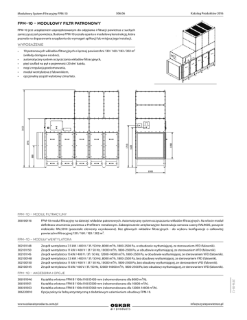 3153 1710 1628 1991 Katalog Produktów 2016 1090 306.06 Modułowy System Filtracyjny FPM-10 888 FPM-10 - modułowy filtr patronowy FPM-10 jest urządzeniem zaprojektowanym do odpylania i filtracji powietrza z suchych zanieczyszczeń powietrza. Budowa FPM-10 została oparta o modułową konstrukcję, która pozwala na dopasowanie urządzenia do wymagań aplikacji lub miejsca jego instalacji. 3050 2752 wyposażenie Opis: Stacjonarny filtr modułowy FPM-10 o wydajności nomin 10 000 m³/h. Wyposażony w 10 patronowych wkładów głównych z włókniny poliestrowej. Oczyszczanie wkładó filtracyjnych uruchamiane przez automatyczny system regeneracji - sekwencyjny timer bez pomiaru różnicy ci pomiędzy stroną czystą a brudną. 10 patronowych wkładów filtracyjnych o łącznej powierzchni 130 / 160 / 183 / 302 m² (wkłady dostępne osobno), automatyczny system oczyszczania wkładów filtracyjnych, pięć szuflad na pył o pojemności 20 dm³ każda, nogi z regulacją poziomowania, moduł wentylatora z falownikiem, opcjonalny zespół wylotowy zima/lato. 1125 • • • • • www.oskarairproducts.com ● info@oskarairproducts. 1652 1168 • 1090 Zespoły składowe: - 100.116 FPM-10 - 101.239 Komora wentylatora FPM-6 11kW - 101.844 Zespół zasilania FPM-10 11kW STR - 10 x 242.077 Filtr Patronowy Camfil Gold Cone Wszystkie wymiary podane są w mm Menegon Sp z o.o. Mokry Dwór 6C 80-021 Wiślina Polska tel.: +48 58 3012838 fax +48 58 3059324 [email protected] www.menegon.com.pl 1090 1710 888 1628 1991 3153 Wszelkie prawa zastrzeżone. Dokument ten oraz zawarte w nim pr dane techniczne, a także znaki towarowe podlegają ochronie i poz właśnością Menegon Sp. z o.o. Producent zastrzega sobie praw wprowadzania zmian konstrukcyjnych bez wcześniejszego uprzed 1090 3050 2752 www.oska 1652 Opis: 1125 1168 Stacjonarny fil 10 000 m³/h. głównych z wł filtracyjnych u regeneracji - s pomiędzy stro Zespoły skład FPM-10 - moduł filtracyjny 306100116 - FPM-10 moduł filtracyjny na dziesięć wkładów patronowych. Automatyczny system oczyszczania wkładów filtracyjnych. Na wlocie moduł deflektora strumienia powietrza z Prefiltrem metalowym. Zabezpieczenie antykorozyjne: konstrukcja ramowa czarny RAL9005, poszycie niebieskie RAL5010 (pozostałe elementy ocynkowane). Bez głównych wkładów filtracyjnych - do wyboru konfiguracje o całkowitej powierzchni filtracyjnej 130 / 160 / 183 / 302 m². W Mo tel.: info@ FPM-10 - moduły wentylatora 302101148 302101150 302101145 302100148 302100150 302100145 Zespół wentylatora 7,5 kW / 400 V / 3f / 50 Hz, 8000 m³/h, 1800-2500 Pa, w obudowie wytłumiającej, ze sterowaniem VFD (falownik). Zespół wentylatora 11 kW / 400 V / 3f / 50 Hz, 10000 m³/h, 1800-2500 Pa, w obudowie wytłumiającej, ze sterowaniem VFD (falownik). Zespół wentylatora 15 kW / 400 V / 3f / 50 Hz, 12000-14000 m³/h, 1800-2500 Pa, w obudowie wytłumiającej, ze sterowaniem VFD (falownik). Zespół wentylatora 7,5 kW / 400 V / 3f / 50 Hz, 8000 m³/h, 1800-2500 Pa, bez obudowy wytłumiającej, ze sterowaniem VFD (falownik). Zespół wentylatora 11 kW / 400 V / 3f / 50 Hz, 10000 m³/h, 1800-2500 Pa, bez obudowy wytłumiającej, ze sterowaniem VFD (falownik). Zespół wentylatora 15 kW / 400 V / 3f / 50 Hz, 12000-14000 m³/h, 1800-2500 Pa, bez obudowy wytłumiającej, ze sterowaniem VFD (falownik). Wszelkie praw dane technic właśnością wprowadzan FPM-10 - akcesoria i opcje Kształtka wlotowa FPM B 1100x1100 D450 mm (rekomendowana dla 8000 m³/h). Kształtka wlotowa FPM B 1100x1100 D500 mm (rekomendowana dla 10000 m³/h). Kształtka wlotowa FPM B 1100x1100 D560 mm (rekomendowana dla 12000-14000 m³/h). Opcja pokrycia farbą antystatyczną z dodatkowym uziemieniem obudowy FPM-10. www.oskarairproducts.com/pl 2016-05-12 306101046 306101951 306101053 306220010 100.116 FPM 101.239 Kom 101.844 Zes 10 x 242.07 [email protected]