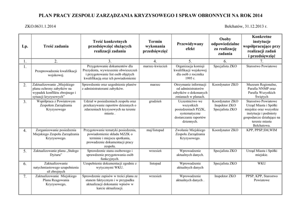 PLAN PRACY ZESPOŁU ZARZĄDZANIA KRYZYSOWEGO I SPRAW OBRONNYCH NA ROK 2014 ZKO.0631.1.2014 Bełchatów, 31.12.2013 r. Treść konkretnych przedsięwzięć służących realizacji zadania Termin wykonania przedsięwzięć Przewidywany efekt Konkretne Osoby instytucje odpowiedzialne współpracujące przy za realizację realizacji zadań zadania i przedsięwzięć 6. 7. Lp. Treść zadania 1. 1. 2. 3. 4. 5. marzec-kwiecień Organizacja komisji kwalifikacji wojskowej dla osób z rocznika 1995 r. Specjalista ZKO Starostwo Powiatowe Przeprowadzenie kwalifikacji wojskowej. Przygotowanie dokumentów dla Prezydenta, wywieszenie obwieszczeń i przygotowanie list osób objętych kwalifikacją oraz ich powiadomienie Sprawdzenie oraz uzgodnienie planów z administratorami zabytków. marzec Koordynator ZKO Udział w posiedzeniach zespołu oraz przekazywanie raportów dziennych o zdarzeniach kryzysowych na terenie miasta . grudzień Otrzymanie informacji od administratorów zabytków o dokonanych zmianach w planach. Uczestnictwo we wszystkich posiedzeniach PZZK, systematyczne dostarczanie raportów dziennych. Przygotowanie tematyki posiedzenia, powiadomienie składu MZZK o terminie i miejscu spotkania, prowadzenie dokumentacji pracy zespołu. Sprawdzenie stanu osobowego i sprawdzenie przygotowania osób funkcyjnych. Uzupełnienie dokumentacji zgodnie z wytycznymi WKU. maj/listopad Zwołanie Miejskiego Zespołu Zarządzania Kryzysowego. Koordynator ZKO Muzeum Regionalne, Parafia NNMP oraz Parafia Wszystkich Świętych Starostwo Powiatowe Urząd Miasta i Spółki miejskie oraz wszystkie instytucje i podmioty gospodarcze działające na terenie miasta Bełchatowa. KPP, PPSP,SM,WIM wrzesień Wprowadzenie aktualnych danych. Specjalista ZKO Urząd Miasta i Spółki miejskie. listopad Wprowadzenie aktualnych danych Specjalista ZKO WKU Sprawdzenie zapisów w treści planu ze stanem faktycznym i w przypadku aktualizacji dokonanie wpisów w karcie aktualizacji. wrzesień Wprowadzenie aktualnych danych . Inspektor ZKO PPSP, KPP, Starostwo Powiatowe 2. 3. Zaktualizowanie „Miejskiego planu ochrony zabytków na wypadek konfliktu zbrojnego i sytuacji kryzysowych” Współpraca z Powiatowym Zespołem Zarządzania Kryzysowego 4. Zorganizowanie posiedzenia Miejskiego Zespołu Zarządzania Kryzysowego. 5. Zaktualizowanie planu „Stałego Dyżuru” 6. Zaktualizowanie natychmiastowego uzupełnienia sił zbrojnych Zaktualizowanie Miejskiego Planu Reagowania Kryzysowego, 7. Koordynator ZKO Inspektor ZKO Specjalista ZKO 8. Aktualizacja bazy danych „Arcus 2005” Łódzkiego Urzędu Wojewódzkiego Działanie zgodnie z wytycznymi Łódzkiego Urzędu Wojewódzkiego. grudzień Wprowadzenie aktualnych danych . Inspektor ZKO 9. Przeprowadzenie oraz udział w szkoleniach obronnych oraz ćwiczeniach dotyczących sposobu reagowania w sytuacjach kryzysowych w obiektach użyteczności publicznej z udziałem PSP. Działanie zgodnie z planami szkoleń obronnych miasta, starostwa i województwa oraz planami pracy poszczególnych zespołów zarządzania kryzysowego. grudzień Przeprowadzanie szkoleń i udział w ćwiczeniach w ciągu całego roku. Koordynator ZKO Pracownicy ZKO 10. Zabezpieczenie gotowości bojowej jednostek OSP Planowanie środków na zabezpieczenie i kontrola ich racjonalnego wykorzystania. grudzień Zachowanie dyscypliny Koordynator ZKO Inspektor ZKO finansowej i merytorycznej przy wykorzystywaniu środków 11. Przygotowanie dokumentacji dotyczących imprez masowych i zgromadzeń publicznych Przyjmowanie wniosków o przeprowadzenie poszczególnych imprez, przygotowanie materiałów do decyzji administracyjnej Prezydenta Miasta oraz przeprowadzanie kontroli w/w. grudzień Dostarczenie decyzji i kontrola ich realizacji. Koordynator ZKO Inspektor ZKO Wszystkie instytucje i podmioty gospodarcze działające na terenie miasta Bełchatowa. PSP, administratorzy obiektów, Starostwo OSP-Bełchatów, OSP-BełchatówGrocholice KPP, KPPSP, NZOZ