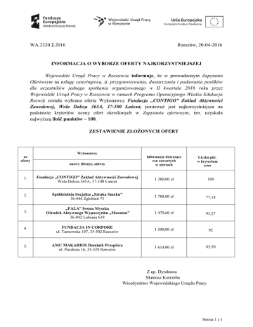 Rzeszów, 20-04-2016 WA.2320.2.2016 INFORMACJA O WYBORZE OFERTY NAJKORZYSTNIEJSZEJ Wojewódzki Urząd Pracy w Rzeszowie informuje, że w prowadzonym Zapytaniu Ofertowym na usługę cateringową, tj. przygotowywania, dostarczania i podawania posiłków dla uczestników jednego spotkania organizowanego w II kwartale 2016 roku przez Wojewódzki Urząd Pracy w Rzeszowie w ramach Programu Operacyjnego Wiedza Edukacja Rozwój została wybrana oferta Wykonawcy Fundacja „CONTIGO” Zakład Aktywności Zawodowej, Wola Dalsza 365A, 37-100 Łańcut, ponieważ jest najkorzystniejsza na podstawie kryteriów oceny ofert określonych w Zapytaniu ofertowym, tzn. uzyskała najwyższą ilość punktów – 100. ZESTAWIENIE ZŁOŻONYCH OFERT Wykonawcy nr oferty informacje dotyczące cen zawartych w ofertach nazwy (firmy), adresy Liczba pkt. w kryterium cena 1. Fundacja „CONTIGO” Zakład Aktywności Zawodowej Wola Dalsza 365A, 37-100 Łańcut 1 380,00 zł 100 2. Spółdzielnia Socjalna „Sztuka Smaku” 36-046 Zgłobień 73 1 788,00 zł 77,18 3. „FALA” Iwona Myszka Ośrodek Aktywnego Wypoczynku „Maraton” 36-042 Lubenia 618 1 479,60 zł 93,27 4. FUNDACJA IN CORPORE ul. Tarnowska 107, 35-502 Rzeszów 1 500,00 zł 92 5. AMC MAKARIOS Dominik Przepióra ul. Puszkina 16, 35-328 Rzeszów 1 614,00 zł 85,50 Z up. Dyrektora Mateusz Kutrzeba Wicedyrektor Wojewódzkiego Urzędu Pracy Strona 1 z 1