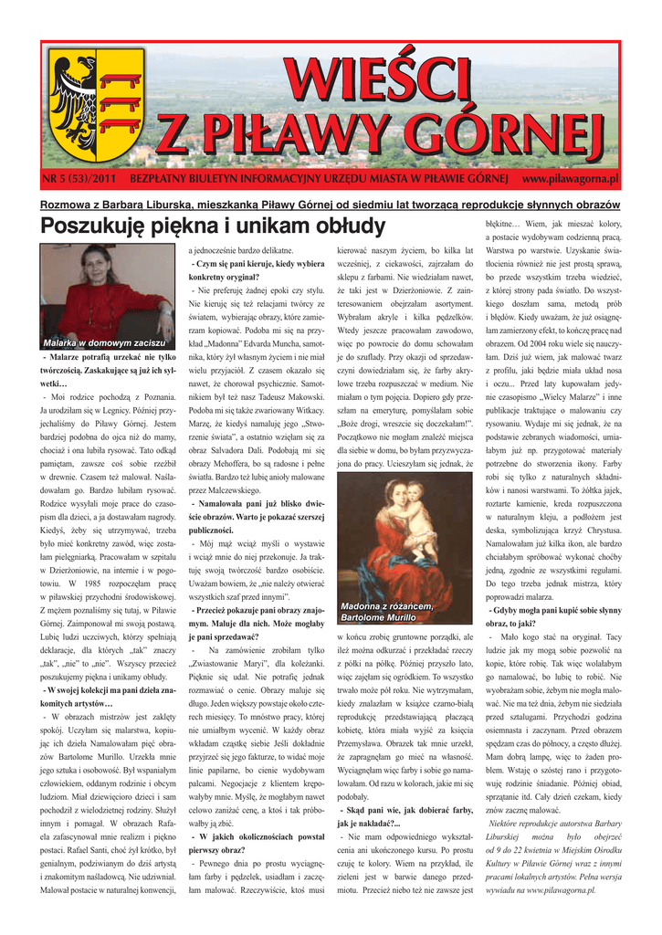 WIEŚCI Z PIŁAWY GÓRNEJ NR 5 (53)/2011 BEZPŁATNY BIULETYN INFORMACYJNY URZĘDU MIASTA W PIŁAWIE GÓRNEJ www.pilawagorna.pl Rozmowa z Barbarą Liburską, mieszkanką Piławy Górnej od siedmiu lat tworzącą reprodukcje słynnych obrazów Poszukuję piękna i unikam obłudy Malarka w domowym zaciszu - Malarze potrafią urzekać nie tylko twórczością. Zaskakujące są już ich sylwetki… - Moi rodzice pochodzą z Poznania. Ja urodziłam się w Legnicy. Później przyjechaliśmy do Piławy Górnej. Jestem bardziej podobna do ojca niż do mamy, chociaż i ona lubiła rysować. Tato odkąd pamiętam, zawsze coś sobie rzeźbił w drewnie. Czasem też malował. Naśladowałam go. Bardzo lubiłam rysować. Rodzice wysyłali moje prace do czasopism dla dzieci, a ja dostawałam nagrody. Kiedyś, żeby się utrzymywać, trzeba było mieć konkretny zawód, więc zostałam pielęgniarką. Pracowałam w szpitalu w Dzierżoniowie, na internie i w pogotowiu. W 1985 rozpoczęłam pracę w piławskiej przychodni środowiskowej. Z mężem poznaliśmy się tutaj, w Piławie Górnej. Zaimponował mi swoją postawą. Lubię ludzi uczciwych, którzy spełniają deklaracje, dla których „tak” znaczy „tak”, „nie” to „nie”. Wszyscy przecież poszukujemy piękna i unikamy obłudy. - W swojej kolekcji ma pani dzieła znakomitych artystów… - W obrazach mistrzów jest zaklęty spokój. Uczyłam się malarstwa, kopiując ich dzieła Namalowałam pięć obrazów Bartolome Murillo. Urzekła mnie jego sztuka i osobowość. Był wspaniałym człowiekiem, oddanym rodzinie i obcym ludziom. Miał dziewięcioro dzieci i sam pochodził z wielodzietnej rodziny. Służył innym i pomagał. W obrazach Rafaela zafascynował mnie realizm i piękno postaci. Rafael Santi, choć żył krótko, był genialnym, podziwianym do dziś artystą i znakomitym naśladowcą. Nie udziwniał. Malował postacie w naturalnej konwencji, a jednocześnie bardzo delikatne. - Czym się pani kieruje, kiedy wybiera konkretny oryginał? - Nie preferuję żadnej epoki czy stylu. Nie kieruję się też relacjami twórcy ze światem, wybierając obrazy, które zamierzam kopiować. Podoba mi się na przykład „Madonna” Edvarda Muncha, samotnika, który żył własnym życiem i nie miał wielu przyjaciół. Z czasem okazało się nawet, że chorował psychicznie. Samotnikiem był też nasz Tadeusz Makowski. Podoba mi się także zwariowany Witkacy. Marzę, że kiedyś namaluję jego „Stworzenie świata”, a ostatnio wzięłam się za obraz Salvadora Dali. Podobają mi się obrazy Mehoffera, bo są radosne i pełne światła. Bardzo też lubię anioły malowane przez Malczewskiego. - Namalowała pani już blisko dwieście obrazów. Warto je pokazać szerszej publiczności. - Mój mąż wciąż myśli o wystawie i wciąż mnie do niej przekonuje. Ja traktuję swoją twórczość bardzo osobiście. Uważam bowiem, że „nie należy otwierać wszystkich szaf przed innymi”. - Przecież pokazuje pani obrazy znajomym. Maluje dla nich. Może mogłaby je pani sprzedawać? Na zamówienie zrobiłam tylko „Zwiastowanie Maryi”, dla koleżanki. Pięknie się udał. Nie potrafię jednak rozmawiać o cenie. Obrazy maluje się długo. Jeden większy powstaje około czterech miesięcy. To mnóstwo pracy, której nie umiałbym wycenić. W każdy obraz wkładam cząstkę siebie Jeśli dokładnie przyjrzeć się jego fakturze, to widać moje linie papilarne, bo cienie wydobywam palcami. Negocjacje z klientem krępowałyby mnie. Myślę, że mogłabym nawet celowo zaniżać cenę, a ktoś i tak próbowałby ją zbić. - W jakich okolicznościach powstał pierwszy obraz? - Pewnego dnia po prostu wyciągnęłam farby i pędzelek, usiadłam i zaczęłam malować. Rzeczywiście, ktoś musi kierować naszym życiem, bo kilka lat wcześniej, z ciekawości, zajrzałam do sklepu z farbami. Nie wiedziałam nawet, że taki jest w Dzierżoniowie. Z zainteresowaniem obejrzałam asortyment. Wybrałam akryle i kilka pędzelków. Wtedy jeszcze pracowałam zawodowo, więc po powrocie do domu schowałam je do szuflady. Przy okazji od sprzedawczyni dowiedziałam się, że farby akrylowe trzeba rozpuszczać w medium. Nie miałam o tym pojęcia. Dopiero gdy przeszłam na emeryturę, pomyślałam sobie „Boże drogi, wreszcie się doczekałam!”. Początkowo nie mogłam znaleźć miejsca dla siebie w domu, bo byłam przyzwyczajona do pracy. Ucieszyłam się jednak, że Madonna z różańcem, Bartolome Murillo w końcu zrobię gruntowne porządki, ale ileż można odkurzać i przekładać rzeczy z półki na półkę. Później przyszło lato, więc zajęłam się ogródkiem. To wszystko trwało może pół roku. Nie wytrzymałam, kiedy znalazłam w książce czarno-białą reprodukcję przedstawiającą płaczącą kobietę, która miała wyjść za księcia Przemysława. Obrazek tak mnie urzekł, że zapragnęłam go mieć na własność. Wyciągnęłam więc farby i sobie go namalowałam. Od razu w kolorach, jakie mi się podobały. - Skąd pani wie, jak dobierać farby, jak je nakładać?... - Nie mam odpowiedniego wykształcenia ani ukończonego kursu. Po prostu czuję te kolory. Wiem na przykład, ile zieleni jest w barwie danego przedmiotu. Przecież niebo też nie zawsze jest błękitne… Wiem, jak mieszać kolory, a postacie wydobywam codzienną pracą. Warstwa po warstwie. Uzyskanie światłocienia również nie jest prostą sprawą, bo przede wszystkim trzeba wiedzieć, z której strony pada światło. Do wszystkiego doszłam sama, metodą prób i błędów. Kiedy uważam, że już osiągnęłam zamierzony efekt, to kończę pracę nad obrazem. Od 2004 roku wiele się nauczyłam. Dziś już wiem, jak malować twarz z profilu, jaki będzie miała układ nosa i oczu... Przed laty kupowałam jedynie czasopismo „Wielcy Malarze” i inne publikacje traktujące o malowaniu czy rysowaniu. Wydaje mi się jednak, że na podstawie zebranych wiadomości, um