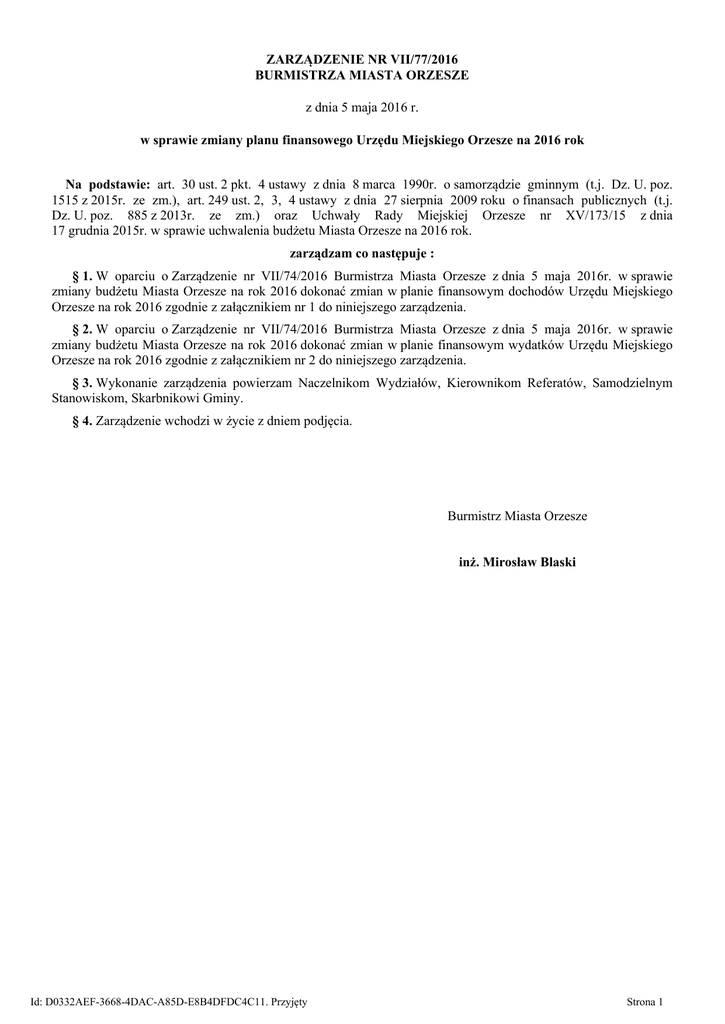 ZARZĄDZENIE NR VII/77/2016 BURMISTRZA MIASTA ORZESZE z
