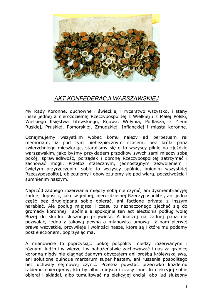 AKT KONFEDERACJI WARSZAWSKIEJ My Rady Koronne, duchowne i świeckie, i rycerstwo wszystko, i stany insze jednej a nierozdzielnej Rzeczypospolitej z Wielkiej i z Małej Polski, Wielkiego Księstwa Litewskiego, Kijowa, Wołynia, Podlasza, z Ziemi Ruskiej, Pruskiej, Pomorskiej, Zmudzkiej, Inflanckiej i miasta koronne. Oznajmujemy wszystkim wobec komu należy ad perpetuam rei memoriam, iż pod tym niebezpiecznym czasem, bez króla pana zwierzchniego mieszkając, staraliśmy się o to wszyscy pilnie na zjeździe warszawskim, jako byśmy przykładem przodków swych sami miedzy sobą pokój, sprawiedliwość, porządek i obronę Rzeczypospolitej zatrzymać i zachować mogli. Przetoż statecznym, jednostajnym zezwoleniem i świętym przyrzeczenim sobie to wszyscy spólnie, imienim wszystkiej Rzeczypospolitej, obiecujemy i obowięzujemy się pod wiarą, poczciwością i sumnienim naszym. Naprzód żadnego rozerwania między sobą nie czynić, ani dysmembracyjej żadnej dopuścić, jako w jednej, nierozdzielnej Rzeczypospolitej, ani jedna część bez drugiejpana sobie obierać, ani factione privata z inszym narabiać. Ale podług miejsca i czasu tu naznaczonego zjechać się do gromady koronnej i spólnie a spokojnie ten act electionis podług wolej Bożej do skutku słusznego przywieść. A inaczej na żadnej pana nie pozwalać, jedno z takową pewną a mianowitą umową: iż nam pierwej prawa wszystkie, przywileje i wolności nasze, które są i które mu podamy post electionem, poprzysiąc ma. A mianowicie to poprzysiąc: pokój pospolity miedzy rozerwanymi i różnymi ludźmi w wierze i w nabożeństwie zachowywać i nas za granicę koronną nigdy nie ciągnąć żadnym obyczajem ani prośbą królewską swą, ani solutione quinque marcarum super hastam, ani ruszenia pospolitego bez uchwały sejmowej czynić. Przetoż powstać przeciwko kożdemu takiemu obiecujemy, kto by albo miejsca i czasy inne do elekcyjej sobie obierał i składał, albo tumultować na elekcyjej chciał, abo lud służebny 1 privatam przyjmował, albo elekcyjej onej zgodnie od wszystkich conclusae sprzeciwiać się śmiał. A iż w Rzeczypospolitej naszej jest dissidium niemałe in causa religionis christianae, zabiegając temu, aby się z tej przyczyny miedzy ludźmi sedycja jaka szkodliwa nie wszczęła, którą po inszych królestwach jaśnie widziemy, obiecujemy to spólnie, pro nobis et successoribus nostris in perpetuum, sub vinculo iuramenti, fide, honore et conscientiis nostris, iż którzy jestechmy dissidentes de religione, pokój miedzy sobą zachować, a dla różnej wiary i odmiany w Kościelech krwie nie przelewać, ani się penować confiscatione bonorum, poczciwością, carceribus et exilio, i zwierzchności żadnej ani urzędowi do takowego progressu żadnym sposobem nie pomagać. I owszem, gdzie by ją kto przelewać chciał, ex ista causa zastawiać się o to wszyscy będziem powinni, choćby też za pretekstem dekretu albo za postępkiem jakim sądowym kto to czynić chciał. Wszakże przez tę konfederacyją naszę zwierzchności żadnej nad poddanymi ich, tak panów duchownych, jako i świeckich, nie derogujemy i posłuszeństwa żadnego poddanych przeciwko panom ich nie psujemy. I owszem, jeśliby takowa licencyja gdzie była sub praetextu religionis, tedy jako zawsze buło, będzie wolno i teraz każdemu panu poddanego swego nieposłusznego tam in spiritualibus, quam in saecularibus podług rozumienia swego skarać. Aby wszystki beneficia iuris patronatus Regii praelaturarum, ecclesiasticarum, jako arcybiskupstw, biskupstw i inszych wszelakich beneficyj były dawane nie inszym, jedno Rzymskiego Kościoła klerykom, indigenis Polonis iuxta statutum; beneficyja kościołów greckich ludziom tejże greckiej wiary dawane być mają. A iż to do pokojów wiele należy, aby dyferencyje inter status hamowane były, a miedzy stanem duchownym i świeckim jest niemała differentia de rebus politicis temporalibus, obiecujemy wszystki ty miedzy sobą componere na blisko przyszłym sejmie electionis. Sprawiedliwości porządek taki w mocy zachowujemy, jaki sobie które województwo doma spólnie postanowiło, albo jeszcze postanowi zgodnie, także i około obrony potrzebnej zamków pogranicznych. Któżkolwiek się komu o pewny dług zapisał i do grodu firma inscriptione odpowiadać się poddał dobrowolnie, bądź przed śmiercią, albo już i po śmierci królewskiej, takowy każdy podług zapisu swego niechaj progressum iuris usitatum cierpi. A panowie starostowie będą powinni vigore huius generalis confederationis, sine omni dilatione iuxta usitatam formam sądzić, odprawować i egzekwować takowe kauzy, oprócz tych województw, które sobie formam sprawiedliwości i egzekucejej specialem postanowili sub interregno abo jeszcze postanowić mają. 2 Inscriptiones wszelakie et resignationes bonorum perpetuas coram authenticis actis factus et fiendas sub interregno, spólnym tej konfederacyjej zezwoleniem umacniamy, aby sub interregno, począwszy od dnia śmierci królewskiej, nikomu in progressibus iuris fatalia albo praescriptio nie szkodziła na potem do sprawiedliwości jego. Także którzy mieli terminum brania pieniędzy na przeszłe Gody abo na Nowe Lato, abo na jaki czas już przeszły, ci wszyscy aby byli powinni brać swe pieniądze na pierwsze sądy, da-li Pan Bóg po obraniu nowego króla, albo na pierwsze leżenie ksiąg. Obiecujemy też to sobie, że na elekcyją naznaczoną jadąc, i na miejscu będący, i do domu się rozjeżdżając, gwałtu żadnego ludziom i sami między sobą czynić nie będziemy. Ty wszystki rzeczy obiecujem sobie i na potomki swe chować statecznie i trzymać sub fide, honore et conscientiis nostris. A kto by się temu sprzeciwiać chciał i pokój a porządek pospolity psować, contra talem omnes consurgemus in eius destructionem. A dla lepszej pewności tych wszystkich opisanych rzeczy przyłożyliśmy pieczęci swe do tego i rękoma własnymi podpisali. Actum Var