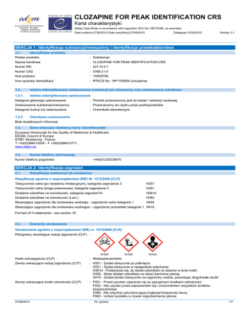 CLOZAPINE FOR PEAK IDENTIFICATION CRS Karta charakterystyki Safety Data Sheet in accordance with regulation (EC) No 1907/2006, as amended. Zastępuje:12/02/2015 Data wydania:27/06/2013 Data weryfikacji:27/08/2015 Wersja: 5.1 SEKCJA 1: Identyfikacja substancji/mieszaniny i identyfikacja przedsiębiorstwa 1.1. Identyfikator produktu Postać produktu : Substancja Nazwa handlowa : CLOZAPINE FOR PEAK IDENTIFICATION CRS Numer WE : 227-313-7 Numer CAS : 5786-21-0 Kod produktu : Y0000758 Inne sposoby identyfikacji : RTECS No : HP1750000 (clozapine) 1.2. Istotne zidentyfikowane zastosowania substancji lub mieszaniny oraz zastosowania odradzane 1.2.1. Istotne zidentyfikowane zastosowania Kategoria głównego zastosowania : Produkt przeznaczony jest do badań i edukacji naukowej. Zastosowanie substancji/mieszaniny : Przeznaczony do użytku przez profesjonalistów Kategoria funkcji lub zastosowania : Chemikalia laboratoryjne 1.2.2. Odradzane zastosowanie Brak dodatkowych informacji 1.3. Dane dotyczące dostawcy karty charakterystyki European Directorate for the Quality of Medicines & Healthcare EDQM, Council of Europe 67081 Strasbourg - France T +33(0)388412035 - F +33(0)388412771 www.edqm.eu 1.4. Numer telefonu alarmowego Numer telefonu pogotowia : +44(0)1235239670 SEKCJA 2: Identyfikacja zagrożeń 2.1. Klasyfikacja substancji lub mieszaniny Klasyfikacja zgodnie z rozporządzeniem (WE) Nr. 1272/2008 [CLP] Toksyczność ostra (po narażeniu inhalacyjnym), kategoria zagrożenia 3 H331 Toksyczność ostra (droga pokarmowa), kategoria zagrożenia 3 H301 Działanie szkodliwe na rozrodczość, kategoria zagrożeń1A H361d Dzialanie szkodliwe na rozrodczosc (Lact.) H362 Stwarzające zagrożenie dla środowiska wodnego - zagrożenie ostre kategoria 1 H400 Stwarzające zagrożenie dla środowiska wodnegoo - zagrożenie przewlekłe kategoria 1 H410 Full text of H statements : see section 16 2.2. Elementy oznakowania Oznakowanie zgodnie z rozporządzeniem (WE) nr. 1272/2008 [CLP] Extra labelling to displayExtra classification(s) to display Piktogramy określające rodzaj zagrożenia (CLP) : GHS06 GHS09 GHS08 Hasło ostrzegawcze (CLP) : Niebezpieczeństwo Zwroty wskazujące rodzaj zagrożenia (CLP) : H301 - Działa toksycznie po połknięciu H331 - Działa toksycznie w następstwie wdychania H361d - Podejrzewa się, że działa szkodliwie na dziecko w łonie matki H362 - Może działać szkodliwie na dzieci karmione piersią H410 - Działa bardzo toksycznie na organizmy wodne, powodując długotrwałe skutki Zwroty wskazujące środki ostrożności (CLP) : P201 - Przed użyciem zapoznać się ze specjalnymi środkami ostrożności P202 - Nie używać przed zapoznaniem się i zrozumieniem wszystkich środków bezpieczeństwa P260 - Nie wdychać pyłu/dymu/gazu/mgły/par/rozpylonej cieczy P263 - Unikać kontaktu w czasie ciąży/karmienia piersią 27/08/2015 PL (polski) 1/7 CLOZAPINE FOR PEAK IDENTIFICATION CRS Karta charakterystyki Safety Data Sheet in accordance with regulation (EC) No 1907/2006, as amended. P264 - Dokładnie umyć ręce oraz inne eksponowane okolice po użyciu P273 - Unikać uwolnienia do środowiska P281 - Stosować wymagane środki ochrony indywidualnej P301+P310 - W PRZYPADKU POŁKNIĘCIA: Natychmiast skontaktować się z OŚRODKIEM ZATRUĆ lub z lekarzem P304+P340 - W PRZYPADKU DOSTANIA SIĘ DO DRÓG ODDECHOWYCH: wyprowadzić lub wynieść poszkodowanego na świeże powietrze i zapewnić warunki do odpoczynku w pozycji umożliwiającej swobodne oddychanie P308+P313 - W przypadku narażenia lub styczności: Zasięgnąć porady/zgłosić się pod opiekę lekarza P330 - Wypłukać usta P391 - Zebrać wyciek P403+P233 - Przechowywać w dobrze wentylowanym miejscu. Przechowywać pojemnik szczelnie zamknięty P501 - Zawartość/pojemnik usuwać do : Odpady niebezpieczne. Należy przestrzegać obowiązujących rozporządzeń prawnych Zatyczka zabezpieczająca, zapobiegająca otworzeniu przez dzieci : Nie Tactile warning : Nie 2.3. Inne zagrożenia Inne zagrożenia mające wpływ na klasyfikację : Ekspozycja może spowodować reakcję alergiczną. SEKCJA 3: Skład/informacja o składnikach 3.1. Substancja Nazwa : CLOZAPINE FOR PEAK IDENTIFICATION Numer CAS : 5786-21-0 Numer WE : 227-313-7 Nazwa Identyfikator produktu % Klasyfikacja zgodnie z rozporządzeniem (WE) Nr. 1272/2008 [CLP] CLOZAPINE FOR PEAK IDENTIFICATION (Numer CAS) 5786-21-0 (Numer WE) 227-313-7 ≤ 100 Acute Tox. 3 (Inhalation), H331 Acute Tox. 3 (Oral), H301 Repr. 2, H361d Lact., H362 Aquatic Acute 1, H400 Aquatic Chronic 1, H410 Brzmienie sformułowań H: patrz sekcja 16. 3.2. Mieszanina Nie dotyczy SEKCJA 4: Środki pierwszej pomocy 4.1. Opis środków pierwszej pomocy Pierwsza pomoc - środki ogólnie : W przypadku złego samopoczucia, należy zasięgnąć porady lekarza (pokazać etykietę, jeżeli to możliwe). Możliwe opóźnione działanie. Biokatalizator. Farmaceutyka. Celem uzyskania dodatkowych informacji, patrz: charakterystyka produktu leczniczego. Pierwsza pomoc - środki po zainhalowaniu : W razie przypadkowej inhalacji, wyprowadzić poszkodowanego na świeże powietrze. Zapewnić oddychanie świeżym powietrzem. Zasięgnąć porady lekarza w przypadku utrzymywania się trudności w oddychaniu. Pierwsza pomoc - środki po kontakcie ze skórą : Spłukać skórę pod strumieniem wody/prysznicem. Umyć dużą ilością wody z mydłem. Pierwsza pomoc - środki po kontakcie z oczami : Płukanie w wodzie trzymając powieki szeroko rozwarte. Zdjąć soczewki kontaktowe. Zasięgnąć porady lekarza w przypadku utrzymywania się bólu lub zaczerwienienia. Pierwsza pomoc - środki po połknięciu : Przepłukać usta wodą. Mogą występować następujące objawy: (patrz sekcja/sekcje: 2, 4.2). W przypadku złego samopoczucia, należy zasięgnąć porady lekarza. Wskazany może być długotrwały nadzór lekarski. (patrz sekcja/sekcje: 4.3). Zapewnić obowiązkowo odpoczynek i nadzór lekarski. 4.2. Najważniejsze ostre i op