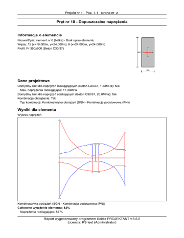 Projekt nr 1 - Poz. 1.1 strona nr z Pręt nr 18 - Dopuszczalne naprężenia Informacje o elemencie Nazwa/Opis: element nr 6 (belka) - Brak opisu elementu. Węzły: 12 (x=18.000m, y=24.000m); 8 (x=24.000m, y=24.000m) Profil: Pr 350x900 (Beton C30/37) Dane projektowe Domyślny limit dla naprężeń rozciągających (Beton C30/37, 1.33MPa): Nie Max. naprężenia rozciągające: 17.33MPa Domyślny limit dla naprężeń ściskających (Beton C30/37, 20.0MPa): Tak Kombinacja obciążenia: Tak Typ kombinacji: Kombinatoryka obciążeń (SGN - Kombinacja podstawowa (PN)) Wyniki dla elementu Wykres naprężeń Kombinatoryka obciążeń (SGN - Kombinacja podstawowa (PN)) Całkowite wytężenie elementu: 82% Naprężenia rozciągające: 82 % Raport wygenerowany programem Soldis PROJEKTANT v.8.5.5 Licencja: KS test (Administrator) Projekt nr 1 - Poz. 1.1 strona nr z Naprężenia ściskające: 74 % Wyniki w punktach charakterystycznych Nr Rzędna Obwiednia Warunek Wytężenie 0 1 2 3 4 5 6 7 8 9 10 11 12 13 14 15 16 17 18 19 0.000 0.000 0.000 0.000 0.250 0.250 0.250 0.250 0.500 0.500 0.500 0.500 0.750 0.750 0.750 0.750 1.000 1.000 1.000 1.000 max Sd max Sg min Sg min Sd max Sd max Sg min Sg min Sd max Sd max Sg min Sg min Sd max Sd max Sg min Sg min Sd max Sd max Sg min Sg min Sd Naprężenia rozciągające Naprężenia rozciągające Naprężenia rozciągające Naprężenia rozciągające Naprężenia rozciągające Naprężenia rozciągające Naprężenia rozciągające Naprężenia rozciągające Naprężenia rozciągające Naprężenia rozciągające Naprężenia rozciągające Naprężenia ściskające Naprężenia rozciągające Naprężenia rozciągające Naprężenia rozciągające Naprężenia rozciągające Naprężenia rozciągające Naprężenia rozciągające Naprężenia rozciągające Naprężenia rozciągające 8.3 % 82.4 % 8.3 % 82.4 % 20.7 % 26.0 % 20.7 % 26.0 % 28.2 % 5.6 % 27.7 % 5.9 % 24.2 % 13.0 % 24.2 % 13.0 % 16.2 % 55.4 % 16.2 % 55.4 % Raport wygenerowany programem Soldis PROJEKTANT v.8.5.5 Licencja: KS test (Administrator)