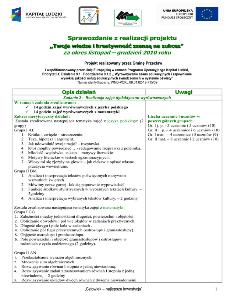 Sprawozdanie z realizacji projektu ,,,,TTw woojjaa w wiieeddzzaa ii kkrreeaattyyw wn noośśćć sszzaan nssąą n naa ssu ukkcceess”” za okres listopad – grudzień 2010 roku Projekt realizowany przez Gminę Przecław I współfinansowany przez Unię Europejską w ramach Programu Operacyjnego Kapitał Ludzki, Priorytet IX, Działanie 9.1. Poddziałanie 9.1.2 ,, Wyrównywanie szans edukacyjnych i zapewnienie wysokiej jakości usług edukacyjnych świadczonych w systemie oświaty” Numer identyfikacyjny: WND-POKL.09.01.02-18-715/09 Opis działań Uwagi Zadanie 2 – Realizacja zajęć dydaktyczno-wyrównawczych W ramach zadania zrealizowano: 14 godzin zajęć wyrównawczych z języka polskiego 14 godzin zajęć wyrównawczych z matematyki Zakres merytoryczny działań: Została zrealizowana następująca tematyka zajęć z języka polskiego: (2 grupy) Grupa I AL 1. Krótko i zwięźle – streszczenie. 2. Teza, hipoteza i argument. 3. Jak udowodnić swoje racje? – rozprawka. 4. Ktoś mógłby powiedzieć …- redagowanie rozprawki z polemiką. 5. Młodość, wędrówka, sukces – motywy literackie. 6. Motywy literackie w testach egzaminacyjnych. 7. Włosy mi się zjeżyły na głowie – jak ciekawie opisać własne przeżycia wewnętrzne. Grupa II BM 1. Analiza i interpretacja tekstów poświęconych motywom wszystkich świętych. 2. Mówimy coraz gorzej. Jak się poprawnie wypowiadać? 3. Funkcje środków stylistycznych w wybranych tekstach kultury. – 3godziny 4. Analiza i interpretacja wybranych tekstów kultury. – 2 godziny Liczba uczennic i uczniów w poszczególnych grupach Gr. I j. p. - 5 uczennic i 5 uczniów (10) Gr. II j. p. – 4 uczennice i 6 uczniów (10) Gr. I mat. – 4 uczennice i 5 uczniów (9) Gr. II mat. – 8 uczennic i 2 uczniów (10) Została zrealizowana następująca tematyka zajęć z matematyki: Grupa I GG 1. Zależności między jednostkami długości, powierzchni i objętości. 2. Obliczanie obwodów i pól wielokątów w zadaniach praktycznych. 3. Długość okręgu i pole koła w zadaniach . 4. Obliczanie pól figur przestrzennych (ostrosłupy i graniastosłupy). 5. Objętość ostrosłupa i graniastosłupa. 6. Pole powierzchni i objętość graniastosłupów i ostrosłupów w zadaniach z życia codziennego (2 godziny). Grupa II AN 1. Przekształcanie wyrażeń algebraicznych. 2. Mnożenie sum algebraicznych. 3. Rozwiązywanie równań I stopnia z jedną niewiadomą. 4. Rozwiązywanie zadań z zastosowaniem równań I stopnia z jedną niewiadomą. – 2 godziny 5. Rozwiązywanie układów dwóch równań z dwiema niewiadomymi. „Człowiek – najlepsza inwestycja” 1 6.Rozwiązywanie zadań z zastosowaniem układów równań. Frekwencja: Zaj. wyrównawcze z j. pol. Gr. I - 95,7% Gr. II –94,2% Zaj. wyrównawcze z mat. Gr. I - 84,1% Gr. II – 87,1% Trudności z realizacją zadania: Na tym etapie realizacji projektu nie występują. Plan działań na kolejny etap projektu: Przeprowadzenie 20godzin zajęć wyrównawczych z języka polskiego Przeprowadzenie 20godzin zajęć wyrównawczych z matematyki Zaplanowano różnorodną tematykę w zależności od potrzeb uczniów w tym zakresie. Tematyka zajęć z języka polskiego: Gr. I LA 1. List prywatny i oficjalny. 2. Dzieła sztuki jako teksty kultury – interpretacja (2 godz.) 3. Opis sytuacji a opowiadanie – podobieństwa i różnice. 4. Charakteryzuję barwnie i rzeczowo (2 godz.) 5. Gdzie znaleźć potrzebne informacje? Słowniki i encyklopedie. 6. Analiza i interpretacja wybranych tekstów kultury w testach gimnazjalnych: „Pieniądze to nie wszystko”; „Błogosławiony trud”; „Od księgi do książki”; Gr. II BM 1. Interpretacyjna funkcja metafory. 2. Na tropie symbolu. 3. Charakterystyka – ćwiczenia redakcyjne. – 2 godziny 4. Streszczenie. 5. Podanie. 6. Sprawozdanie. 7. List motywacyjny. 8. List prywatny i oficjalny. 9. Ze słownikami językowymi za pan brat. Tematyka zajęć z matematyki: Gr. I GG 1. Średnia arytmetyczna, modalna i mediana. 2. Różne sposoby zapisywania liczb – zaokrąglanie liczb, obliczanie potęgi, notacja wykładnicza. Przykłady z życia. 3. Działania na liczbach – zadania praktyczne. Rozwiązywanie wybranych zadań egzaminacyjnych. 4. Równania nierówności – zadania tekstowe. 5. Układy równań – rozwiązywanie. 6. Zastosowanie układów równań do rozwiązywania zadań z treścią. 7. Zadania praktyczne i problemowe – równania, układy równań. 8. Zadania z procentami. Rozwiązywanie wybranych zadań egzaminacyjnych. 9. Zastosowanie zintegrowanej wiedzy do rozwiązywania problemów. – 2 godziny Gr. II AN 1. Rozwiązywanie zadań na zastosowanie układów równań. 2. Procenty w zadaniach tekstowych. „Człowiek – najlepsza inwestycja” 2 3. Stosowanie twierdzenia Pitagorasa w rozwiązywaniu zadań. – 2 godziny 4. Wielokąty wpisane w okrąg. 5. Wielokąty opisane na okręgu. 6. Obliczanie pól i obwodów figur płaskich. – 2 godziny 7. Obliczanie pól i objętości graniastosłupów – 2 godziny Zadanie 3 - Opieka, doradztwo i terapia psychologiczna W ramach zadania zrealizowano: Liczba uczennic i uczniów objętych 42 godziny dyżuru psychologicznego, pomocą psychologiczną: 18 uczestników, w tym 8 uczennic i 10 8-godzinne warsztaty „Umiem radzić sobie z agresją” uczniów oraz 16 uczestników warsztatów; w tym 5 uczennic i 11uczniów Zakres merytoryczny działań: 1. Przeprowadzono 31 porad i rozmów terapeutycznych w celu rozwiązania konkretnych problemów, np. braku akceptacji siebie i innych, zachowań agresywnych, problemów odrzucenia i przemocy. 2. Tematyka 4 dwugodzinnych zajęć obejmowała: Złość, przemoc, agresja – analiza przypadków, odczucia agresora, odczucia ofiary. Praca z emocjami – koncentracja na ofierze agresji, sposoby radzenia sobie ze złością agresją – przemocą. Komunikacja interpersonalna – ćwiczenie schematu rozwiązywania konfliktu bez agresji. Przemoc na tle seksu