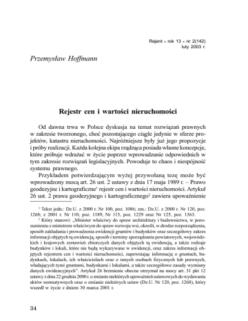 Przemys³aw Hoffmann Rejent * rok 13 * nr 2(142) luty 2003 r. Przemys³aw Hoffmann Rejestr cen i wartoœci nieruchomoœci Od dawna trwa w Polsce dyskusja na temat rozwi¹zañ prawnych w zakresie tworzonego, choæ pozostaj¹cego ci¹gle jedynie w sferze projektów, katastru nieruchomoœci. Najró¿niejsze by³y ju¿ jego propozycje i próby realizacji. Ka¿da kolejna ekipa rz¹dz¹ca posiada w³asne koncepcje, które próbuje wdra¿aæ w ¿ycie poprzez wprowadzanie odpowiednich w tym zakresie rozwi¹zañ legislacyjnych. Powoduje to chaos i niespójnoœæ systemu prawnego. Przyk³adem potwierdzaj¹cym wy¿ej przywo³an¹ tezê mo¿e byæ wprowadzony moc¹ art. 26 ust. 2 ustawy z dnia 17 maja 1989 r. – Prawo geodezyjne i kartograficzne1 rejestr cen i wartoœci nieruchomoœci. Artyku³ 26 ust. 2 prawa geodezyjnego i kartograficznego2 zawiera upowa¿nienie 1 Tekst jedn.: Dz.U. z 2000 r. Nr 100, poz. 1086; zm.: Dz.U. z 2000 r. Nr 120, poz. 1268; z 2001 r. Nr 110, poz. 1189, Nr 115, poz. 1229 oraz Nr 125, poz. 1363. 2 Który stanowi: „Minister w³aœciwy do spraw architektury i budownictwa, w porozumieniu z ministrem w³aœciwym do spraw rozwoju wsi, okreœli, w drodze rozporz¹dzenia, sposób zak³adania i prowadzenia ewidencji gruntów i budynków oraz szczegó³owy zakres informacji objêtych t¹ ewidencj¹, sposób i terminy sporz¹dzania powiatowych, wojewódzkich i krajowych zestawieñ zbiorczych danych objêtych t¹ ewidencj¹, a tak¿e rodzaje budynków i lokali, które nie bêd¹ wykazywane w ewidencji, oraz zakres informacji objêtych rejestrem cen i wartoœci nieruchomoœci, zapewniaj¹c informacjê o gruntach, budynkach, lokalach, ich w³aœcicielach oraz o innych osobach fizycznych lub prawnych, w³adaj¹cych tymi gruntami, budynkami i lokalami, a tak¿e szczegó³owe zasady wymiany danych ewidencyjnych”. Artyku³ 26 brzmienie obecne otrzyma³ na mocy art. 31 pkt 12 ustawy z dnia 22 grudnia 2000 r. o zmianie niektórych upowa¿nieñ ustawowych do wydawania aktów normatywnych oraz o zmianie niektórych ustaw (Dz.U. Nr 120, poz. 1268), który wszed³ w ¿ycie z dniem 30 marca 2001 r. 34 Rejestr cen i wartoœci nieruchomoœci dla ministra w³aœciwego do spraw architektury i budownictwa, w porozumieniu z ministrem w³aœciwym do spraw rozwoju wsi, do okreœlenia w drodze rozporz¹dzenia, miêdzy innymi, zakresu informacji objêtych rejestrem cen i wartoœci nieruchomoœci, zapewniaj¹c informacjê o gruntach, budynkach, lokalach, ich w³aœcicielach oraz o innych osobach fizycznych lub prawnych w³adaj¹cych tymi gruntami, budynkami i lokalami. Upowa¿nienie to znalaz³o odbicie w § 74 rozporz¹dzenia Ministra Rozwoju Regionalnego i Budownictwa z dnia 29 marca 2001 r. w sprawie ewidencji gruntów i budynków (Dz.U. Nr 38, poz. 454), zawieraj¹cym regulacje dotycz¹ce rejestru cen i wartoœci nieruchomoœci. Zgodnie z przywo³anym powy¿ej § 74 rozporz¹dzenia w sprawie ewidencji gruntów i budynków, starosta prowadzi rejestr cen nieruchomoœci okreœlonych w aktach notarialnych oraz wartoœci nieruchomoœci okreœlonych przez rzeczoznawców maj¹tkowych w operatach szacunkowych, których wyci¹gi przekazywane s¹ do ewidencji gruntów i budynków na mocy odrêbnych przepisów. Budziæ w¹tpliwoœci mo¿e sformu³owanie § 74 z punktu widzenia wyk³adni jêzykowej, bowiem, o ile nie ma w¹tpliwoœci, ¿e w zakresie ustalania wartoœci nieruchomoœci podstawê maj¹ stanowiæ dokumenty (operaty szacunkowe) sporz¹dzane przez rzeczoznawców maj¹tkowych, przesy³ane na mocy przepisów szczególnych3 w formie wyci¹gów do ewidencji gruntów i budynków, o tyle w odniesieniu do ustalania cen nieruchomoœci prawodawca u¿ywa jedynie ogólnego sformu³owania, ¿e podstawê dla tych¿e stanowi¹ ceny okreœlone w aktach notarialnych. St¹d rodzi siê pytanie, czy s¹ podstawy do przesy³ania przez notariusza aktów notarialnych do tego „nowego” rejestru? Brak bowiem zapisu analogicznego do unormowania tej kwestii w zakresie operatów szacunkowych, zgodnie z którym cenê nieruchomoœci przyjmowano by w rejestrze na podstawie aktów notarialnych przesy³anych do ewidencji gruntu i budynków. Ustawa – Prawo geodezyjne i kartograficzne stanowi w art. 23 o obowi¹zku przesy³ania przez 3 To jest na mocy norm zawartych w Dziale IV „Wycena nieruchomoœci” (art. 149173); Rozdziale 1 „Okreœlanie wartoœci nieruchomoœci” (art. 149-159) ustawy z dnia 21 sierpnia 1997 r. o gospodarce nieruchomoœciami (tekst jedn.: Dz.U. z 2000 r. Nr 46, poz. 543; zm.: Dz.U. z 2000 r. Nr 6, poz. 70; z 2001 r. Nr 129, poz. 1447 i Nr 154, poz. 1800; z 2002 r. Nr 25, poz. 253; Nr 74, poz. 676; Nr 113, poz. 984; Nr 126, poz. 1070; Nr 130, poz. 1112; Nr 200, poz. 1682; Nr 240, poz. 2058 oraz z 2003 r. Nr 1, poz. 15. 35 Przemys³aw Hoffmann w³aœciwe organy, s¹dy i kancelarie notarialne staroœcie odpisów prawomocnych decyzji i orzeczeñ oraz odpisów aktów notarialnych, z których wynikaj¹ zmiany danych objêtych ewidencj¹ gruntów i budynków w terminie 30 dni od dnia uprawomocnienia siê decyzji, orzeczenia lub sporz¹dzenia aktu notarialnego. Na notariuszy zosta³ wiêc na³o¿ony obowi¹zek przesy³ania aktów notarialnych nie do konkretnego rejestru, a do wskazanego organu (starosty). Nota bene w tym miejscu warto zwróciæ uwagê na pogl¹d wyra¿ony przez Cz.W. Salagierskiego4, który zauwa¿a: „Zgodnie bowiem z treœci¹ tego przepisu (art. 23 ustawy z dnia 17 maja 1989 r. – Prawo geodezyjne i kartograficzne – przy. P.H.), nie powinny byæ przesy³ane odpisy umów, które nie powoduj¹ samoistnie przeniesienia prawa na nabywcê, a istnieje du¿a iloœæ praw powstaj¹cych dopiero po wpisaniu w ksiêdze wieczystej (wpisy konstytutywne). Zmiany w ewidencji gruntów dokonywane na podstawie umów s¹ wiêc co najmniej przedwczesne”. I dalej: „Dopiero wpis do ksiêgi wieczystej jest gwarancj¹ skutecznoœci nabycia prawa, dlatego dokumentem, na podstawie którego dokonywane s¹ w