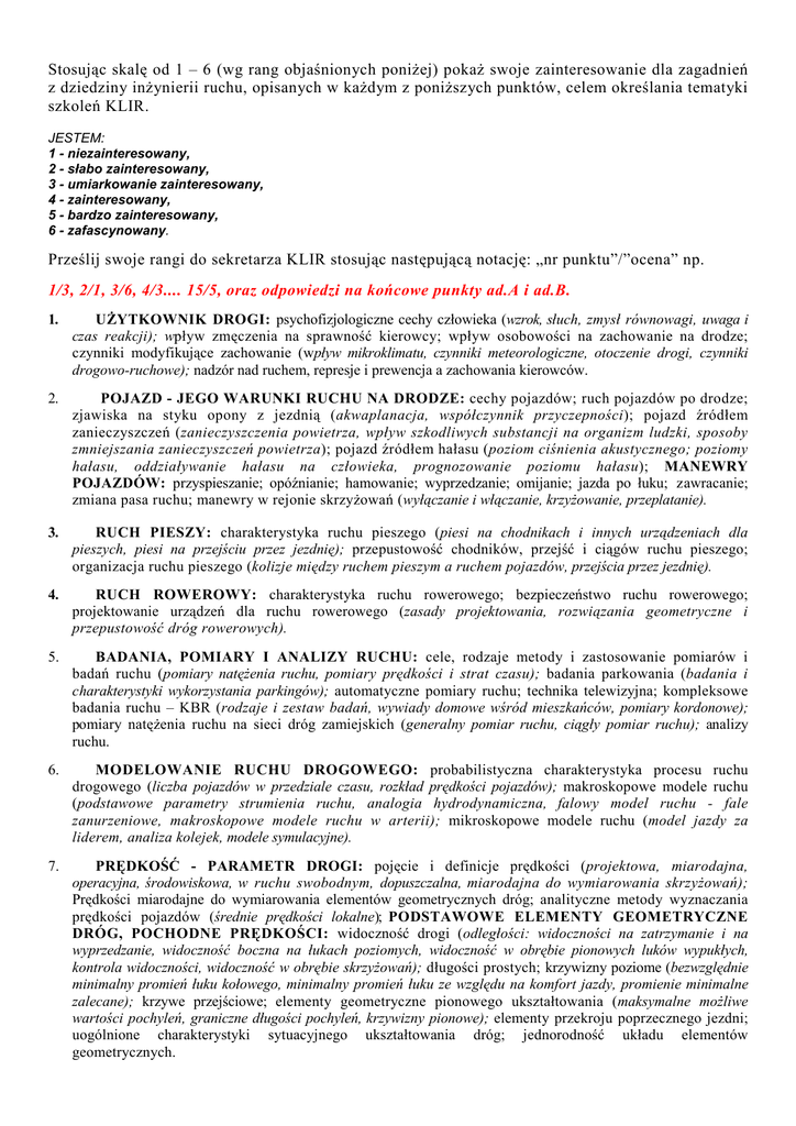 Stosując skalę od 1 – 6 (wg rang objaśnionych poniŜej) pokaŜ swoje zainteresowanie dla zagadnień z dziedziny inŜynierii ruchu, opisanych w kaŜdym z poniŜszych punktów, celem określania tematyki szkoleń KLIR. JESTEM: 1 - niezainteresowany, 2 - słabo zainteresowany, 3 - umiarkowanie zainteresowany, 4 - zainteresowany, 5 - bardzo zainteresowany, 6 - zafascynowany. Prześlij swoje rangi do sekretarza KLIR stosując następującą notację: „nr punktu”/”ocena” np. 1/3, 2/1, 3/6, 4/3.... 15/5, oraz odpowiedzi na końcowe punkty ad.A i ad.B. 1. UśYTKOWNIK DROGI: psychofizjologiczne cechy człowieka (wzrok, słuch, zmysł równowagi, uwaga i czas reakcji); wpływ zmęczenia na sprawność kierowcy; wpływ osobowości na zachowanie na drodze; czynniki modyfikujące zachowanie (wpływ mikroklimatu, czynniki meteorologiczne, otoczenie drogi, czynniki drogowo-ruchowe); nadzór nad ruchem, represje i prewencja a zachowania kierowców. 2. POJAZD - JEGO WARUNKI RUCHU NA DRODZE: cechy pojazdów; ruch pojazdów po drodze; zjawiska na styku opony z jezdnią (akwaplanacja, współczynnik przyczepności); pojazd źródłem zanieczyszczeń (zanieczyszczenia powietrza, wpływ szkodliwych substancji na organizm ludzki, sposoby zmniejszania zanieczyszczeń powietrza); pojazd źródłem hałasu (poziom ciśnienia akustycznego; poziomy hałasu, oddziaływanie hałasu na człowieka, prognozowanie poziomu hałasu); MANEWRY POJAZDÓW: przyspieszanie; opóźnianie; hamowanie; wyprzedzanie; omijanie; jazda po łuku; zawracanie; zmiana pasa ruchu; manewry w rejonie skrzyŜowań (wyłączanie i włączanie, krzyŜowanie, przeplatanie). 3. RUCH PIESZY: charakterystyka ruchu pieszego (piesi na chodnikach i innych urządzeniach dla pieszych, piesi na przejściu przez jezdnię); przepustowość chodników, przejść i ciągów ruchu pieszego; organizacja ruchu pieszego (kolizje między ruchem pieszym a ruchem pojazdów, przejścia przez jezdnię). 4. RUCH ROWEROWY: charakterystyka ruchu rowerowego; bezpieczeństwo ruchu rowerowego; projektowanie urządzeń dla ruchu rowerowego (zasady projektowania, rozwiązania geometryczne i przepustowość dróg rowerowych). 5. BADANIA, POMIARY I ANALIZY RUCHU: cele, rodzaje metody i zastosowanie pomiarów i badań ruchu (pomiary natęŜenia ruchu, pomiary prędkości i strat czasu); badania parkowania (badania i charakterystyki wykorzystania parkingów); automatyczne pomiary ruchu; technika telewizyjna; kompleksowe badania ruchu – KBR (rodzaje i zestaw badań, wywiady domowe wśród mieszkańców, pomiary kordonowe); pomiary natęŜenia ruchu na sieci dróg zamiejskich (generalny pomiar ruchu, ciągły pomiar ruchu); analizy ruchu. 6. MODELOWANIE RUCHU DROGOWEGO: probabilistyczna charakterystyka procesu ruchu drogowego (liczba pojazdów w przedziale czasu, rozkład prędkości pojazdów); makroskopowe modele ruchu (podstawowe parametry strumienia ruchu, analogia hydrodynamiczna, falowy model ruchu - fale zanurzeniowe, makroskopowe modele ruchu w arterii); mikroskopowe modele ruchu (model jazdy za liderem, analiza kolejek, modele symulacyjne). 7. PRĘDKOŚĆ - PARAMETR DROGI: pojęcie i definicje prędkości (projektowa, miarodajna, operacyjna, środowiskowa, w ruchu swobodnym, dopuszczalna, miarodajna do wymiarowania skrzyŜowań); Prędkości miarodajne do wymiarowania elementów geometrycznych dróg; analityczne metody wyznaczania prędkości pojazdów (średnie prędkości lokalne); PODSTAWOWE ELEMENTY GEOMETRYCZNE DRÓG, POCHODNE PRĘDKOŚCI: widoczność drogi (odległości: widoczności na zatrzymanie i na wyprzedzanie, widoczność boczna na łukach poziomych, widoczność w obrębie pionowych luków wypukłych, kontrola widoczności, widoczność w obrębie skrzyŜowań); długości prostych; krzywizny poziome (bezwzględnie minimalny promień łuku kołowego, minimalny promień łuku ze względu na komfort jazdy, promienie minimalne zalecane); krzywe przejściowe; elementy geometryczne pionowego ukształtowania (maksymalne moŜliwe wartości pochyleń, graniczne długości pochyleń, krzywizny pionowe); elementy przekroju poprzecznego jezdni; uogólnione charakterystyki sytuacyjnego ukształtowania dróg; jednorodność układu elementów geometrycznych. 8. PRZEPUSTOWOŚĆ: przepustowość dwu-pasowych dróg dwukierunkowych; (miary warunków ruchu, przepustowość i krytyczne natęŜenie ruchu w idealnych warunkach drogowo-ruchowych, przepustowość w warunkach róŜniących się od idealnych); przepustowość dróg wielo-pasowych (odcinki między węzłami, odcinki przeplatania, łącznice, wyjazdy i wjazdy z łącznic; PRZEPUSTOWOŚĆ SKRZYśOWAŃ: przepustowość skrzyŜowań z pierwszeństwem przejazdu; przepustowość rond; przepustowość skrzyŜowań z sygnalizacją świetlną. 9. POLITYKA TRANSPORTOWA I ZARZĄDZANIE RUCHEM: rozwój motoryzacji i jego skutki; polityka transportowa w miastach i narzędzia jej realizacji; komunikacyjna pojemność obszaru; zarządzanie ruchem (cele, środki i metody organizacji ruchu, organizacja ruchu na drogach zamiejskich, organizacja ruchu w obszarach zurbanizowanych); ruch jednokierunkowy; ograniczenia prędkości; projekt organizacji ruchu. 10. OZNAKOWANIE DRÓG I ULIC: rodzaje oznakowania i wymagania stawiane znakom (cele i funkcje oznakowania, wymagania stawiane oznakowaniu, hierarchia oznakowania); znaki pionowe; (wymagania, kategoria znaków pionowych, widoczność znaków pionowych w nocy, zasady stosowania znaków pionowych); poziome znaki drogowe (funkcje i wymagania, kategorie znaków poziomych, zasady projektowania, kanalizowanie ruchu, materiały do znakowania poziomego). 11. SYGNALIZACJA ŚWIETLNA NA SKRZYśOWANIU: cele i kryteria stosowania sygnalizacji; rodzaje sygnalizacji; sygnały, sygnalizatory i ich lokalizacja (sygnały i sygnalizatory, lokalizacja sygnalizatorów); projektowanie sygnalizacji; sygnalizacja akomodacyjna; sygnalizacja wielofazowa; mierniki efektywności ruchu na skrzyŜowani