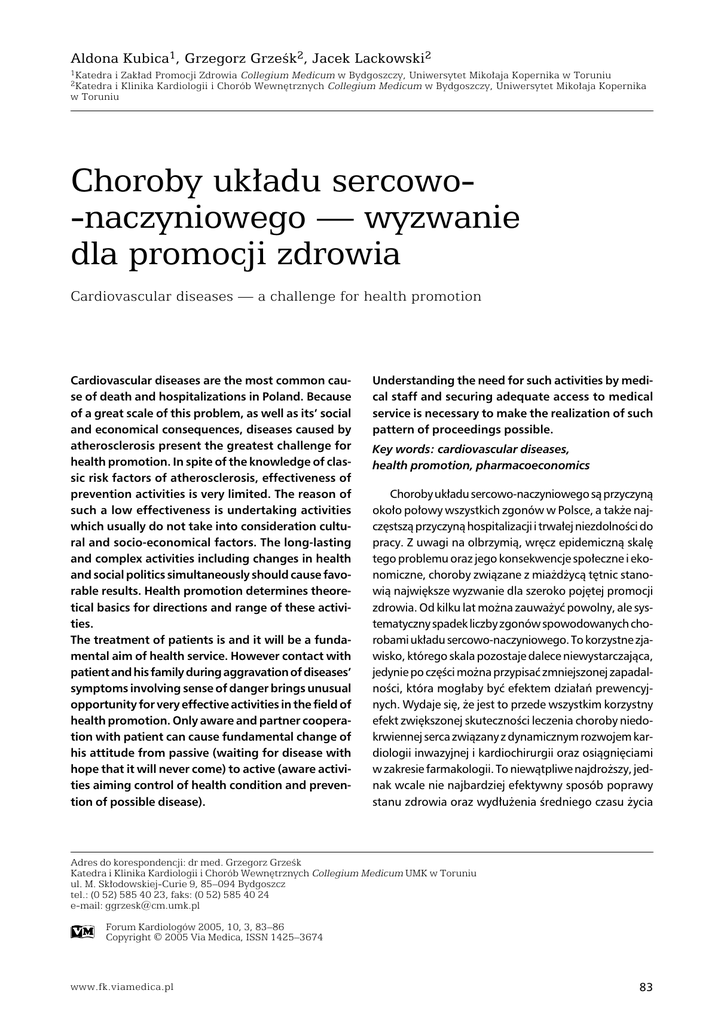 Aldona Kubica1, Grzegorz Grześk2, Jacek Lackowski2 1Katedra i Zakład Promocji Zdrowia Collegium Medicum w Bydgoszczy, Uniwersytet Mikołaja Kopernika w Toruniu i Klinika Kardiologii i Chorób Wewnętrznych Collegium Medicum w Bydgoszczy, Uniwersytet Mikołaja Kopernika w Toruniu 2Katedra Choroby układu sercowo-naczyniowego — wyzwanie dla promocji zdrowia Cardiovascular diseases — a challenge for health promotion Cardiovascular diseases are the most common cause of death and hospitalizations in Poland. Because of a great scale of this problem, as well as its’ social and economical consequences, diseases caused by atherosclerosis present the greatest challenge for health promotion. In spite of the knowledge of classic risk factors of atherosclerosis, effectiveness of prevention activities is very limited. The reason of such a low effectiveness is undertaking activities which usually do not take into consideration cultural and socio-economical factors. The long-lasting and complex activities including changes in health and social politics simultaneously should cause favorable results. Health promotion determines theoretical basics for directions and range of these activities. The treatment of patients is and it will be a fundamental aim of health service. However contact with patient and his family during aggravation of diseases’ symptoms involving sense of danger brings unusual opportunity for very effective activities in the field of health promotion. Only aware and partner cooperation with patient can cause fundamental change of his attitude from passive (waiting for disease with hope that it will never come) to active (aware activities aiming control of health condition and prevention of possible disease). Understanding the need for such activities by medical staff and securing adequate access to medical service is necessary to make the realization of such pattern of proceedings possible. Key words: cardiovascular diseases, health promotion, pharmacoeconomics Choroby układu sercowo-naczyniowego są przyczyną około połowy wszystkich zgonów w Polsce, a także najczęstszą przyczyną hospitalizacji i trwałej niezdolności do pracy. Z uwagi na olbrzymią, wręcz epidemiczną skalę tego problemu oraz jego konsekwencje społeczne i ekonomiczne, choroby związane z miażdżycą tętnic stanowią największe wyzwanie dla szeroko pojętej promocji zdrowia. Od kilku lat można zauważyć powolny, ale systematyczny spadek liczby zgonów spowodowanych chorobami układu sercowo-naczyniowego. To korzystne zjawisko, którego skala pozostaje dalece niewystarczająca, jedynie po części można przypisać zmniejszonej zapadalności, która mogłaby być efektem działań prewencyjnych. Wydaje się, że jest to przede wszystkim korzystny efekt zwiększonej skuteczności leczenia choroby niedokrwiennej serca związany z dynamicznym rozwojem kardiologii inwazyjnej i kardiochirurgii oraz osiągnięciami w zakresie farmakologii. To niewątpliwe najdroższy, jednak wcale nie najbardziej efektywny sposób poprawy stanu zdrowia oraz wydłużenia średniego czasu życia Adres do korespondencji: dr med. Grzegorz Grześk Katedra i Klinika Kardiologii i Chorób Wewnętrznych Collegium Medicum UMK w Toruniu ul. M. Skłodowskiej-Curie 9, 85–094 Bydgoszcz tel.: (0 52) 585 40 23, faks: (0 52) 585 40 24 e-mail: [email protected] Forum Kardiologów 2005, 10, 3, 83–86 Copyright © 2005 Via Medica, ISSN 1425–3674 www.fk.viamedica.pl 83 Forum Kardiologów 2005, tom 10, nr 3 populacji. Nawet najbardziej zaawansowana technologicznie medycyna naprawcza nie jest bowiem w stanie uchronić przed chorobą. Konstatacja tego oczywistego faktu zmusza do zmiany sposobu myślenia i innego rozwiązywania tego problemu. W opublikowanych rekomendacjach Światowej Organizacji Zdrowia (WHO, World Health Organization) „Zdrowie dla wszystkich w XXI wieku” istotnym elementem komplementarnych działań na rzecz zdrowia, obok profilaktyki, diagnostyki, leczenia, rehabilitacji i opieki, jest promocja zdrowia [1]. Skuteczna realizacja tych zaleceń wymaga świadomej, długofalowej polityki państwa w sferze opieki zdrowotnej, która nie może się ograniczać wyłącznie do zabezpieczania dostępu do świadczeń leczniczych i leków [2]. Obecnie działania wykraczające poza tę sferę stanowią margines aktywności instytucji odpowiedzialnych za realizację polityki zdrowotnej w Polsce. Wydaje się, że brak długofalowych przemyślanych działań w tym zakresie świadczy przede wszystkim o niezrozumieniu tego, czym jest i jakie korzyści może przynieść właściwie prowadzona promocja zdrowia. Od wielu lat znane są klasyczne czynniki ryzyka miażdżycy. Można określić znaczenie tych czynników w zależności od ich nasilenia oraz występowania pojedynczo bądź razem z innymi czynnikami. W tym miejscu trzeba sobie zadać pytanie: dlaczego do tej pory nie udało się dobrze spożytkować tej wiedzy? Z uwagi na złożoność uwarunkowań prosta i jednoznaczna odpowiedź na to pytanie chyba nie jest możliwa. Jedną z przyczyn jest zapewne uproszczone postrzeganie problemu przeciwdziałania chorobom układu sercowo-naczyniowego, w tym przede wszystkim chorobie wieńcowej, zawężone do oddziaływania na klasyczne czynniki ryzyka miażdżycy. W wielodyscyplinarnych badaniach, mających na celu szerszą ocenę zjawisk zdrowotnych, wykazano, że dla pełnego zrozumienia oraz prawidłowej interpretacji konieczne jest uwzględnianie uwarunkowań kulturowych i społeczno-ekonomicznych [2]. Siciński [3] wskazał aż cztery wymiary związków między kulturą a zdrowiem: kulturowo uwarunkowane zróżnicowanie poglądów na zagrożenia zdrowia, kulturowo uwarunkowane zróżnicowanie poglądów na indywidualnie definiowane kryteria zdrowia, kulturowo uwarunkowany stosunek do zdrowia jako uznawanej wartości oraz kulturowe zróżnicowanie stosunku do osób chorych. Uświadomienie sobie złożoności czynników determinując