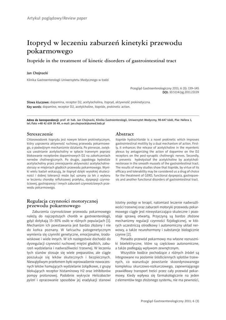 Artykuł poglądowy/Review paper Itopryd w leczeniu zaburzeń kinetyki przewodu pokarmowego Itopride in the treatment of kinetic disorders of gastrointestinal tract Jan Chojnacki Klinika Gastroenterologii Uniwersytetu Medycznego w Łodzi Przegląd Gastroenterologiczny 2011; 6 (3): 139–145 DOI: 10.5114/pg.2011.23139 Słowa kluczowe: dopamina, receptor D2, acetylocholina, itopryd, aktywność prokinetyczna. Key words: dopamine, receptor D2, acetylcholine, itopride, prokinetic action. Adres do korespondencji: prof. dr hab. Jan Chojnacki, Klinika Gastroenterologii, Uniwersytet Medyczny, 90-647 Łódź, Plac Hallera 1, tel./faks +48 42 639 30 49, e-mail: [email protected] Streszczenie Abstract Chlorowodorek itoprydu jest nowym lekiem prokinetycznym, który usprawnia aktywność ruchową przewodu pokarmowego, o podwójnym mechanizmie działania. Po pierwsze, zwiększa uwalnianie acetylocholiny w splocie trzewnym poprzez blokowanie receptorów dopaminowych D2 na zakończeniach nerwów cholinergicznych. Po drugie, zapobiega hydrolizie acetylocholiny przez zmniejszenie aktywności acetylocholinesterazy w mięśniach gładkich przewodu pokarmowego. Wyniki wielu badań wskazują, że itopryd dzięki wysokiej skuteczności i dobrej tolerancji może być uznany za lek z wyboru w leczeniu choroby refluksowej przełyku, dyspepsji czynnościowej, gastroparezy i innych zaburzeń czynnościowych przewodu pokarmowego. Itopride hydrochloride is a novel prokinetic which improves gastrointestinal motility by a dual mechanism of action. Firstly, it enhances the release of acetylcholine in the myenteric plexus by antagonizing the action of dopamine on the D2 receptors on the post-synaptic cholinergic nerves. Secondly, it prevents hydrolysisof the acetylcholine by acetylcholinesterase in the smooth mussels of the gastrointestinal tract. The results of many studies show that itopride, by virtue of its efficacy and tolerability may be considered us a drug of choice for the theatment of GERD, functional dyspepsia, gastroparesis and another functional disorders of gastrointestinal tract. Regulacja czynności motorycznej przewodu pokarmowego Zaburzenia czynnościowe przewodu pokarmowego należą do najczęstszych chorób w gastroenterologii, gdyż dotykają 15–30% osób w różnych populacjach [1]. Mechanizm ich powstawania jest bardzo złożony i nie do końca poznany. W łańcuchu patogenetycznym wymienia się czynniki genetyczne, emocjonalne, środowiskowe i wiele innych. W ich następstwie dochodzi do dysregulacji czynności ruchowej mięśni gładkich, zaburzeń wydzielania i nadwrażliwości trzewnej. W leczeniu tych stanów stosuje się wiele preparatów, ale ciągle poszukuje się leków skutecznych i bezpiecznych. Niewątpliwym przełomem było wprowadzenie nowoczesnych leków hamujących wydzielanie żołądkowe, z grupy blokujących receptor histaminowy H2 oraz inhibitorów pompy protonowej. Podobnie wykrycie Helicobacter pylori i opracowanie sposobów jej eradykacji stanowi istotny postęp w terapii, natomiast leczenie nadwrażliwości trzewnej oraz zaburzeń motoryki przewodu pokarmowego ciągle jest niewystarczająco skuteczne i pozostaje sprawą otwartą. Przyczyną są bardzo złożone mechanizmy regulacji czynności fizjologicznej, w których uczestniczą ośrodkowy i autonomiczny układ nerwowy, a także neurohormony i substancje biologicznie czynne [2]. Ponadto przewód pokarmowy ma własne rozruszniki bioelektryczne, które są częściowo autonomiczne, a także podlegają wpływom zewnętrznym. Wszystkie bodźce pochodzące z różnych źródeł są integrowane na poziomie śródściennych splotów trzewnych, co warunkuje powstanie skoordynowanego kompleksu skurczowo-rozkurczowego, zapewniającego prawidłowy transport treści przez cały przewód pokarmowy. Kiedy wpływa się farmakologicznie na jeden z elementów tego złożonego systemu, nie ma pewności, Przegląd Gastroenterologiczny 2011; 6 (3) 140 czy nie narusza się jego równowagi z innymi ogniwami fizjologicznej motoryki. Wśród leków prokinetycznych znajdują się m.in. związki z grupy cholinergicznych, adrenolitycznych, wykazujących powinowactwo do receptorów serotoninowych, motylinowych, opioidowych. Dotychczas nie opracowano leku, który miałby cechy „inteligentnego” prokinetyku, oddziałującego wybiórczo na niesprawne odcinki przewodu pokarmowego. Podstawowym neuroprzekaźnikiem w układzie pokarmowym jest acetylocholina, ale jej wydzielanie w strefie postsynaptycznej bywa także odmienne w różnych regionach przewodu pokarmowego. Gdyby wydzielana była w ten sam sposób i w tej samej ilości na całej jego długości, to doszłoby do niefizjologicznego chaosu skurczowego i niekontrolowanego pasażu treści pokarmowej. W dodatku prowadziłoby to do nadmiernego wydzielania soków trawiennych w obrębie ślinianek, żołądka, trzustki i jelit. Z tego powodu acetylocholina – czy jej analogi (betanechol) – nie może być wykorzystana w leczeniu przewlekłych chorób czynnościowych przewodu pokarmowego, natomiast w niektórych stanach jego hipokinezy wykorzystuje się inhibitory cholinoesterazy (neostygmina, distygmina), które zapobiegają nadmiernemu katabolizmowi acetylocholiny i podnoszą jej aktywność w tkankach [3]. Innym sposobem na zwiększenie jej aktywności jest stosowanie preparatów z grupy hamujących zwrotny wychwyt acetylocholiny (acotamina); leki te są obecnie testowane w klinikach. W ciągłym poszukiwaniu przydatnych leków prokinetycznych zwrócono uwagę na rolę serotoniny w przewodzie pokarmowym, gdzie znajduje się ok. 90% całej jej puli w organizmie. Pełni ona funkcję neuroprzekaźnika i bierze udział w regulacji wielu czynności tego narządu [4]. Na czynność motoryczną wywiera wpływ zróżnicowany, zarówno skurczowy (głównie przez receptory 5-HT2 i 5-HT4), jak i rozkurczowy (częściowo przez subreceptory 5-HT1 i 5-HT3). Kierunek i nasilenie tej aktywności zależy m.in. o