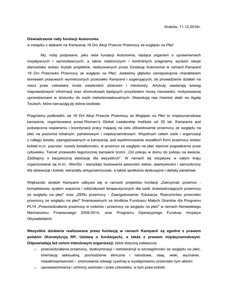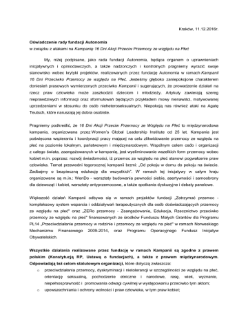 Kraków, 11.12.2016r. Oświadczenie rady fundacji Autonomia w związku z atakami na Kampanię 16 Dni Akcji Przeciw Przemocy ze względu na Płeć My, niżej podpisane, jako rada fundacji Autonomia, będąca organem o uprawnieniach inicjatywnych i opiniodawczych, a także nadzorczych i kontrolnych pragniemy wyrazić swoje stanowisko wobec krytyki projektów, realizowanych przez fundację Autonomia w ramach Kampanii 16 Dni Przeciwko Przemocy ze względu na Płeć. Jesteśmy głęboko zaniepokojone charakterem doniesień prasowych wymierzonych przeciwko Kampanii i sugerujących, że prowadzenie działań na rzecz praw człowieka może zaszkodzić dzieciom i młodzieży. Artykuły zawierają szereg nieprawdziwych informacji oraz sformułowań będących przykładem mowy nienawiści, motywowanej uprzedzeniami w stosunku do osób nieheteroseksualnych. Niepokoją nas również ataki na Agatę Teutsch, które naruszają jej dobra osobiste. Pragniemy podkreślić, że 16 Dni Akcji Przeciw Przemocy ze Względu na Płeć to międzynarodowa kampania, organizowana przez Women’s Global Leadership Institute od 25 lat. Kampania jest poświęcona wspieraniu i koordynacji pracy mającej na celu zlikwidowanie przemocy ze względu na płeć na poziomie lokalnym, państwowym i międzynarodowym. Wspólnym celem osób i organizacji z całego świata, zaangażowanych w kampanię, jest wyeliminowanie wszelkich form przemocy wobec kobiet m.in. poprzez: rozwój świadomości, iż przemoc ze względu na płeć stanowi pogwałcenie praw człowieka. Temat przewodni tegorocznej kampanii brzmi: „Od pokoju w domu do pokoju na świecie. Zadbajmy o bezpieczną edukację dla wszystkich”. W ramach tej inicjatywy w całym kraju organizowane są m.in.: WenDo - warsztaty budowania pewności siebie, asertywności i samoobrony dla dziewcząt i kobiet, warsztaty antyprzemocowe, a także spotkania dyskusyjne i debaty panelowe. Większość działań Kampanii odbywa się w ramach projektów fundacji „Zatrzymać przemoc kompleksowy system wsparcia i oddziaływań terapeutycznych dla osób doświadczających przemocy ze względu na płeć" oraz „ZERo przemocy - Zaangażowanie, Edukacja, Rzecznictwo przeciwko przemocy ze względu na płeć" finansowanych ze środków Funduszu Małych Grantów dla Programu PL14 „Przeciwdziałanie przemocy w rodzinie i przemocy ze względu na płeć" w ramach Norweskiego Mechanizmu Finansowego 2009-2014, oraz Programu Operacyjnego Fundusz Inicjatyw Obywatelskich. Wszystkie działania realizowane przez fundację w ramach Kampanii są zgodne z prawem polskim (Konstytucją RP, Ustawą o fundacjach), a także z prawem międzynarodowym. Odpowiadają też celom statutowym organizacji, które dotyczą zwłaszcza: o przeciwdziałania przemocy, dyskryminacji i nietolerancji w szczególności ze względu na płeć, orientację seksualną, pochodzenie etniczne i narodowe, rasę, wiek, wyznanie, niepełnosprawność i promowania odwagi cywilnej w występowaniu przeciwko tym aktom; o upowszechniania i ochrony wolności i praw człowieka, w tym praw kobiet; o wspomagania rozwoju demokracji oraz świadomości i aktywności obywatelskiej oraz współpracy między jednostkami i grupami. Ponadto projekty, w ramach których realizowane są wszystkie działania zostały zatwierdzone przez Ministerstwo Rodziny, Pracy i Polityki Społecznej oraz są przez nie monitorowane i podlegają jego kontroli. Dodatkowo patronat honorowy nad Kampanią objął Rzecznik Praw Obywatelskich - dr Adam Bodnar. Pragniemy zauważyć, że wszystkie podejmowane przez fundację działania wzmacniają fundamenty demokracji i bezpieczeństwa publicznego, pozwalając w sposób pokojowy rozwiązywać konflikty. Co więcej, mają na celu wzmacnianie postaw budujących bezpieczeństwo mieszkanek i mieszkańców Polski bez względu na ich płeć, pochodzenie, orientację psychoseksualną czy niepełnosprawność. Działania mające na celu zapewnianie wszystkim osobom bezpieczeństwa i wolności od przemocy są naszym wspólnym obowiązkiem. Wymagają one odwagi, siły i solidarności - trzech kompetencji, które próbuje się dyskredytować w dyskursach publicznych. Żywimy głęboką nadzieję, że Ministerstwo będzie wspierać fundację Autonomia w przygotowywanych przez nią wydarzeniach antydyskryminacyjnych i antyprzemocowych. Jednocześnie wyrażamy sprzeciw wobec mowy nienawiści obecnej w prasie i domagamy się przestrzegania standardów etyki dziennikarskiej. Członkinie rady fundacji Autonomia Katarzyna Żeglicka Agnieszka Król Magdalena Stoch
