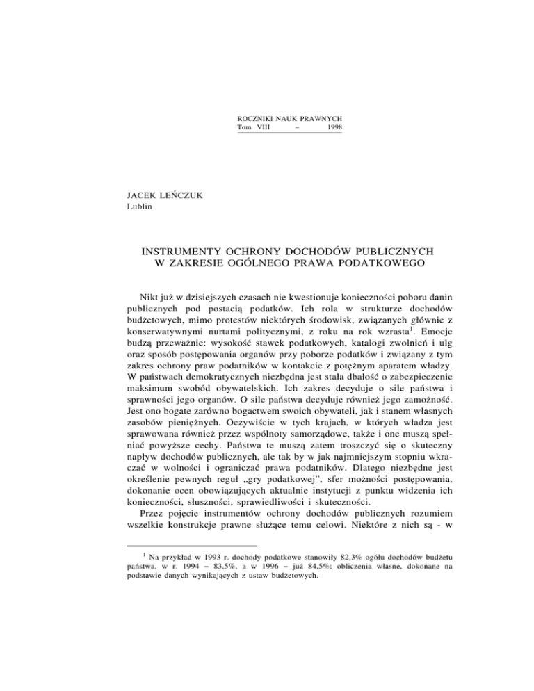 ROCZNIKI NAUK PRAWNYCH Tom VIII − 1998 JACEK LEŃCZUK Lublin INSTRUMENTY OCHRONY DOCHODÓW PUBLICZNYCH W ZAKRESIE OGÓLNEGO PRAWA PODATKOWEGO Nikt już w dzisiejszych czasach nie kwestionuje konieczności poboru danin publicznych pod postacia˛ podatków. Ich rola w strukturze dochodów budżetowych, mimo protestów niektórych środowisk, zwiazanych ˛ głównie z konserwatywnymi nurtami politycznymi, z roku na rok wzrasta1. Emocje budza˛ przeważnie: wysokość stawek podatkowych, katalogi zwolnień i ulg oraz sposób poste˛powania organów przy poborze podatków i zwiazany ˛ z tym zakres ochrony praw podatników w kontakcie z pote˛żnym aparatem władzy. W państwach demokratycznych niezbe˛dna jest stała dbałość o zabezpieczenie maksimum swobód obywatelskich. Ich zakres decyduje o sile państwa i sprawności jego organów. O sile państwa decyduje również jego zamożność. Jest ono bogate zarówno bogactwem swoich obywateli, jak i stanem własnych zasobów pienie˛żnych. Oczywiście w tych krajach, w których władza jest sprawowana również przez wspólnoty samorzadowe, ˛ także i one musza˛ spełniać powyższe cechy. Państwa te musza˛ zatem troszczyć sie˛ o skuteczny napływ dochodów publicznych, ale tak by w jak najmniejszym stopniu wkraczać w wolności i ograniczać prawa podatników. Dlatego niezbe˛dne jest określenie pewnych reguł „gry podatkowej”, sfer możności poste˛powania, dokonanie ocen obowiazuj ˛ acych ˛ aktualnie instytucji z punktu widzenia ich konieczności, słuszności, sprawiedliwości i skuteczności. Przez poje˛cie instrumentów ochrony dochodów publicznych rozumiem wszelkie konstrukcje prawne służace ˛ temu celowi. Niektóre z nich sa˛ - w 1 Na przykład w 1993 r. dochody podatkowe stanowiły 82,3% ogółu dochodów budżetu państwa, w r. 1994 − 83,5%, a w 1996 − już 84,5%; obliczenia własne, dokonane na podstawie danych wynikajacych ˛ z ustaw budżetowych. 66 JACEK LEŃCZUK moim przekonaniu, rozwiazaniami ˛ trafnymi i te należałoby ugruntować w systemie prawa polskiego, a niektóre, u podstaw których leży fiskalizm, sa˛ chybione i z tych, jako nie realizujacych ˛ zasad podatkowych, trzeba chyba zrezygnować. Należy zatem odpowiedzieć sobie na pytanie, jakie sa˛ sposoby ochrony dochodów publicznych w ogólnym prawie podatkowym. Odpowiedzi można szukać w kilku płaszczyznach: − zasad podatkowych (I), − prawa materialnego (II), − procedury podatkowej (III), − zakresu uprawnień i sprawności organów podatkowych (IV). I. ZASADY PODATKOWE 1. Z pozoru mogłoby sie˛ wydawać, że przypomnienie niektórych zasad podatkowych nie ma nic wspólnego z opisem prawnych sposobów ochrony dochodów publicznych. Nie wynikaja˛ one bowiem z konkretnych przepisów prawa pozytywnego, zostały wykreowane wiele lat temu, w innych warunkach i gospodarczych, i politycznych. Byłaby to jednak teza mylna. Sa˛ one bowiem filarem rozwoju myśli podatkowej na świecie. Zakorzeniły sie˛ głe˛boko w ludzkich umysłach, podatnicy zdaja˛ sie˛ je czuć, utożsamiaja˛ sie˛ z nimi, mimo że cze˛sto ich nie znaja. ˛ Ich brak wśród dzisiejszych instytucji prawnych be˛dzie oceniany negatywnie, ich respektowanie przyjmowane jest z aprobata. ˛ Wiele norm wynika właśnie z konieczności realizacji zasad podatkowych. Zasady te powinny być jasno określone, założone w momencie kreowania już nie poszczególnych przepisów, ale całego systemu podatkowego. Musza˛ one być rzetelnie i konsekwentnie przestrzegane zarówno w trakcie uchwalania norm prawnych, jak i ich realizacji. 2. Jedna˛ z najważniejszych, moim zdaniem, zasad, której konsekwentne przestrzeganie be˛dzie w uje˛ciu długofalowym zapewniać należyta˛ ilość dochodów publicznych, jest z a s a d a o c h r o n y i d b a ł o ś c i o ź r ó d ł a p o d a t k ó w w z n a c z e n i u p o d m i o t o w y m2. Nie można dla zaspokojenia doraźnych potrzeb fiskusa ustanawiać zdecydo2 Por. poglady ˛ A. Smitha (1723-1790) w: N. G a j l, Teorie podatkowe w świecie, Warszawa 1992, s. 46-52, czy Davida Ricardo (1772-1823) w: A. G o m u ł o w i c z, J. M a ł ec k i, Podatki i prawo podatkowe dla studentów i praktyków, Poznań 1995, s. 32. INSTRUMENTY OCHRONY DOCHODÓW PUBLICZNYCH 67 wanie nadmiernych obciażeń ˛ publicznoprawnych. Polityki finansowej państwa nie może pod jakimkolwiek pozorem cechować fiskalizm. W ten sposób można bardzo łatwo znieche˛cić podatników do prowadzenia działalności, z której państwo czerpie dochody podatkowe, ewentualnie wywołać zjawisko tzw. szarej strefy − nielegalnego unikania przez zobowiazanych ˛ ponoszenia cie˛żarów podatkowych. Należy pamie˛tać, że im niższe sa˛ podatki, ludzie che˛tniej je płaca. ˛ Wyznacznikiem polityki finansowej państwa nie może być w żadnym wypadku „krzywa wytrzymałości finansowej podatnika”. Takie poste˛powanie władzy doprowadzi do sytuacji, w której w ciagu ˛ krótkiego czasu zniknie spora cze˛ść źródeł dochodów podatkowych. Aby utrzymać ich stały poziom, państwo be˛dzie musiało nałożyć wie˛ksze obciażenia ˛ na pozostałych. Ci też po jakimś czasie dojda˛ do przekonania, że legalne prowadzenie działalności jest zbyt kosztowne, i albo zakończa˛ swa˛ działalność, albo „zejda˛ do gospodarczego podziemia”. Jakkolwiek trudno sobie wyobrazić w dzisiejszych czasach aż tak czarny scenariusz wydarzeń, to nie jest nam jednak obcy fiskalizm w złagodzonej postaci, o mniej drastycznych skutkach. Na konieczność przestrzegania tej zasady zwracał uwage˛ także niejednokrotnie Trybunał Konstytucyjny. 3. Wiaże ˛ on te˛ zasade˛ z inna˛ − p e w n o ś c i i s t a b i l n o ś c i p r a w a. Na pozór mogłoby sie˛ wydawać, że tak konsekwentne ich przywoływanie ma chronić tylko interesy podatników, a nie państwa, lecz nic bardziej mylnego. Jeżeli zlikwidujemy lub znacznie zmniejszymy ekonomiczna˛ egzysten