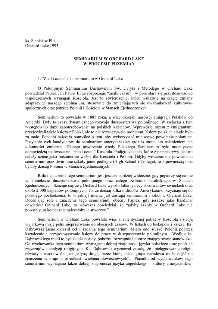 ks. Stanisław Flis, Orchard Lake,1993 SEMINARIUM W ORCHARD LAKE W PROCESIE PRZEMIAN 1. “Znaki czasu” dla seminarium w Orchard Lake O Polonijnym Seminarium Duchownym Św. Cyryla i Metodego w Orchard Lake powiedział Papież Jan Paweł II, że rozpoznaje “znaki czasu” i w porę stara się przystosować do współczesnych wymagań Kościoła. Jest to stwierdzenie, które wskazuje na ciągłe zmiany adaptacyjne naszego seminarium, stosownie do zmieniających się uwarunkowań kulturowospołecznych oraz potrzeb Polonii i Kościoła w Stanach Zjednoczonych. Seminarium to powstało w 1885 roku, a więc okresie masowej emigracji Polaków do Ameryki. Były to czasy dynamicznego rozwoju duszpasterstwa polonijnego. W związku z tym występowało duże zapotrzebowanie na polskich kapłanów. Wprawdzie razem z emigrantami przyjeżdżali także księża z Polski, ale to nie rozwiązywało problemu. Księży polskich ciągle było za mało. Ponadto należało pomyśleć o tym, aby wykorzystać miejscowe powołania polonijne. Posyłanie tych kandydatów do seminariów amerykańskich groziło utratą lub osłabieniem ich tożsamości etnicznej. Dlatego utworzenie wtedy Polskiego Seminarium było autentyczna odpowiedzią na ówczesne “znaki czasu” Kościoła. Podjęto zadania, które z perspektywy historii należy uznać jako niezmiernie ważne dla Kościoła i Polonii. Gdyby wówczas nie powstało to seminarium oraz dwie inne szkoły jemu podległe (High School i College), to z pewnością inna byłaby dzisiaj Polonia w Stanach Zjednoczonych. Rola i znaczenie tego seminarium jest jeszcze bardziej widoczne, gdy popatrzy się na nie w kontekście duszpasterstwa polonijnego oraz całego Kościoła katolickiego w Stanach Zjednoczonych. Szacuje się, że z Orchard Lake wyszło kilka tysięcy absolwentów świeckich oraz około 2 000 kapłanów polonijnych. To, że dzisiaj kilka milionów Amerykanów przyznaje się do polskiego pochodzenia, to w jakiejś mierze jest zasługą seminarium i szkół w Orchard Lake. Doceniając role i znaczenie tego seminarium, obecny Papież, gdy jeszcze jako Kardynał odwiedzał Orchard Lake, to wówczas powiedział, że “gdyby szkoły w Orchard Lake nie powstały, to koniecznie należałoby je stworzyć.” Seminarium w Orchard Lake powstało więc z autentycznej potrzeby Kościoła i swoją wyjątkową misję pełni nieprzerwanie do obecnych czasów. W listach do biskupów i księży, Ks. Dąbrowski jasno określił cel i zadania tego seminarium. Miało ono służyć Polonii poprzez kształcenie i przygotowywanie księży do pracy w duszpasterstwie polonijnym. Według ks. Dąbrowskiego mieli to być księża polscy, pobożni, roztropnie i dobrze znający swoje stanowisko. Od wychowanka tego seminarium wymagano dobrej znajomości języka polskiego oraz polskich zwyczajów i tradycji religijnych. Ks. Dąbrowski wyznawał zasadę, że “pielęgnowanie religii, oświaty i narodowości jest jedyną drogą, przez którą każda grupa narodowa może dojść do znaczenia w kraju o ośrodkach wielonarodowościowych”. Ponadto od wychowanków tego seminarium wymagano także dobrej znajomości języka angielskiego i kultury amerykańskiej. Mieli oni przecież pełnić role pośredników, między polską grupą etniczną i społeczeństwem amerykańskim. W formacji seminaryjnej dążono do integracji trzech kultur: polskiej, amerykańskiej i katolickiej. Seminarium w Orchard Lake umiejętnie przystosowywało program kształcenia i formacji do potrzeb studentów. W początkowym okresie, gdy do seminarium zgłaszała się młodzież głownie z pierwszego lub drugiego pokolenia Polonii, duchowo bardziej związana z kulturą polską, niż amerykańską; z dobrą znajomością język polskiego i kultury polskiej, w programie akademickim kładziono wtedy większy nacisk na naukę języka angielskiego i znajomość kultury amerykańskiej. Okres ten można umownie nazwać jako “polski”. Lata międzywojenne stanowią okres, który możemy nazwać jako “amerykański”. Za datę początkową tego okresu można przyjąć rok 1927, kiedy to ówczesny Rektor, ks. Michał Grupa, dostosował system nauczania w naszych szkołach do wymogów szkolnictwa amerykańskiego. Odtąd nauka w High School, College i Seminarium trwała po 4 lata. W tym okresie zmieniły się potrzeby studentów. Do seminarium zaczęli wtedy zgłaszać się głównie kandydaci urodzeni już w Stanach Zjednoczonych. Znali oni dobrze język angielski i kulturę amerykańską, a gorzej kulturę i język polski. Z tego też powodu w programie akademickim i formacji seminaryjnej należało dokonać zasadniczych zmian, aby podnieść u studentów znajomość języka i kultury polskiej. A więc zupełnie odwrotnie, niż w poprzednim okresie. W czasie II Wojny Światowej, liczba studentów we wszystkich szkołach wyraźnie spadła. Wtedy to powstała myśl, żeby w Orchard Lake kształcić kapłanów dla Polski, która bardzo ucierpiała podczas wojny. Dużo wymordowano księży oraz wiele zniszczono lub zamknięto seminariów duchownych. Z tą myślą sprowadzono w 1941 roku do Orchard Lake 31 chętnych, polskich chłopców z obozów w Indiach. Później wielu z nich porzuciło myśl wstąpienia do seminarium, ale w Orchard Lake ukończyli szkołę średnią lub kolegium i pozostali w Stanach Zjednoczonych. Ci natomiast, którzy ukończyli teologię i przyjęli święcenia kapłańskie, to jednak do Polski nie chcieli jechać ze względu na powojenny tam ustrój komunistyczny. Pozostali w Stanach Zjednoczonych lub wyjechali do Kanady. “Chłopcy polscy z Indii”, bo tak ich nazywano, wnieśli do Orchard Lake ducha polskiego, który był niejako naturalnym wsparciem dla wychowawców w procesie formacji polsko-amerykańskiej studentów. Lata po II Wojnie Światowej były czasem ożywionej emigracji polityczno-wojennej, z której wywodziło się wiele powołań. Do seminarium zgłaszali się także potomkowie starej P