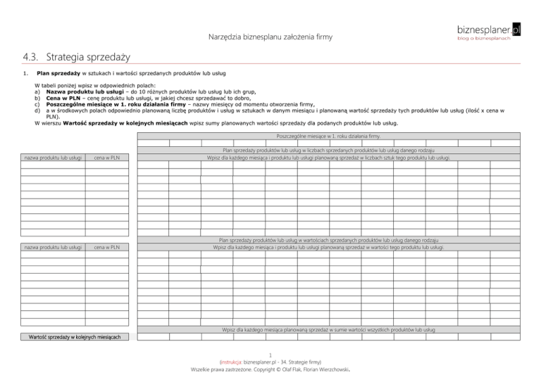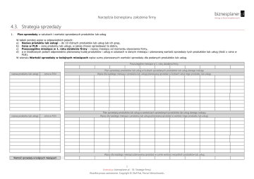 Narzędzia biznesplanu założenia firmy 4.3. Strategia sprzedaży 1. Plan sprzedaży w sztukach i wartości sprzedanych produktów lub usług W tabeli poniżej wpisz w odpowiednich polach: a) Nazwa produktu lub usługi – do 10 różnych produktów lub usług lub ich grup, b) Cena w PLN – cenę produktu lub usługi, w jakiej chcesz sprzedawać to dobro, c) Poszczególne miesiące w 1. roku działania firmy – nazwy miesięcy od momentu otworzenia firmy, d) a w środkowych polach odpowiednio planowaną liczbę produktów i usług w sztukach w danym miesiącu i planowaną wartość sprzedaży tych produktów lub usług (ilość x cena w PLN). W wierszu Wartość sprzedaży w kolejnych miesiącach wpisz sumy planowanych wartości sprzedaży dla podanych produktów lub usług. Poszczególne miesiące w 1. roku działania firmy. nazwa produktu lub usługi cena w PLN Plan sprzedaży produktów lub usług w liczbach sprzedanych produktów lub usług danego rodzaju Wpisz dla każdego miesiąca i produktu lub usługi planowaną sprzedaż w liczbach sztuk tego produktu lub usługi. nazwa produktu lub usługi cena w PLN Plan sprzedaży produktów lub usług w wartościach sprzedanych produktów lub usług danego rodzaju Wpisz dla każdego miesiąca i produktu lub usługi planowaną sprzedaż w wartości tego produktu lub usługi. Wpisz dla każdego miesiąca planowaną sprzedaż w sumie wartości wszystkich produktów lub usług Wartość sprzedaży w kolejnych miesiącach 1 (instrukcja: biznesplaner.pl - 34. Strategie firmy) Wszelkie prawa zastrzeżone. Copyright © Olaf Flak, Florian Wierzchowski. Narzędzia biznesplanu założenia firmy 4.3. Strategia sprzedaży 2. Działania sprzedażowe realizujące plan sprzedaży produktów lub usług W tabeli poniżej wpisz dla każdego miesiąca w 1. roku działania firmy charakterystykę zadań sprzedażowych, które będą realizowane, aby osiągnąć zamierzone wielkości i wartości sprzedaży produktów lub usług opisane w punkcie 1. Poszczególne miesiące w 1. roku działania firmy. Co? Jakie zadania będą realizowane? Kto? Osoby na jakich stanowiskach będą realizować te zadania? Kiedy? W jakim momencie czasu lub jak często będą realizowane zadania? Jak? W jaki sposób będą realizowane zadania? 2 (instrukcja: biznesplaner.pl - 34. Strategie firmy) Wszelkie prawa zastrzeżone. Copyright © Olaf Flak, Florian Wierzchowski. Jaki jest koszt? Ile łącznie kosztują zadania do zrealizowania w tym miesiącu? Jaki ma być efekt? Jaki efekt zamierzasz osiągnąć poprzez te działania?
