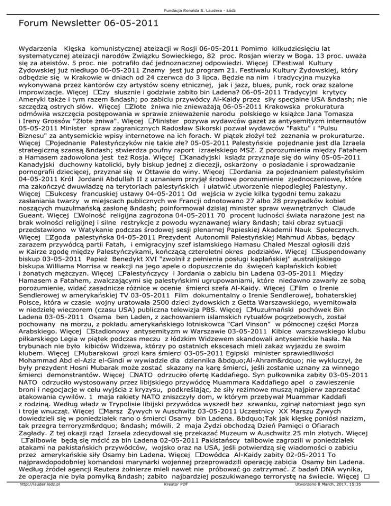 Fundacja Ronalda S. Laudera - Łódź Forum Newsletter 06-05-2011 Wydarzenia Klęska komunistycznej ateizacji w Rosji 06-05-2011 Pomimo kilkudziesięciu lat systematycznej ateizacji narodów Związku Sowieckiego, 82 proc. Rosjan wierzy w Boga. 13 proc. uważa się za ateistów. 5 proc. nie potrafiło dać jednoznacznej odpowiedzi. Więcej » Festiwal Kultury Żydowskiej już niedługo 06-05-2011 Znamy jest już program 21. Festiwalu Kultury Żydowskiej, który odbędzie się w Krakowie w dniach od 24 czerwca do 3 lipca. Będzie na nim i tradycyjna muzyka wykonywana przez kantorów czy artystów sceny etnicznej, jak i jazz, blues, punk, rock oraz szalone improwizacje. Więcej » Czy słusznie i godziwie zabito bin Ladena? 06-05-2011 Tradycyjni krytycy Ameryki także i tym razem – po zabiciu przywódcy Al-Kaidy przez siły specjalne USA – nie szczędzą ostrych słów. Więcej » Złote żniwa nie znieważają 06-05-2011 Krakowska prokuratura odmówiła wszczęcia postępowania w sprawie znieważenie narodu polskiego w książce Jana Tomasza i Ireny Grossów "Złote żniwa". Więcej » Minister pozywa wydawców gazet za antysemityzm internautów 05-05-2011 Minister spraw zagranicznych Radosław Sikorski pozwał wydawców "Faktu" i "Pulsu Biznesu" za antysemickie wpisy internetowe na ich forach. W piątek złożył też zeznania w prokuraturze. Więcej » Pojednanie Palestyńczyków nie takie złe? 05-05-2011 Palestyńskie pojednanie jest dla Izraela strategiczną szansą – stwierdza poufny raport izraelskiego MSZ. Z porozumienia między Fatahem a Hamasem zadowolona jest też Rosja. Więcej » Kanadyjski ksiądz przyznaje się do winy 05-05-2011 Kanadyjski duchowny katolicki, były biskup jednej z diecezji, oskarżony o posiadanie i sprowadzanie pornografii dziecięcej, przyznał się w Ottawie do winy. Więcej » Jordania za pojednaniem palestyńskim 04-05-2011 Król Jordanii Abdullah II z uznaniem przyjął środowe porozumienie zjednoczeniowe, które ma zakończyć dwuwładzę na terytoriach palestyńskich i ułatwić utworzenie niepodległej Palestyny. Więcej » Sukcesy francuskiej ustawy 04-05-2011 Od wejścia w życie kilka tygodni temu zakazu zasłaniania twarzy w miejscach publicznych we Francji odnotowano 27 albo 28 przypadków kobiet noszących muzułmańską zasłonę – poinformował dzisiaj minister spraw wewnętrznych Claude Gueant. Więcej » Wolność religijna zagrożona 04-05-2011 70 procent ludności świata narażone jest na brak wolności religijnej i silne restrykcje z powodu wyznawanej wiary – taki obraz sytuacji przedstawiono w Watykanie podczas środowej sesji plenarnej Papieskiej Akademii Nauk Społecznych. Więcej » Zgoda palestyńska 04-05-2011 Prezydent Autonomii Palestyńskiej Mahmud Abbas, będący zarazem przywódcą partii Fatah, i emigracyjny szef islamskiego Hamasu Chaled Meszal ogłosili dziś w Kairze zgodę między Palestyńczykami, kończącą czteroletni okres podziałów. Więcej » Suspendowany biskup 03-05-2011 Papież Benedykt XVI "zwolnił z pełnienia posługi kapłańskiej" australijskiego biskupa Williama Morrisa w reakcji na jego apele o dopuszczenie do święceń kapłańskich kobiet i żonatych mężczyzn. Więcej » Palestyńczycy i Jordania o zabiciu bin Ladena 03-05-2011 Między Hamasem a Fatahem, zwalczającymi się palestyńskimi ugrupowaniami, które niedawno zawarły ze sobą porozumienie, widać zasadnicze różnice w ocenie śmierci szefa Al-Kaidy. Więcej » Film o Irenie Sendlerowej w amerykańskiej TV 03-05-2011 Film dokumentalny o Irenie Sendlerowej, bohaterskiej Polsce, która w czasie wojny uratowała 2500 dzieci żydowskich z Getta Warszawskiego, wyemitowała w niedzielę wieczorem (czasu USA) publiczna telewizja PBS. Więcej » Muzułmański pochówek Bin Ladena 03-05-2011 Osama ben Laden, z zachowaniem islamskich rytuałów pogrzebowych, został pochowany na morzu, z pokładu amerykańskiego lotniskowca "Carl Vinson" w północnej części Morza Arabskiego. Więcej » Stadionowy antysemityzm w Warszawie 03-05-2011 Kibice warszawskiego klubu piłkarskiego Legia w piątek podczas meczu z łódzkim Widzewem skandowali antysemickie hasła. Na trybunach nie było kibiców Widzewa, którzy po ostatnich ekscesach mieli zakaz wyjazdu ze swoim klubem. Więcej » Mubarakowi grozi kara śmierci 03-05-2011 Egipski minister sprawiedliwości Mohammad Abd el-Aziz el-Gindi w wywiadzie dla dziennika „Al-Ahram” nie wykluczył, że były prezydent Hosni Mubarak może zostać skazany na karę śmierci, jeśli zostanie uznany za winnego śmierci demonstrantów. Więcej » NATO odrzuciło ofertę Kaddafiego. Syn pułkownika zabity 03-05-2011 NATO odrzuciło wystosowany przez libijskiego przywódcę Muammara Kaddafiego apel o zawieszenie broni i negocjacje w celu wyjścia z kryzysu, podkreślając, że siły reżimowe muszą najpierw zaprzestać atakowania cywilów. 1 maja rakiety NATO zniszczyły dom, w którym przebywał Muammar Kaddafi z rodziną. Według władz w Trypolisie libijski przywódca wyszedł bez szwanku, zginął natomiast jego syn i troje wnucząt. Więcej » Marsz Żywych w Auschwitz 03-05-2011 Uczestnicy XX Marszu Żywych dowiedzieli się w poniedziałek rano o śmierci Osamy bin Ladena. „Tak jak klęskę poniósł nazizm, tak przegra terroryzm” – mówili. 2 maja Żydzi obchodzą Dzień Pamięci o Ofiarach Zagłady. Z tej okazji rząd Izraela zdecydował się przekazać Muzeum w Auschwitz 25 mln złotych. Więcej » Talibowie będą się mścić za bin Ladena 02-05-2011 Pakistańscy talibowie zagrozili w poniedziałek atakami na pakistańskich przywódców, wojsko oraz na USA, jeśli potwierdzą się wiadomości o zabiciu przez amerykańskie siły Osamy bin Ladena. Więcej » Dowódca Al-Kaidy zabity 02-05-2011 To najprawdopodobniej komandosi marynarki wojennej przeprowadzili operację zabicia Osamy bin Ladena. Według źródeł agencji Reutera żołnierze mieli nawet nie próbować go zatrzymać. Z badań 