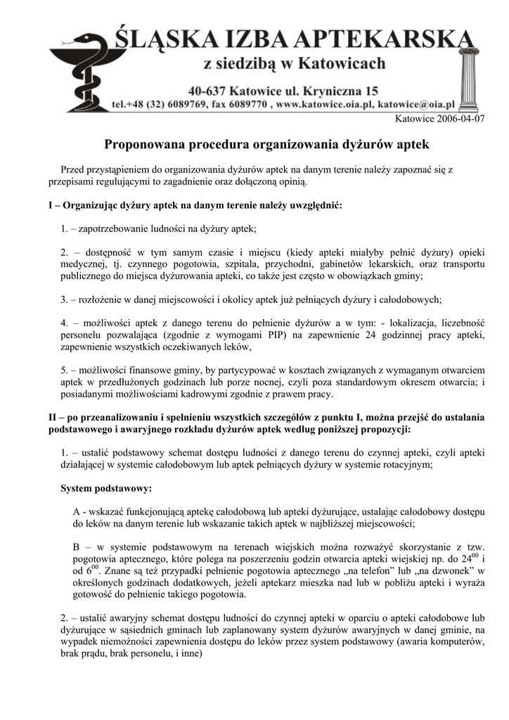 Katowice 2006-04-07 Proponowana procedura organizowania dyżurów aptek Przed przystąpieniem do organizowania dyżurów aptek na danym terenie należy zapoznać się z przepisami regulującymi to zagadnienie oraz dołączoną opinią. I – Organizując dyżury aptek na danym terenie należy uwzględnić: 1. – zapotrzebowanie ludności na dyżury aptek; 2. – dostępność w tym samym czasie i miejscu (kiedy apteki miałyby pełnić dyżury) opieki medycznej, tj. czynnego pogotowia, szpitala, przychodni, gabinetów lekarskich, oraz transportu publicznego do miejsca dyżurowania apteki, co także jest często w obowiązkach gminy; 3. – rozłożenie w danej miejscowości i okolicy aptek już pełniących dyżury i całodobowych; 4. – możliwości aptek z danego terenu do pełnienie dyżurów a w tym: - lokalizacja, liczebność personelu pozwalająca (zgodnie z wymogami PIP) na zapewnienie 24 godzinnej pracy apteki, zapewnienie wszystkich oczekiwanych leków, 5. – możliwości finansowe gminy, by partycypować w kosztach związanych z wymaganym otwarciem aptek w przedłużonych godzinach lub porze nocnej, czyli poza standardowym okresem otwarcia; i posiadanymi możliwościami kadrowymi zgodnie z prawem pracy. II – po przeanalizowaniu i spełnieniu wszystkich szczegółów z punktu I, można przejść do ustalania podstawowego i awaryjnego rozkładu dyżurów aptek według poniższej propozycji: 1. – ustalić podstawowy schemat dostępu ludności z danego terenu do czynnej apteki, czyli apteki działającej w systemie całodobowym lub aptek pełniących dyżury w systemie rotacyjnym; System podstawowy: A - wskazać funkcjonującą aptekę całodobową lub apteki dyżurujące, ustalając całodobowy dostępu do leków na danym terenie lub wskazanie takich aptek w najbliższej miejscowości; B – w systemie podstawowym na terenach wiejskich można rozważyć skorzystanie z tzw. pogotowia aptecznego, które polega na poszerzeniu godzin otwarcia apteki wiejskiej np. do 2400 i od 600. Znane są też przypadki pełnienie pogotowia aptecznego „na telefon” lub „na dzwonek” w określonych godzinach dodatkowych, jeżeli aptekarz mieszka nad lub w pobliżu apteki i wyraża gotowość do pełnienie takiego pogotowia. 2. – ustalić awaryjny schemat dostępu ludności do czynnej apteki w oparciu o apteki całodobowe lub dyżurujące w sąsiednich gminach lub zaplanowany system dyżurów awaryjnych w danej gminie, na wypadek niemożności zapewnienia dostępu do leków przez system podstawowy (awaria komputerów, brak prądu, brak personelu, i inne) System awaryjny: A - ustalić system awaryjnego dostępu do czynnej apteki w przypadku unieruchomienia apteki całodobowej lub niemożliwości dyżurowania przez aptekę wyznaczoną w systemie podstawowym; Zadanie takie należy zrealizować poprzez: 1 – wskazanie czynnych aptek w sąsiedniej miejscowości; 2 – ustalenie dodatkowego systemu przejmowania dyżuru w tej samej miejscowości: a - w przypadku funkcjonowania w systemie podstawowym apteki całodobowej należy dodatkowo rozpisać grafik awaryjnego podejmowania dyżurów przez pozostałe apteki, b - w przypadku funkcjonowania w systemie podstawowym grafika zmieniających się aptek dyżurnych, najlepiej ustalić konieczność awaryjnego przejęcia dyżuru przez aptekę kolejną lub najbliższą w grafiku, która może dyżur podjąć. Decyzję taką i wyznaczenie dyżuru awaryjnego powinna koordynować wyznaczona osoba w gminie. Apteka, która z jakiś przyczyn wypadła z kolejki dyżurów może następnie dany dyżur podjąć w zastępstwie apteki, która za nią dyżur przejęła – szczegóły do ustaleń indywidualnych lokalnie 3 – ustalenie możliwości uruchomienia przez koordynatora z gminy większej ilości aptek dyżurujących w przypadkach szczególnej konieczności, która by polegała na uruchomieniu dyżurów w tylu aptekach ile uzna za konieczne koordynator. III – System przepływu informacji o aptekach zapewniających całodobowy dostęp do leków oraz koordynacja dyżurów. System informacyjny powinna koordynować wyznaczona/e osoby w gminie. Dane personalne tych „Koordynatorów dyżurów aptek” oraz ich kontakt telefoniczny i miejsca urzędowania powinny zostać podane przy wszystkich informacjach związanych z dyżurami. W tym celu należy: 1 – możliwie najszerzej rozpropagować informacje zarówno o aptekach całodobowych / dyżurujących, jak i godzinach otwarcia pozostałych aptek, podając dodatkowo adresy i numery telefonów aptek. W tym celu należy wykorzystać powtarzanie i stałe aktualizowanie tych informacji w: a - lokalnych mediach; b - stronach internetowych urzędów, Wojewódzkiego Inspektora Farmaceutycznego, Izby Aptekarskiej; c – miejscach związanych z ochroną zdrowia – pogotowie, szpital, przychodnie, itp.; d - stała informacja o aktualnie czynnych aptekach powinna się znaleźć obowiązkowo w witrynie lub innym widocznym miejscu wszystkich okolicznych aptek. 2 – gmina powinna zapewnić aktualną informację o dyżurach aptek w danym roku a także wszystkie pojawiające się w tym zakresie zmiany z pełnym grafikiem zawierającym daty, adresy i telefony dla: a – wszystkich aptek; b – jednostek związanych z ochroną zdrowia – pogotowia, szpitale przychodnie, itp. 3 – gmina powinna koordynować i być odpowiedzialna za wprowadzanie awaryjnego systemu dostępu do leków poprzez przekazanie informacji o nagłych zmianach czynnych aptek informując miejscową ludność i wszystkie jednostki udostępniające i korzystające z tych informacji: a – apteki; b - lokalne media; c – jednostki związane z ochrona zdrowia – pogotowie, szpital, przychodnie, itp. d - Wojewódzkiego Inspektora Farmaceutycznego, Izbę Aptekarską; IV – Ważne informacje dodatkowe Chcąc wprowadzić dobry i sprawnie funkcjonujący system dostępu do leków dla lokalnej ludności należy starać się ustalić go w sposób satysfakcjonuj