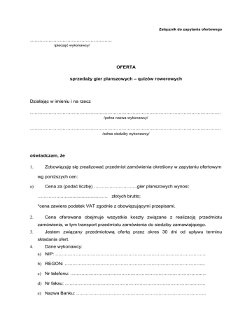 Załącznik do zapytania ofertowego …………………………………………….. /pieczęć wykonawcy/ OFERTA sprzedaży gier planszowych – quizów rowerowych Działając w imieniu i na rzecz …………………………………………………………………………………………………………… /pełna nazwa wykonawcy/ …………………………………………………………………………………………………………… /adres siedziby wykonawcy/ oświadczam, że 1. Zobowiązuję się zrealizować przedmiot zamówienia określony w zapytaniu ofertowym wg poniższych cen: a) Cena za (podać liczbę) ……………………….gier planszowych wynosi: …………….............................…… złotych brutto; *cena zawiera podatek VAT zgodnie z obowiązującymi przepisami. 2. Cena oferowana obejmuje wszystkie koszty związane z realizacją przedmiotu zamówienia, w tym transport przedmiotu zamówienia do siedziby zamawiającego. 3. Jestem związany przedmiotową ofertą przez okres 30 dni od upływu terminu składania ofert. 4. Dane wykonawcy: a) NIP: ……………………………………………………………………………………. b) REGON: …………………………………………………………………………….... c) Nr telefonu: ……….………………………………………………………………...… d) Nr faksu: ………………………………………………………………………..…….. e) Nazwa Banku: …………………………………………………………………….….. f) Nr konta: …………………………………………………………………………….... g) E-mail: ………………………………………………………………………………… 5. Spełniam warunki udziału w postępowaniu, określone w art. 22 ust. 1 ustawy z dnia 29 stycznia 2004 r. Prawo zamówień publicznych (t.j. Dz. U. z 2015 r. poz. 2164) oraz nie podlegam wykluczeniu z art. 24 ust. 1 wskazanej ustawy. ………………………………………….. miejscowość, data ……………………………………………… podpis osoby uprawnionej