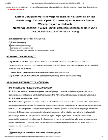 10.11.2015 bzp1.portal.uzp.gov.pl/index.php?ogloszenie=show&pozycja=163423&rok=20151110 Adres strony internetowej, na której Zamawiający udostępnia Specyfikację Istotnych Warunków Zamówienia: www.zoz.kielce.pl Kielce: Usługa kompleksowego ubezpieczenia Samodzielnego Publicznego Zakładu Opieki Zdrowotnej Ministerstwa Spraw Wewnętrznych w Kielcach Numer ogłoszenia: 163423 2015; data zamieszczenia: 10.11.2015 OGŁOSZENIE O ZAMÓWIENIU usługi Zamieszczanie ogłoszenia: obowiązkowe. Ogłoszenie dotyczy: V zamówienia publicznego zawarcia umowy ramowej ustanowienia dynamicznego systemu zakupów (DSZ) SEKCJA I: ZAMAWIAJĄCY I. 1) NAZWA I ADRES: Samodzielny Publiczny Zakład Opieki Zdrowotnej Ministerstwa Spraw Wewnętrznych w Kielcach , ul. Wojska Polskiego 51, 25375 Kielce, woj. świętokrzyskie, tel. 41 3493500, 3493521, faks 41 3493505. Adres strony internetowej zamawiającego: www.zzoz.kielce.ids.pl I. 2) RODZAJ ZAMAWIAJĄCEGO: Samodzielny publiczny zakład opieki zdrowotnej. SEKCJA II: PRZEDMIOT ZAMÓWIENIA II.1) OKREŚLENIE PRZEDMIOTU ZAMÓWIENIA II.1.1) Nazwa nadana zamówieniu przez zamawiającego: Usługa kompleksowego ubezpieczenia Samodzielnego Publicznego Zakładu Opieki Zdrowotnej Ministerstwa Spraw Wewnętrznych w Kielcach. II.1.2) Rodzaj zamówienia: usługi. II.1.4) Określenie przedmiotu oraz wielkości lub zakresu zamówienia: Zamówienie zostało podzielone na następujące części (pakiety). Zamawiający dopuszcza możliwość złożenia oferty na dowolną liczbę pakietów. PAKIET I 1. Obowiązkowe ubezpieczenie odpowiedzialności cywilnej podmiotu wykonującego działalność leczniczą 2. Dobrowolne ubezpieczenie odpowiedzialności cywilnej z tytułu prowadzonej działalności i posiadanego mienia 3. Ubezpieczenie mienia od ognia i innych żywiołów 4. Ubezpieczenie szyb i przedmiotów szklanych od stłuczenia 5. Ubezpieczenie mienia od kradzieży z włamaniem i rabunku oraz ryzyka dewastacji 6. Ubezpieczenie sprzętu elektronicznego w systemie wszystkich ryzyk PAKIET II 1. Ubezpieczenia komunikacyjne. II.1.5) V przewiduje się udzielenie zamówień uzupełniających: http://bzp1.portal.uzp.gov.pl/index.php?ogloszenie=show&pozycja=163423&rok=20151110 1/5 10.11.2015 bzp1.portal.uzp.gov.pl/index.php?ogloszenie=show&pozycja=163423&rok=20151110 Określenie przedmiotu oraz wielkości lub zakresu zamówień uzupełniających 1. Zamawiający przewiduje możliwość zawarcia w okresie trwania umowy zamówień uzupełniających. Zamówienia uzupełniające udzielane będą w trybie zamówień z wolnej ręki, po spełnieniu przesłanek z art. 67 ust.1 pkt 6 ustawy Prawo zamówień publicznych. 2. Wykonawca, któremu zostanie udzielone zamówienie podstawowe, zobowiązany będzie do zastosowania w zamówieniach uzupełniających stawek nie wyższych niż zastosowane w zamówieniu podstawowym oraz kalkulowania składki w systemie pro rata temporis o ile przedmiot zamówienia, zakres i warunki były wskazane w zamówieniu podstawowym. II.1.6) Wspólny Słownik Zamówień (CPV): 66.51.00.008. II.1.7) Czy dopuszcza się złożenie oferty częściowej: tak, liczba części: 2. II.1.8) Czy dopuszcza się złożenie oferty wariantowej: nie. II.2) CZAS TRWANIA ZAMÓWIENIA LUB TERMIN WYKONANIA: Okres w miesiącach: 24. SEKCJA III: INFORMACJE O CHARAKTERZE PRAWNYM, EKONOMICZNYM, FINANSOWYM I TECHNICZNYM III.1) WADIUM Informacja na temat wadium: nie dotyczy III.2) ZALICZKI III.3) WARUNKI UDZIAŁU W POSTĘPOWANIU ORAZ OPIS SPOSOBU DOKONYWANIA OCENY SPEŁNIANIA TYCH WARUNKÓW III. 3.1) Uprawnienia do wykonywania określonej działalności lub czynności, jeżeli przepisy prawa nakładają obowiązek ich posiadania Opis sposobu dokonywania oceny spełniania tego warunku Zamawiający uzna warunek za spełniony, jeżeli Wykonawca wykaże, iż posiada zezwolenie na wykonywanie działalności ubezpieczeniowej, o którym mowa w Ustawie z dnia 22 maja 2003 r. o działalności ubezpieczeniowej (tekst jednolity Dz. U. z 2013 r. poz. 950 z późn. zm.), a w przypadku gdy rozpoczął on działalność przed wejściem w życie Ustawy z dnia 28 lipca 1990 r. o działalności ubezpieczeniowej (Dz. U. Nr 59, poz. 344 ze zm.) zaświadczenie Ministra Finansów o posiadaniu zgody na wykonywanie działalności ubezpieczeniowej III.3.2) Wiedza i doświadczenie Opis sposobu dokonywania oceny spełniania tego warunku Zamawiający uzna warunek za spełniony, jeżeli Wykonawca złoży oświadczenie o spełnianiu tego warunku. III.3.3) Potencjał techniczny Opis sposobu dokonywania oceny spełniania tego warunku Zamawiający uzna warunek za spełniony, jeżeli Wykonawca złoży oświadczenie o spełnianiu tego warunku. http://bzp1.portal.uzp.gov.pl/index.php?ogloszenie=show&pozycja=163423&rok=20151110 2/5 10.11.2015 bzp1.portal.uzp.gov.pl/index.php?ogloszenie=show&pozycja=163423&rok=20151110 III.3.4) Osoby zdolne do wykonania zamówienia Opis sposobu dokonywania oceny spełniania tego warunku Zamawiający uzna warunek za spełniony, jeżeli Wykonawca złoży oświadczenie o spełnianiu tego warunku. III.3.5) Sytuacja ekonomiczna i finansowa Opis sposobu dokonywania oceny spełniania tego warunku Zamawiający uzna warunek za spełniony, jeżeli Wykonawca złoży oświadczenie o spełnianiu tego warunku. III.4) INFORMACJA O OŚWIADCZENIACH LUB DOKUMENTACH, JAKIE MAJĄ DOSTARCZYĆ WYKONAWCY W CELU POTWIERDZENIA SPEŁNIANIA WARUNKÓW UDZIAŁU W POSTĘPOWANIU ORAZ NIEPODLEGANIA WYKLUCZENIU NA PODSTAWIE ART. 24 UST. 1 USTAWY III.4.1) W zakresie wykazania spełniania przez wykonawcę warunków, o których mowa w art. 22 ust. 1 ustawy, oprócz oświadczenia o spełnianiu warunków udziału w postępowaniu należy przedłożyć: potwierdzenie posiadania uprawnień do wykonywania określonej działalności lub czynności, jeżeli przepisy prawa nakładają obowiązek ich posiadania, w szczególności koncesje, zezwolenia lub licencje; III.4.2) W zakresie potwierdzenia niepodlegania wykluczeniu na podstawie art. 24 u