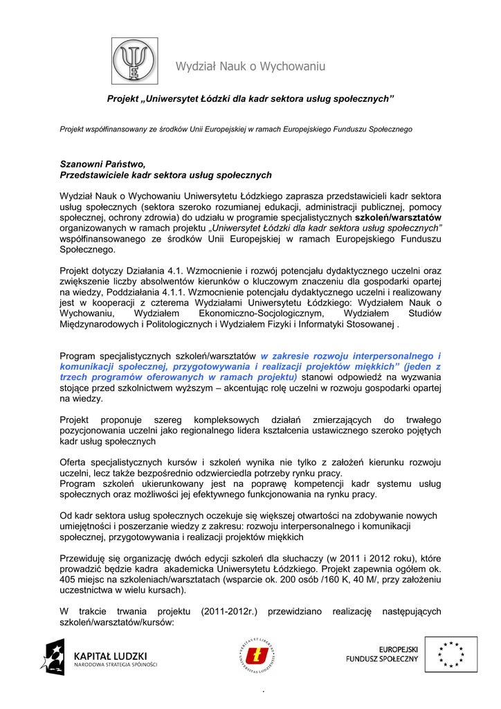 Wydział Nauk o Wychowaniu Projekt „Uniwersytet Łódzki dla kadr sektora usług społecznych” Projekt współfinansowany ze środków Unii Europejskiej w ramach Europejskiego Funduszu Społecznego Szanowni Państwo, Przedstawiciele kadr sektora usług społecznych Wydział Nauk o Wychowaniu Uniwersytetu Łódzkiego zaprasza przedstawicieli kadr sektora usług społecznych (sektora szeroko rozumianej edukacji, administracji publicznej, pomocy społecznej, ochrony zdrowia) do udziału w programie specjalistycznych szkoleń/warsztatów organizowanych w ramach projektu „Uniwersytet Łódzki dla kadr sektora usług społecznych” współfinansowanego ze środków Unii Europejskiej w ramach Europejskiego Funduszu Społecznego. Projekt dotyczy Działania 4.1. Wzmocnienie i rozwój potencjału dydaktycznego uczelni oraz zwiększenie liczby absolwentów kierunków o kluczowym znaczeniu dla gospodarki opartej na wiedzy, Poddziałania 4.1.1. Wzmocnienie potencjału dydaktycznego uczelni i realizowany jest w kooperacji z czterema Wydziałami Uniwersytetu Łódzkiego: Wydziałem Nauk o Wychowaniu, Wydziałem Ekonomiczno-Socjologicznym, Wydziałem Studiów Międzynarodowych i Politologicznych i Wydziałem Fizyki i Informatyki Stosowanej . Program specjalistycznych szkoleń/warsztatów w zakresie rozwoju interpersonalnego i komunikacji społecznej, przygotowywania i realizacji projektów miękkich” (jeden z trzech programów oferowanych w ramach projektu) stanowi odpowiedź na wyzwania stojące przed szkolnictwem wyższym – akcentując rolę uczelni w rozwoju gospodarki opartej na wiedzy. Projekt proponuje szereg kompleksowych działań zmierzających do trwałego pozycjonowania uczelni jako regionalnego lidera kształcenia ustawicznego szeroko pojętych kadr usług społecznych Oferta specjalistycznych kursów i szkoleń wynika nie tylko z założeń kierunku rozwoju uczelni, lecz także bezpośrednio odzwierciedla potrzeby rynku pracy. Program szkoleń ukierunkowany jest na poprawę kompetencji kadr systemu usług społecznych oraz możliwości jej efektywnego funkcjonowania na rynku pracy. Od kadr sektora usług społecznych oczekuje się większej otwartości na zdobywanie nowych umiejętności i poszerzanie wiedzy z zakresu: rozwoju interpersonalnego i komunikacji społecznej, przygotowywania i realizacji projektów miękkich Przewiduję się organizację dwóch edycji szkoleń dla słuchaczy (w 2011 i 2012 roku), które prowadzić będzie kadra akademicka Uniwersytetu Łódzkiego. Projekt zapewnia ogółem ok. 405 miejsc na szkoleniach/warsztatach (wsparcie ok. 200 osób /160 K, 40 M/, przy założeniu uczestnictwa w wielu kursach). W trakcie trwania projektu szkoleń/warsztatów/kursów: (2011-2012r.) przewidziano . realizację następujących Wydział Nauk o Wychowaniu Projekt „Uniwersytet Łódzki dla kadr sektora usług społecznych” Projekt współfinansowany ze środków Unii Europejskiej w ramach Europejskiego Funduszu Społecznego 1. Szkolenie/warsztaty „Identyfikacja i pomiar zdolności twórczych dzieci i młodzieży” (32h) I edycja – 2011 – termin szkolenia 21-22 lutego 28 lutego-1 marca 2011 r. 2. Kurs/warsztaty„Wychowanie przez sport. Warsztaty dla nauczycieli” (w II gr) (30h), I edycja – 2011 – termin szkolenia - 11-12, 18-19 kwietnia 2011 r. 3. Szkolenie/warsztaty „Pozyskiwanie środków unijnych na działania w sektorze usług społecznych” (w II grupy) (30 h) I edycja – 2011 – termin szkolenia 7-8;14-15,21-22,28-29 maj 2011 r. 4. Szkolenie/warsztaty „Trening interpersonalny” (30h) I edycja – 2011 – termin szkolenia 23-24, 30-31 maja 2011 r. 5. Szkolenie „Zasoby jako kategoria diagnostyki psychopedagogicznej środowisk wychowawczych” (32 h) I edycja – 2011 – termin szkolenia 20-21, 27-28 czerwca 2011 r. 6. Szkolenie/warsztaty „Diagnozowanie specjalnych potrzeb (konstruowania indywidualnych programów nauczania)” (30h) I edycja – 2011 – termin szkolenia 6-7, 13-14 czerwca 2011 r. edukacyjnych 7. Szkolenie/warsztaty „Trening kreatywności w rozwoju osobistym” (32h) I edycja – 2011 – termin szkolenia 5-6, 12-13 września 2011 r. 8. Szkolenie/warsztaty „Podejścia mediacyjne w działaniu społecznym” (32h) I edycja – 2011 – termin szkolenia 19-20,26-27 września 2011 r. 9. Szkolenie/warsztaty „Programy profilaktyki uzależnień” (30 h) I edycja – 2011 – termin szkolenia - 10-11, 17-18 października 2011 r. 10. Szkolenie/warsztaty „Ewaluacja w projektach” (32h) I edycja – 2011 – termin szkolenia 19-20, 26-27 listopada 2011 r. 11. Szkolenie/warsztaty Twórcze rozwiązywanie problemów społecznych (32h) I edycja – 2011 – termin szkolenia 14-15.listopada; 5-6 grudnia 2011 r.; 12. Szkolenie/Warsztaty emisji głosu (32h) I edycja – 2011 – termin szkolenia 12-13, 19-20 grudnia 2011 r. Termin składania aplikacji zawiera ramowy program szkolenia. Uczestniczką/uczestnikiem szkolenia może zostać osoba (spoza społeczności akademickiej) zatrudniona w szeroko pojętym sektorze usług społecznych (edukacji, pomocy społecznej, administracji publicznej, ochronie zdrowia) zainteresowana pogłębianiem swojej wiedzy i podwyższaniem kwalifikacji. Zgodnie z założeniami projektu preferowane będą: . Wydział Nauk o Wychowaniu Projekt „Uniwersytet Łódzki dla kadr sektora usług społecznych” Projekt współfinansowany ze środków Unii Europejskiej w ramach Europejskiego Funduszu Społecznego a) kobiety (działania wyrównujące, wspierające równość płci, które będą służyły poprawie sytuacji kobiet na rynku pracy); b) osoby w wieku 45+; c) osoby, które brały udział/ deklarujące udział w wielu formach wsparcia oferowanych w ramach projektu (min. w jednej edycji szkoleń lub praktyk). Tych z Państwa, których zainteresowała powyższa oferta szkoleniowa prosimy o zapoznanie się z regulaminem szkoleń/warsztatów/kursów i dopełnienie wszelkich formalności (wypełnienie