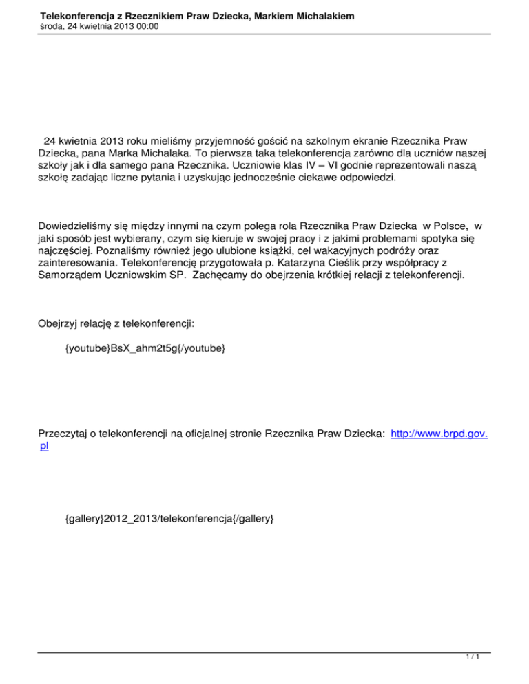 Dziecka, pana Marka Michalaka. To pierwsza taka telekonferencja zarówno dla uczniów naszej