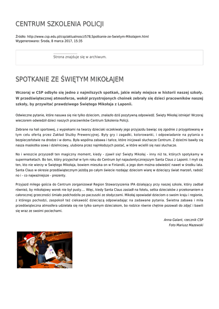 CENTRUM SZKOLENIA POLICJI Źródło: http://www.csp.edu.pl/csp/aktualnosci/578,Spotkanie-ze-Swietym-Mikolajem.html Wygenerowano: Środa, 8 marca 2017, 15:35 Strona znajduje się w archiwum. SPOTKANIE ZE ŚWIĘTYM MIKOŁAJEM Wczoraj w CSP odbyło się jedno z najmilszych spotkań, jakie miały miejsce w historii naszej szkoły. W przedświątecznej atmosferze, wokół przystrojonych choinek zebrały się dzieci pracowników naszej szkoły, by przywitać prawdziwego Świętego Mikołaja z Laponii. Odwieczne pytanie, które nasuwa się nie tylko dzieciom, znalazło dziś pozytywną odpowiedź. Święty Mikołaj istnieje! Wczoraj wieczorem odwiedził dzieci naszych pracowników Centrum Szkolenia Policji. Zebrane na hali sportowej, z wypiekami na twarzy dzieciaki oczekiwały jego przyjazdu bawiąc się zgodnie z przygotowaną w tym celu ofertą przez Zakład Służby Prewencyjnej. Były gry i zagadki, kolorowanki, i odpowiadanie na pytania o bezpieczeństwie na drodze i w domu. Była wspólna zabawa i tańce, które inicjowali słuchacze Centrum. Z dziećmi bawiły się nasza maskotka sowa i dzielnicowy, ulubiona przez najmłodszych postać, w które wcielili się nasi słuchacze. No i wreszcie przyszedł ten magiczny moment, kiedy - zjawił się! Święty Mikołaj - inny niż te, których spotykamy w supermarketach. Bo ten, który przyjechał w tym roku do Centrum był najautentyczniejszym Santa Claus z Laponii. I myli się ten, kto nie wierzy w Świętego Mikołaja, bowiem mieszka on w Finlandii, a jego dom można odwiedzić nawet w środku lata. Santa Claus w okresie przedświątecznym jeżdżą po całym świecie rozdając dzieciom wiarę w dziecięcy świat marzeń, radość no i - co najważniejsze - prezenty. Przyjazd miłego gościa do Centrum zorganizował Region Stowarzyszenia IPA działający przy naszej szkole, który zadbał również, by mikołajowy worek nie był pusty.… Więc, kiedy Santa Claus zasiadł na fotelu, setka dzieciaków z przekonaniem o całorocznej grzeczności śmiało podchodziła po paczuszki ze słodyczami. Mikołaj opowiadał dzieciom o swoim kraju i regionie, z którego pochodzi, zaspokoił też ciekawość dziecięcą odpowiadając na zadawane pytania. Świetna zabawa i miła przedświąteczna atmosfera udzielała się nie tylko samym dzieciakom, bo rodzice równie chętnie pozowali do zdjęć i bawili się wraz ze swoimi pociechami. Anna Galant, rzecznik CSP Foto Mariusz Mazewski Ocena: 0/5 (0) Tweetnij