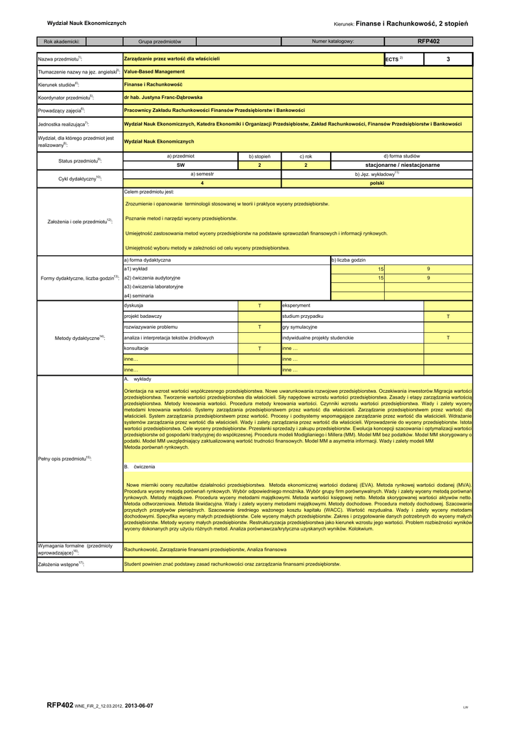 Kierunek: Finanse Wydział Nauk Ekonomicznych Rok akademicki: RFP402 Numer katalogowy: Grupa przedmiotów Nazwa przedmiotu1): i Rachunkowość, 2 stopień 3 ECTS 2) Zarządzanie przez wartość dla właścicieli 3) Tłumaczenie nazwy na jęz. angielski : Value-Based Management Kierunek studiów4): Finanse i Rachunkowość Koordynator przedmiotu5): 6) Prowadzący zajęcia : 7) dr hab. Justyna Franc-Dąbrowska Pracownicy Zakładu Rachunkowości Finansów Przedsiębiorstw i Bankowości Jednostka realizująca : Wydział Nauk Ekonomicznych, Katedra Ekonomiki i Organizacji Przedsiębiostw, Zakład Rachunkowości, Finansów Przedsiębiorstw i Bankowości Wydział, dla którego przedmiot jest realizowany8): Wydział Nauk Ekonomicznych Status przedmiotu9): a) przedmiot b) stopień c) rok d) forma studiów SW 2 2 stacjonarne / niestacjonarne Cykl dydaktyczny10): a) semestr b) Jęz. wykładowy11) 4 polski Celem przedmiotu jest: Zrozumienie i opanowanie terminologii stosowanej w teorii i praktyce wyceny przedsiębiorstw. Założenia i cele przedmiotu12): Poznanie metod i narzędzi wyceny przedsiębiorstw. Umiejętność zastosowania metod wyceny przedsiębiorstw na podstawie sprawozdań finansowych i informacji rynkowych. Umiejętność wyboru metody w zależności od celu wyceny przedsiębiorstwa. a) forma dydaktyczna b) liczba godzin a1) wykład Formy dydaktyczne, liczba godzin13): a2) ćwiczenia audytoryjne 15 9 15 9 a3) ćwiczenia laboratoryjne a4) seminaria dyskusja T projekt badawczy rozwiazywanie problemu Metody dydaktyczne14): T analiza i interpretacja tekstów źródłowych konsultacje eksperyment studium przypadku indywidualne projekty studenckie T T inne … inne… inne … inne… inne … A. T gry symulacyjne wykłady Orientacja na wzrost wartości współczesnego przedsiębiorstwa. Nowe uwarunkowania rozwojowe przedsiębiorstwa. Oczekiwania inwestorów.Migracja wartości przedsiębiorstwa. Tworzenie wartości przedsiębiorstwa dla właścicieli. Siły napędowe wzrostu wartości przedsiębiorstwa. Zasady i etapy zarządzania wartością przedsiębiorstwa. Metody kreowania wartości. Procedura metody kreowania wartości. Czynniki wzrostu wartości przedsiębiorstwa. Wady i zalety wyceny metodami kreowania wartości. Systemy zarządzania przedsiębiorstwem przez wartość dla właścicieli. Zarządzanie przedsiębiorstwem przez wartość dla właścicieli. System zarządzania przedsiębiorstwem przez wartość. Procesy i podsystemy wspomagające zarządzanie przez wartość dla właścicieli. Wdrażanie systemów zarządzania przez wartość dla właścicieli. Wady i zalety zarządzania przez wartość dla właścicieli. Wprowadzenie do wyceny przedsiębiorstw. Istota wartości przedsiębiorstwa. Cele wyceny przedsiębiorstw. Przesłanki sprzedaży i zakupu przedsiębiorstw. Ewolucja koncepcji szacowania i optymalizacji wartości przedsiębiorstw od gospodarki tradycyjnej do współczesnej. Procedura modeli Modiglianiego i Millera (MM). Model MM bez podatków. Model MM skorygowany o podatki. Model MM uwzględniający zaktualizowaną wartość trudności finansowych. Model MM a asymetria informacji. Wady i zalety modeli MM Metoda porównań rynkowych. Pełny opis przedmiotu15): B. ćwiczenia Nowe mierniki oceny rezultatów działalności przedsiębiorstwa. Metoda ekonomicznej wartości dodanej (EVA). Metoda rynkowej wartości dodanej (MVA). Procedura wyceny metodą porównań rynkowych. Wybór odpowiedniego mnożnika. Wybór grupy firm porównywalnych. Wady i zalety wyceny metodą porównań rynkowych. Metody majątkowe. Procedura wyceny metodami majątkowymi. Metoda wartości księgowej netto. Metoda skorygowanej wartości aktywów netto. Metoda odtworzeniowa. Metoda likwidacyjna. Wady i zalety wyceny metodami majątkowymi. Metody dochodowe. Procedura metody dochodowej. Szacowanie przyszłych przepływów pieniężnych. Szacowanie średniego ważonego kosztu kapitału (WACC). Wartość rezydualna. Wady i zalety wyceny metodami dochodowymi. Specyfika wyceny małych przedsiębiorstw. Cele wyceny małych przedsiębiorstw. Zakres i przygotowanie danych potrzebnych do wyceny małych przedsiębiorstw. Metody wyceny małych przedsiębiorstw. Restrukturyzacja przedsiębiorstwa jako kierunek wzrostu jego wartości. Problem rozbieżności wyników wyceny dokonanych przy użyciu różnych metod. Analiza porównawcza/krytyczna uzyskanych wyników. Kolokwium. Wymagania formalne (przedmioty wprowadzające)16): 17) Założenia wstępne : Rachunkowość, Zarządzanie finansami przedsiębiorstw, Analiza finansowa Student powinien znać podstawy zasad rachunkowości oraz zarządzania finansami przedsiębiorstw. RFP402 WNE_FiR_2_12.03.2012, 2013-06-07 LW Kierunek: Finanse Wydział Nauk Ekonomicznych 01 - umie formułować problemy w obszarze wyceny przedsiębiorstw i Rachunkowość, 2 stopień 05 - umie współpracować w grupie, przygotowując wycenę przedsiębiorstw poznanymi metodami 02 - umie wybrać odpowiednie metody wyceny przedsiębiorstw Efekty kształcenia18): (z kolejnymi numerami, 01, 02, 03 itd.) 03 - umie zastosować poznane metody wyceny przedsiębiorstw 04 - umie krytycznie weryfikować metody wyceny przedsiębiorstw kolokwium na zajęciach ćwiczeniowych Sposób weryfikacji efektów kształcenia19): ocena wykonanie zadania projektowego na zdefiniowany temat praca pisemna przygotowywana w ramach pracy własnej studenta ocena wynikająca z obserwacji w trakcie zajęć ocena eksperymentów wykonywanych w trakcie zajęć przygotowanie zespołowej analizy zdefiniowanego problemu ocena wystąpień i prezentacji w trakcie zajęć 01, 02, 03, 04, 05 egzamin pisemny test komputerowy egzamin ustny inne.. konsultacje inne.. okresowe prace pisemne Forma dokumentacji osiągniętych efektów kształcenia 20): 01, 02, 03, 04, 05 01, 02, 03, 04, 05 imienne karty oceny studenta T złożone projekty treść pytań egzaminacyjnych z oceną kolokwium na zajęciach ćwiczeniowych lista obecności i aktywnoś
