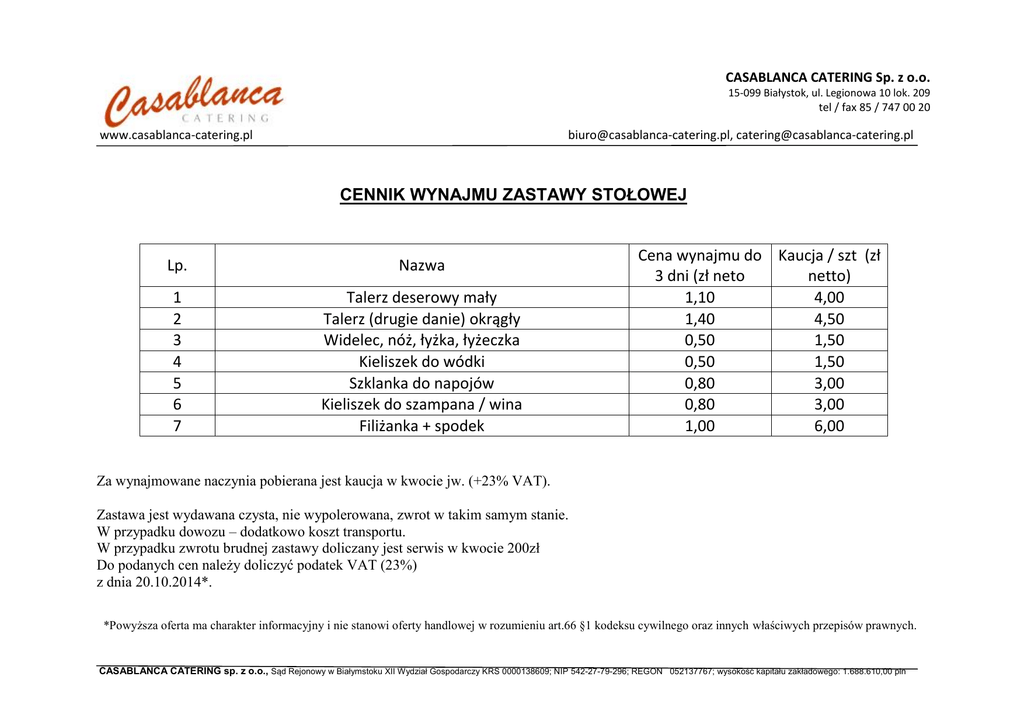 CASABLANCA CATERING Sp. z o.o. 15-099 Białystok, ul. Legionowa 10 lok. 209 tel / fax 85 / 747 00 20 www.casablanca-catering.pl [email protected], [email protected] CENNIK WYNAJMU ZASTAWY STOŁOWEJ Lp. Nazwa 1 2 3 4 5 6 7 Talerz deserowy mały Talerz (drugie danie) okrągły Widelec, nóż, łyżka, łyżeczka Kieliszek do wódki Szklanka do napojów Kieliszek do szampana / wina Filiżanka + spodek Cena wynajmu do Kaucja / szt (zł 3 dni (zł neto netto) 1,10 4,00 1,40 4,50 0,50 1,50 0,50 1,50 0,80 3,00 0,80 3,00 1,00 6,00 Za wynajmowane naczynia pobierana jest kaucja w kwocie jw. (+23% VAT). Zastawa jest wydawana czysta, nie wypolerowana, zwrot w takim samym stanie. W przypadku dowozu – dodatkowo koszt transportu. W przypadku zwrotu brudnej zastawy doliczany jest serwis w kwocie 200zł Do podanych cen należy doliczyć podatek VAT (23%) z dnia 20.10.2014*. *Powyższa oferta ma charakter informacyjny i nie stanowi oferty handlowej w rozumieniu art.66 §1 kodeksu cywilnego oraz innych właściwych przepisów prawnych. CASABLANCA CATERING sp. z o.o., Sąd Rejonowy w Białymstoku XII Wydział Gospodarczy KRS 0000138609; NIP 542-27-79-296; REGON 052137767; wysokość kapitału zakładowego: 1.688.610,00 pln