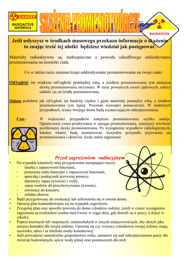 Jeśli usłyszysz w środkach masowego przekazu informacje o skaŜeniu to znając treść tej ulotki będziesz wiedział jak postępować. Materiały radioaktywne są, niebezpieczne z powodu szkodliwego oddziaływania promieniowania na komórki ciała. Co w takim razie minima1izuje oddziaływanie promieniowania na twoje ciało: Od1egłość im większa od1egłość pomiędzy tobą, a źródłem promieniowania tym mniejszą dawkę promieniowania otrzymasz. W razie powaŜnych awarii jądrowych, naleŜy oddalić się od źródła promieniowania. Osłona podobnie jak od1egłość im bardziej cięŜkie i gęste materiały pomiędzy tobą, a źródłem promieniowania tym lepiej. Pozostań wewnątrz pomieszczeń. W niektórych przypadkach, ściany twojego domu będą wystarczającym zabezpieczeniem. Czas - W większości przypadków natęŜenie promieniowania szybko maleje. Ograniczenie czasu przebywania w zasięgu promieniowania, zmniejszy wie1kość pochłoniętej dawki promieniowania. Po wystąpieniu wypadków radiologicznych, lokalne władze będą monitorować wszystkie przypadki pojawienia się promieniowania i okreś1ać, kiedy minie zagroŜenie. Przed zagroŜeniem radiacyjnym • • • • • • Na wypadek katastrofy miej przygotowane następujące rzeczy: latarkę z zapasowymi bateriami, przenośne radio bateryjne z zapasowymi bateriami, apteczkę i podręcznik pierwszej pomocy, alarmowy zapas Ŝywności i wody, zapas worków do przechowywania Ŝywności, otwieracz do konserw, solidne obuwie. Bądź przygotowany do ewakuacji lub schronienia się w swoim domu. Opracuj plan komunikowania się na wypadek zagroŜenia. Przygotuj plan oraz sposoby powrotu do domu członków rodziny, jeŜeli w czasie wystąpienia zagroŜenia są rozdzieleni (realna moŜ1iwość w ciągu dnia, gdy dorośli są w pracy, a dzieci w szkole). Poproś krewnych lub znajomych, zamieszkałych w innych miejscowościach, aby słuŜyli jako miejsce kontaktu dla twojej rodziny. Upewnij się czy wszyscy członkowie twojej rodziny znają nazwisko, adres i nr telefonu osoby kontaktowej. Jeśli prowadzisz samodzielne gospodarstwo rolne, zastanów się nad zabezpieczeniem paszy dla zwierząt hodowlanych, ujście wody pitnej oraz pomieszczeń dla nich W czasie zagroŜenia radiacyjnego Zachowaj spokój: nie kaŜdy wypadek, związany z wydostaniem się substancji promieniotwórczej jest dla ciebie niebezpieczny, wypadek moŜe dotyczyć tylko terenu zakładu (elektrowni atomowej) i moŜe nie powodować Ŝadnych zagroŜeń zewnętrznych. UwaŜnie i stale słuchaj radia, og1ądaj telewizję krajową, lub loka1ną. Komunikaty okreś1ają charakter wypadku, stopień zagroŜenia oraz jego zasięg i szybkość rozprzestrzeniania się wykonaj zalecenia wynikające z komunikatów. Gdy powracasz do miejsca schronienia z zewnątrz: weź prysznic, zmień buty i odzieŜ, schowaj rzeczy noszone na zewnątrz do plastikowej torby i szczelnie je zamknij. JeŜe1i otrzymasz polecenie ewakuacji wykonuj je niezwłocznie, według zaleceń władz (słuŜb ratowniczych): nasłuchuj w radiu i telewizji komunikatów o drogach ewakuacji, tymczasowych schronach i sposobach postępowania, zabierz przygotowane na ewakuację rzeczy. Pamiętaj o swoich sąsiadach, którzy mogą potrzebować specjalnej pomocy przy małych dzieciach, starszych tub niepełnosprawnych osobach. W wypadku zaniechania ewakuacji, pozostań w domu: zabezpiecz i pozamykaj okna i drzwi, wyłącz klimatyzację, wentylację, ogrzewanie nawiewowe itp., miej przy sobie cały czas włączone radio bateryjne, zamknij (uszczelnij) zasuwy piecowe i kominowe, udaj się do piwnicy tub innych pomieszczeń, poniŜej powierzchni gruntu, pozostań wewnątrz pomieszczeń do czasu, aŜ władze (słuŜby ratownicze) ogłoszą, ze jest juŜ bezpiecznie, jeŜ1i musisz wyjść na zewnątrz, zakryj usta i nos mokrym ręcznikiem. Bądź przygotowany do ewakuacji tub schronienia się na dłuŜszy czas w swoim domu. Ukryj inwentarz i nakarm go przechowaną, w zamknięciu paszą. Nie uŜywaj telefonu, jeŜe1i nie jest to konieczne. Linie telefoniczne są, niezbędne dla akcji ratowniczej. Przechowuj Ŝywność w szczelnych pojemnikach tub lodówce: nie zabezpieczoną Ŝywność, przed schowaniem dokładnie opłucz, zrezygnuj ze spoŜywania owoców, warzyw i wody z niepewnych źródeł. Dalej postępuj, zgodnie z zaleceniami okreś1onymi przez władze (słuŜby ratownicze) do czasu odwołania zagroŜenia skaŜeniem promieniotwórczym. Po odwołaniu zagroŜenia radiacyjnego Opuść ukrycie i w razie najmniejszych podejrzeń o skaŜeniu poddaj siebie i rodzinę zabiegom sanitarnym. Unikaj spoŜywania Ŝywności z twojego ogrodu oraz mleka od twoich krów i kóz, dopóki nie będą, zbadane przez lokalny urząd sanitarny. W przypadku zarządzenia ewakuacji zabierz ze sobą najcenniejsze rzeczy, odzieŜ, dokumenty i produkty Ŝywnościowe. Zabezpiecz mieszkanie.