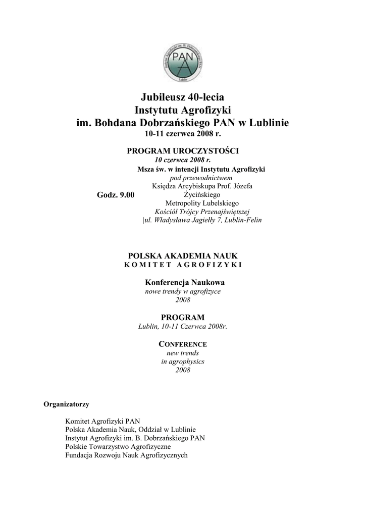 Jubileusz 40-lecia Instytutu Agrofizyki im. Bohdana Dobrzańskiego PAN w Lublinie 10-11 czerwca 2008 r. PROGRAM UROCZYSTOŚCI 10 czerwca 2008 r. Msza św. w intencji Instytutu Agrofizyki pod przewodnictwem Księdza Arcybiskupa Prof. Józefa Życińskiego Godz. 9.00 Metropolity Lubelskiego Kościół Trójcy Przenajświętszej |ul. Władysława Jagiełły 7, Lublin-Felin POLSKA AKADEMIA NAUK KOMITET AGROFIZYKI Konferencja Naukowa nowe trendy w agrofizyce 2008 PROGRAM Lublin, 10-11 Czerwca 2008r. CONFERENCE new trends in agrophysics 2008 Organizatorzy Komitet Agrofizyki PAN Polska Akademia Nauk, Oddział w Lublinie Instytut Agrofizyki im. B. Dobrzańskiego PAN Polskie Towarzystwo Agrofizyczne Fundacja Rozwoju Nauk Agrofizycznych Komitet Organizacyjny Prof. Bohdan Dobrzański Jr. FRNA – Przewodniczący Prof. Krystyna Konstankiewicz, KA PAN, – Vice Przewodniczący Prof. Jerzy Lipiec, IA PAN, – Vice Przewodniczący Dr Rafał Rybczyński, IA PAN, Lublin – Sekretarz Dr Wanda Woźniak, IA PAN, Lublin Mgr Jarosław Grodek, IA PAN, Lublin Komitet Naukowy Prof. Stanisław Nawrocki, czł. rzecz. PAN – Przewodniczący Prof. Stanisław Grundas, IA PAN, Lublin – Vice Przewodniczący Prof. Tadeusz Kęsik, AR Lublin – Sekretarz Prof. Jiří Blahovec, Praga, Czechy Prof. Winfried E.H. Blum, Dr. h.c. czł. zagr. PAN, Wiedeń, Austria Prof. Tomasz Brandyk, czł. koresp. PAN Prof. Aleksander Brzóstowicz, AR Szczecin Prof. Bohdan Dobrzański Jr., KA PAN, Lublin Prof. Ryszard Dębicki, UMCS, Lublin Prof. Tadeusz Filipek, KGiChR PAN, Lublin Prof. Józef Fornal, IRZiBŻ PAN, Olsztyn Prof. Zbigniew Gertych, czł. rzecz. PAN Prof. Jan Gliński, czł. rzecz. PAN Prof. Andrzej Grzywacz, czł. rzecz. PAN Prof. Janusz Haman, czł. rzecz. PAN Prof. Józef Horabik, IA PAN, Lublin Prof. Rainer Horn, CAU, Kiel, Niemcy Prof. Viktor P. Yakushev, IA RAAS, St. Petersburg, Russia Prof. Seweryn Kukuła, IUNG, Puławy Prof. Krystyna Konstankiewicz, IA PAN Prof. Rudolf Michałek, czł. rzecz. PAN Prof. Josef Pecen, Praga, Czechy Prof. Stanisław Przestalski, czł. Hon. KA PAN, Wrocław Prof. Antoni Rutkowski, czł. rzecz. PAN Prof. Naoki Sakurai, Higashi Hiroshima, Japonia Prof. Piotr Skłodowski, PTG, Warszawa Prof. Wolodymyr Snitynskyj, UR, Lwów, Ukraina Prof. Stanisław Sosnowski, WSI-E, Ropczyce Prof. Bogusław Szot, Prezes PTA, Lublin Prof. Zbigniew Ślipek, AR Kraków Prof. Zdzisław Targoński, UP Lublin Prof. Marian Truszczyński, czł. rzecz. PAN Prof. Edward Żurawicz, KNO PAN, Skierniewice Wtorek 10.06.2008 800-1500 Rejestracja Uczestników (IA PAN Lublin, ul. Doświadczalna 4) Część I - Part I (in Polish) 900-1330 Jubileusz 40-lecia Instytutu Agrofizyki im. Bohdana Dobrzańskiego PAN Jubilee of the 40th anniversary of B. Dobrzański Institute of Agrophysics PAS 30 00 13 -15 Obiad – Lunch Dworek Ziemiański UP w Lublinie – University of Life Sciences in Lublin – Felin Część II – Part II (in English) Conference – new trends in agrophysics 2008 00 15 Opening ceremony of Plenary Session of the Agrophysics 15 -15 Committee PAS Prof Stanisław Nawrocki, member of PAS – Chairman of Scientific Committee - Past President of Agrophysics Committee PAS Prof Bohdan Dobrzański Jr – Chairman of Organising Committee - President of Agrophysics Committee PAS 1515-1645 Plenary Session (Keynotes Papers) prof. Rainer Horn – Chairman prof. Jiří Blahovec – Co-Chairman 15 45 Winfried E.H. Blum – Agrophysics and environmental quality 15 -15 – New research concepts for bridging between science and decision making 45 15 Rainer Horn – Agrophysical research – an interdisciplinary 15 -16 approach to quantify boundary conditions for landuse systems 15 45 Naoki Sakurai – Quality evaluation of agricultural products by 16 -16 an acoustic vibration method 45 00 16 -17 Coffee Break – Kawa - Herbata 1700-1830 Oral Session prof. Felix Moreno – Chairman prof. Viliam Novak – Co-Chairman 00 15 17 -17 Blahovec J.: Water equilibrium in agroproducts 1715-1730 Novák V.: Biomass production: how to relate it to soil water regime ? 30 45 Moreno F., López-Garrido R., López M.V., Madejón E., 17 -17 Murillo J.M.: Soil aggregation under conservation tillage in semiarid rainfed agriculture (SW Spain) 45 00 Surin V.G., Lykova N.A.: Field spectrometry in model 17 -18 experiments for the precision agriculture 00 15 Vozárová V., Hlaváčová Z.: Investigation of biological 18 -18 materials physical properties in the frame of agrophysical research on Slovak University of Agriculture in Nitra 15 30 Gryaznov A. Y., Potrakhov E. N., Potrakhov N. N.: Mobile 18 -18 x-ray diagnostic system for quality assurance of grain and seeds 30 45 Balashov E., Dabek-Szreniawska M., Matseiczyk K.: Effects 18 -18 of different management practices on water-stable aggregation and its contribution to N2O emission from a loamy sand Orthic Luvisol 1900-2200 Welcome party – Uroczysta kolacja Dworek Ziemiański UP w Lublinie – University of Life Sciences in Lublin – Felin Środa 11.06.2008 900-1000 900- 930 930-1000 1000-1030 1030-1200 1030-1045 1045-1100 1100-1115 1115-1130 1130-1145 1145-1200 1200-1210 1200-1300 1230-1500 1300-1500 1300-1320 1320-1340 Część III - Part III (in Polish) Konferencja – nowe trendy w agrofizyce 2008 SESJA PLENARNA (Wykłady zamawiane) Prof. Josef Pecen – Przewodniczący Prof. Stanisław Grundas – V-ce Przewodniczący Victor P. Yakushev – Agrophysics for information support of high agrotechnologies Grzegorz Józefaciuk – New trends in agrophysics Kawa - Herbata – przygotowanie posterów SESJA REFERATOWA Prof. Victor P. Yakushev – Przewodniczący Prof. Józef Horabik – V-ce Przewodniczący Miedziejko E.: Termodynamiczne wskaźniki zrównoważonego wykorzystania zasobów środowiska Skierucha W., Wilczek A., Lamorski K., Sławiński C.: Aparatura pomiarowa i oprogramowanie w systemie monitorowania wilgotności, temperatury i zasolenia gleby w Poleskim Parku Narodowym Usowicz B., Marczew