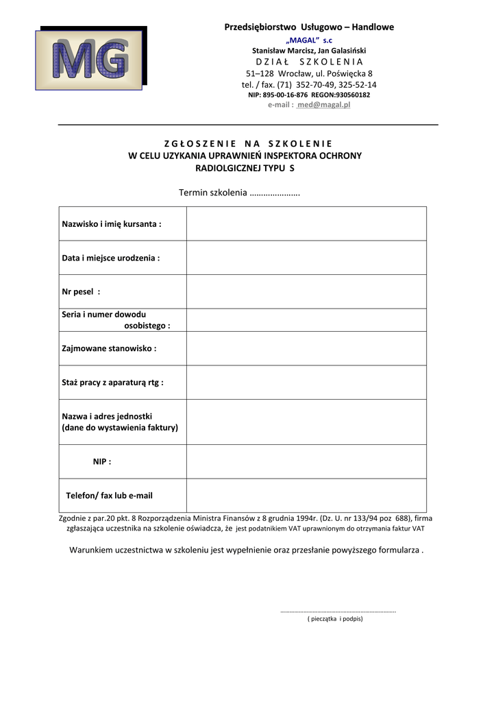 Przedsiębiorstwo Usługowo – Handlowe „MAGAL” s.c Stanisław Marcisz, Jan Galasiński DZIAŁ SZKOLENIA 51–128 Wrocław, ul. Poświęcka 8 tel. / fax. (71) 352-70-49, 325-52-14 NIP: 895-00-16-876 REGON:930560182 e-mail : [email protected] ZGŁOSZENIE NA SZKOLENIE W CELU UZYKANIA UPRAWNIEŃ INSPEKTORA OCHRONY RADIOLGICZNEJ TYPU S Termin szkolenia …………………. Nazwisko i imię kursanta : Data i miejsce urodzenia : Nr pesel : Seria i numer dowodu osobistego : Zajmowane stanowisko : Staż pracy z aparaturą rtg : Nazwa i adres jednostki (dane do wystawienia faktury) NIP : Telefon/ fax lub e-mail Zgodnie z par.20 pkt. 8 Rozporządzenia Ministra Finansów z 8 grudnia 1994r. (Dz. U. nr 133/94 poz 688), firma zgłaszająca uczestnika na szkolenie oświadcza, że jest podatnikiem VAT uprawnionym do otrzymania faktur VAT Warunkiem uczestnictwa w szkoleniu jest wypełnienie oraz przesłanie powyższego formularza . ………………………………….…………………………….. ( pieczątka i podpis)